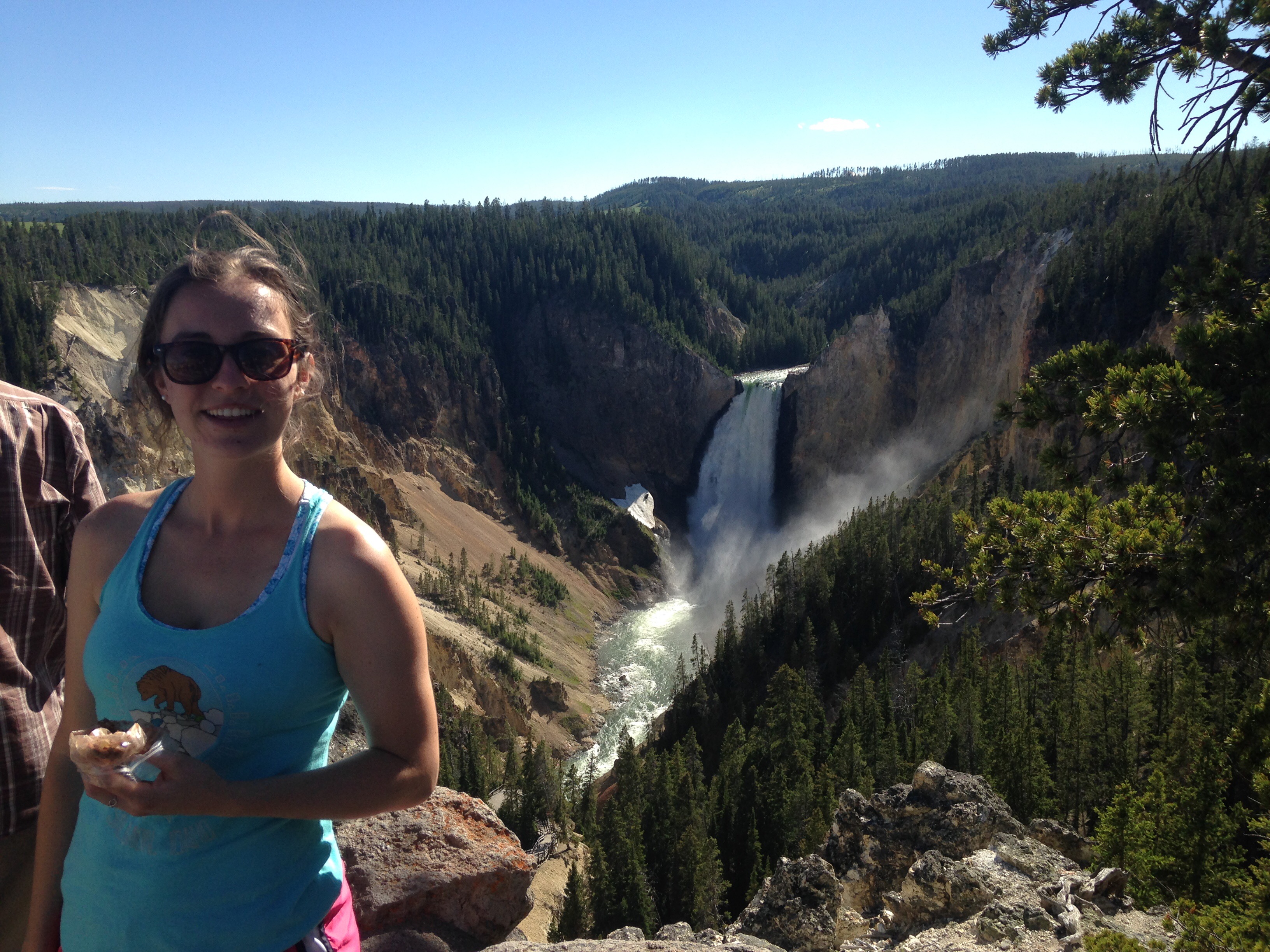 After that, we drove to Bunsen Peak trailhead for the hike. Before we started, we saw a warning sign posted on the trailhead signalling that a mama grizzly and her two cubs had been spotted nearby and we should be on the lookout. To signify the severity, the trail across the street was closed. But YOLO, right? Two other groups happened to be in the parking lot, and we decided to join forces to fight the bear. Instead of doing Bunsen Peak, we Β chose to do Osprey Falls, a 9.2 mile hike that traversed to a beautiful waterfall. Small world. The first family happened to be from Leesburg, VA – where Jared is from! The second couple was from San Francisco, previously from Baltimore, MD. The first family peaced out early, but we went on with the San Franciscan couple. They were awesome! After three miles of moderate hiking, we hit some major switchbacks and descended a total of 800 feet to the waterfall. Amanda and I almost died but the boys were trucking ahead, no fear at all. I would argue the climb back up was easier because we didn’t have to worry about sliding off the mountain! About 5PM we were almost back to the car when GUESS WHAT HAPPENED. We SAW THE FREAKING MAMA GRIZZLY BEAR. We were about a mile out minding our business when Amanda spotted her about 100 yards to the left of the trail, playing in the grass with her cubs. She abruptly sat up and fixated her eyes on us (cue me peeing myself). We slowly began to back up and talk loudly in order to assert our position. Next comes the most tense thirty seconds of my life – does she walk towards us or turn away? Thank goodness, she decided we weren’t tasty enough to eat and she hit the road towards the woods. We decided to wait ten minutes just to give her a head start so that we wouldn’t have any surprises. During that time, I figured it would be a good idea to test out my bear spray to make sure that it worked. DO NOT DO THIS WHEN THE WIND IS BLOWING TOWARDS YOU. I almost choked Jared and myself, but at least I figured out that we would be temporarily protected from Mama Bear. After about a ten minute wait, we began walking towards the parking lot and thank goodness, once we reached the open, we saw Mama and company about 500 yards across a stream. PHEW! Video will be coming shortly. One of our fellow hiking companions managed to capture a video of the ordeal and we’re waiting to receive it.