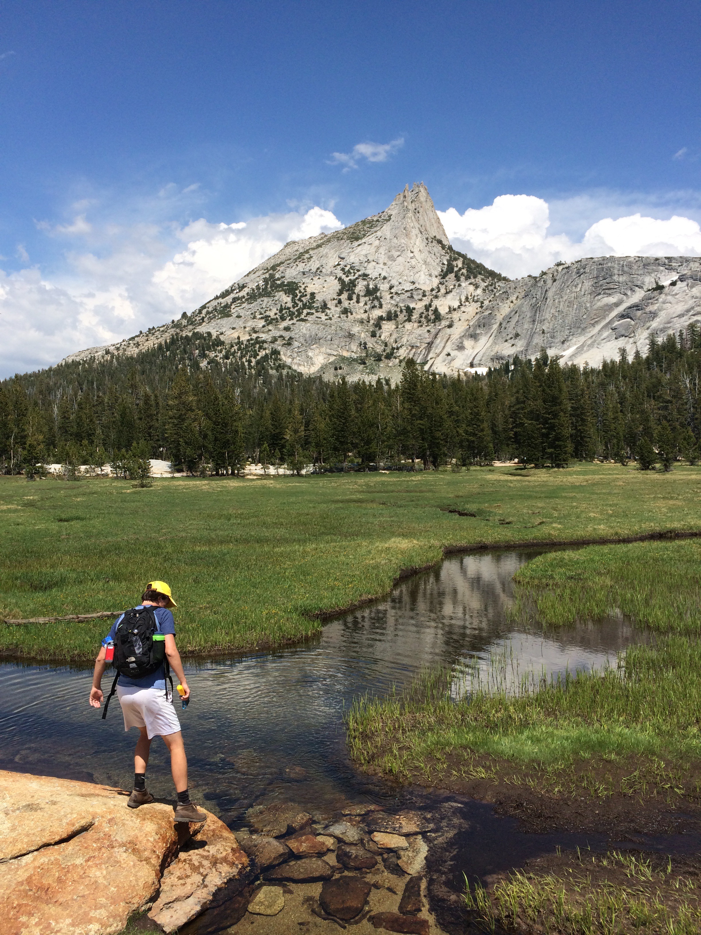 The next day, we left earlyish to get to a hike we wanted to do, Cathedral Lakes. Holy crap that was a workout. Seven to twelve miles, no one really knows. We estimate that it was somewhere around 10 miles out and back. Probably the hardest hike either of us had done. We estimate that we climbed a total of 1000 feet in elevation change, and when you’re already hiking at 9000 feet in altitude to begin with, it’s not easy. The ascent was super hard but the view was all worth it. It dropped us off into a meadow with winding streams and a beautiful mountain backdrop, and we had to climb over a short hill to see the alpine lake. It was blue, big and surrounded by trees. That was the Lower Lakes – there was an Upper Lakes, but between the exhaustion and mosquito bites, we decided not to trek the extra 1 mile round trip.