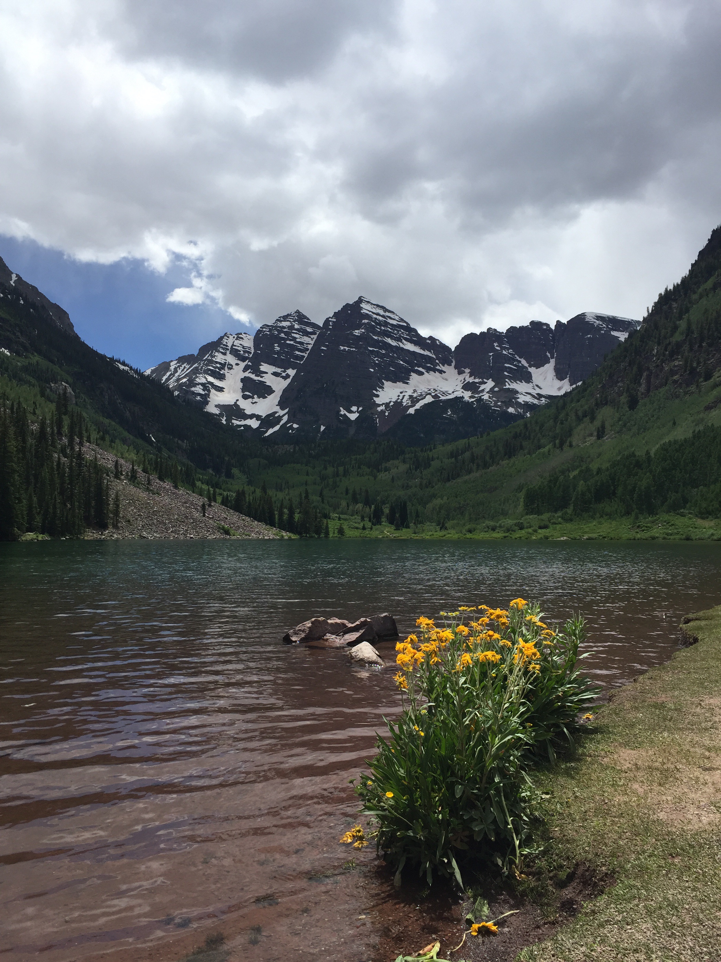 For those who don’t know, Maroon Bells is probably “the” hike people think of when Colorado is mentioned. (But who knows, I don’t live here – yet). The trailhead is located a few miles outside of Aspen. In order to access it, you can drive your car to the trailhead either before 8am or after 5pm. If you’re not an early bird, then you’re not out of luck. We had to go to the Aspen Highland Ski Area and purchase $6 tickets for an 8 mile bus ride to the start of the hike. It was a nice ride because the bus driver gave us basically a tour of the 8 mile expanse we passed. We learned that Aspen was the first town west of the Mississippi to get electricity, and they used to be big silver producers. We also learned about avalanches and passed a petting zoo with a llama named the Dolly Llama (haha). Once we got to the drop off, it was basically a short stroll to Maroon Lake. Words cannot describe how serene and beautiful the spot was. We were in a meadow with wildflowers, an alpine lake and two twin snow-covered peaks rising in the background (the Maroon Bells).