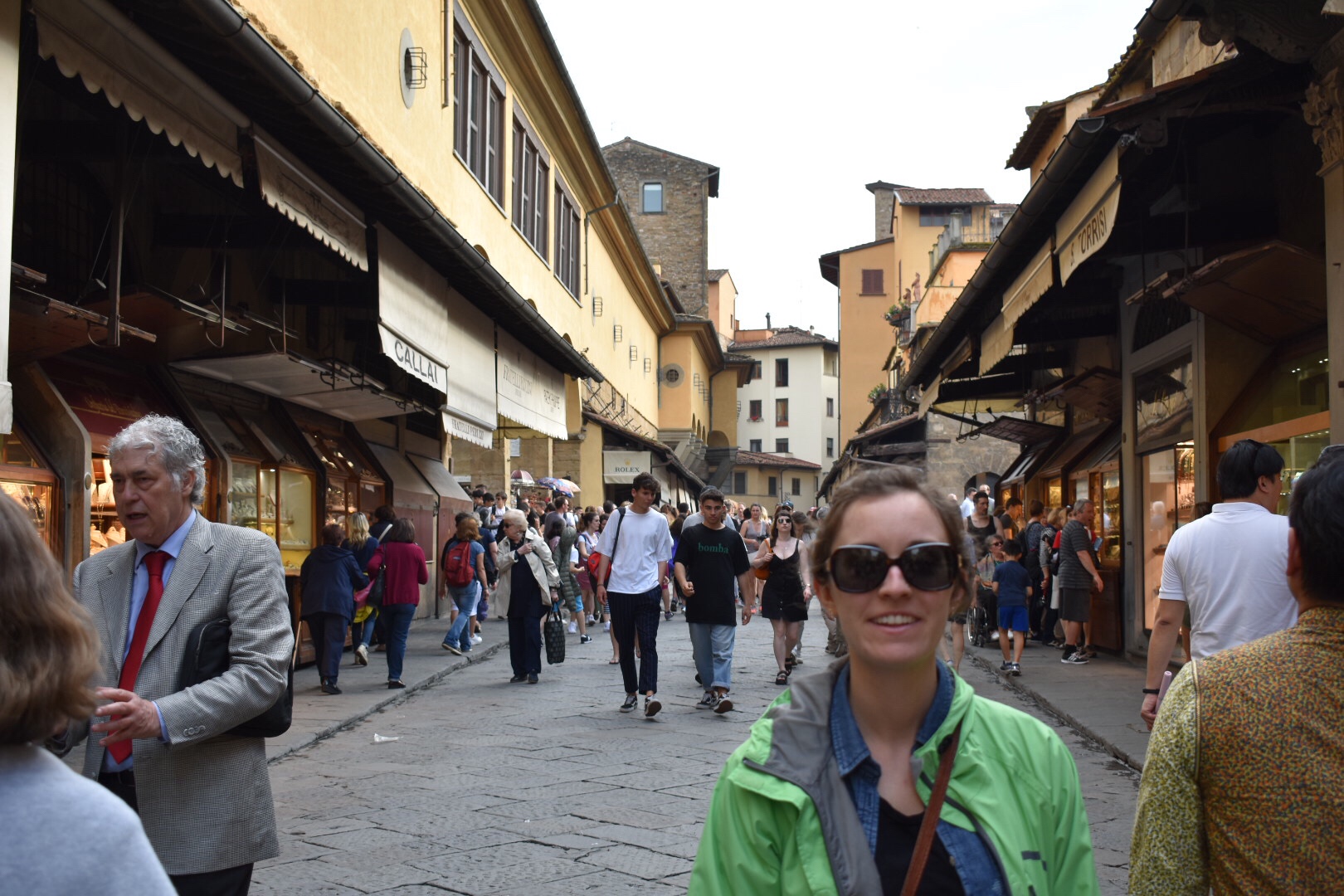 Once we started walking into the city, we could see the difference from Rome – the streets were less crowded, the drivers were actually polite (at least a little bit more) and the colors of the buildings were all fit for Tuscany – an inviting array of yellows, browns, macaroni and cheese-ish yellows. It didn’t take long for us to intersect the river, and from there we could see our first target spot – Ponte Vecchio. The bridge is over 700 years old, and it’s unique because on the bridge are many stores selling rather expensive jewelry, mostly gold. If there are two things I know about Florence, it’s that it’s famous for selling leather and gold.