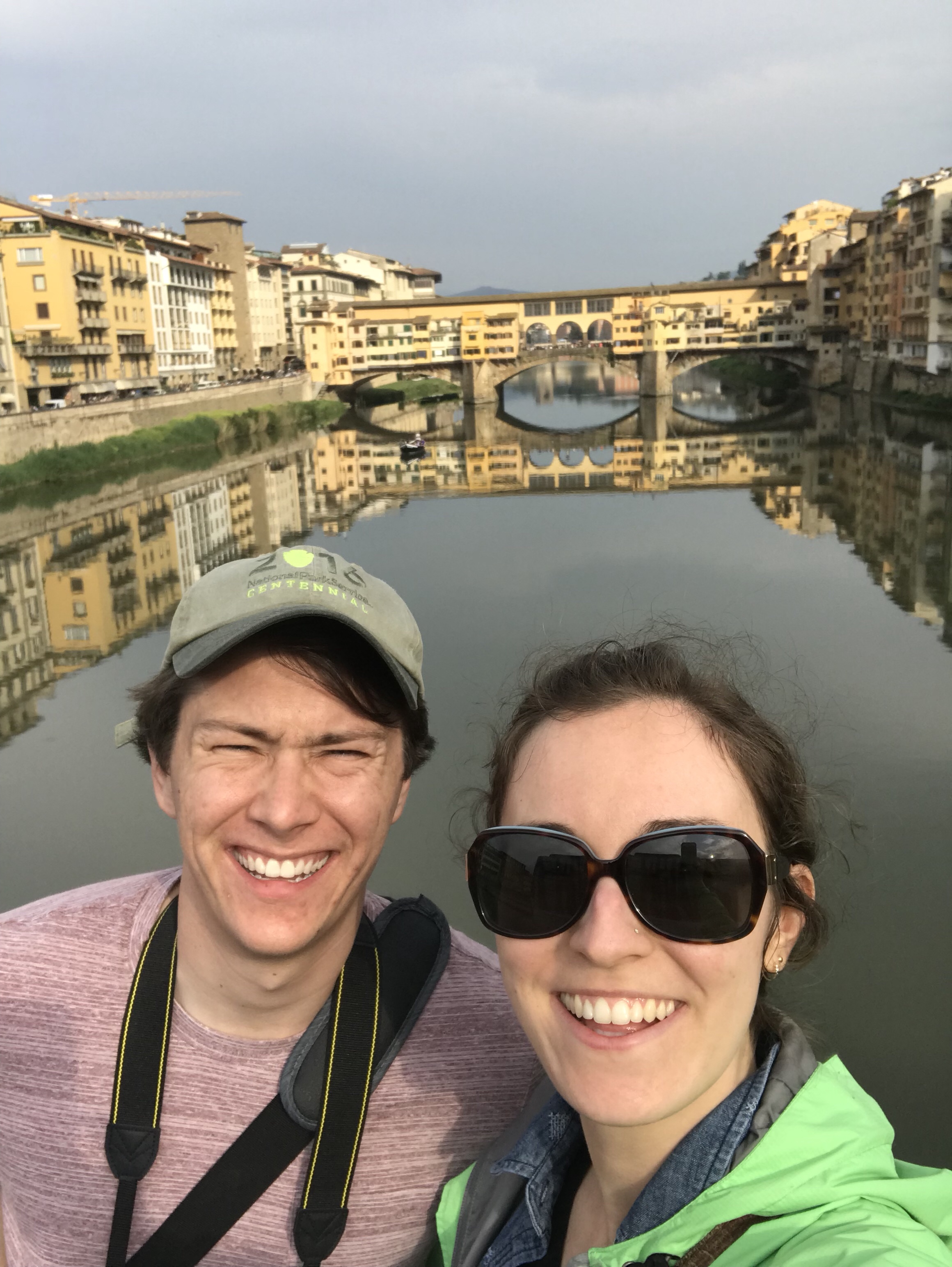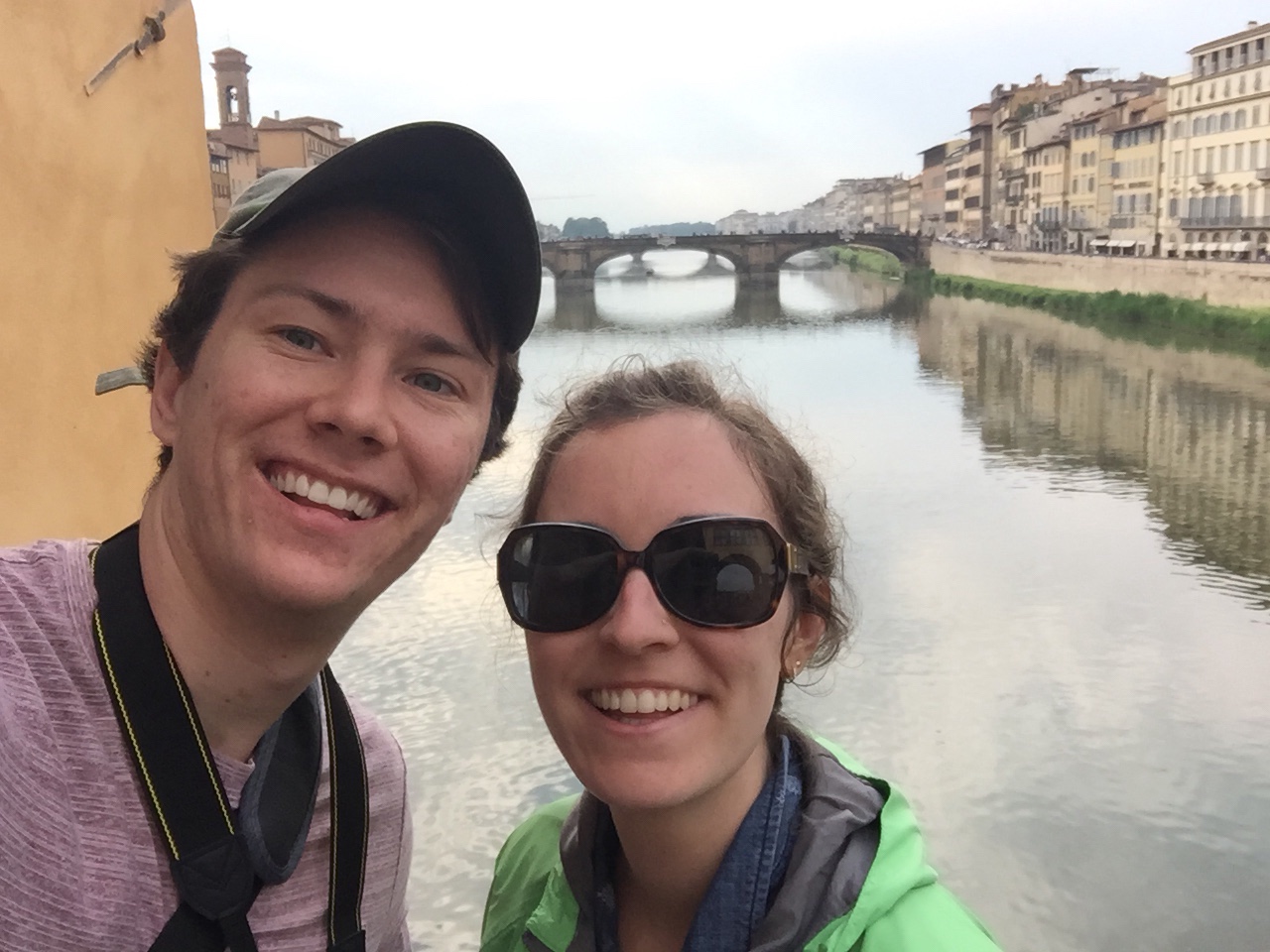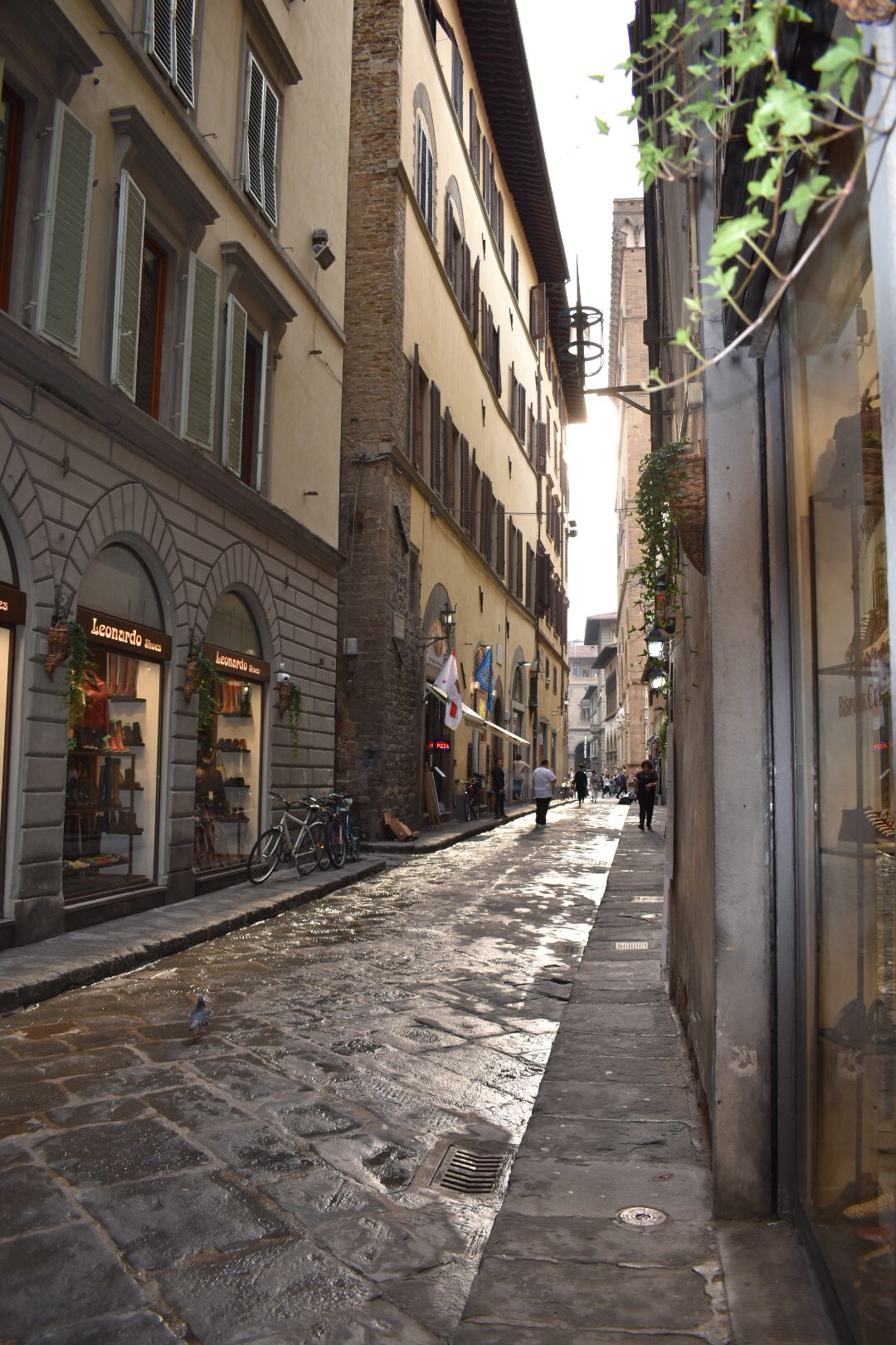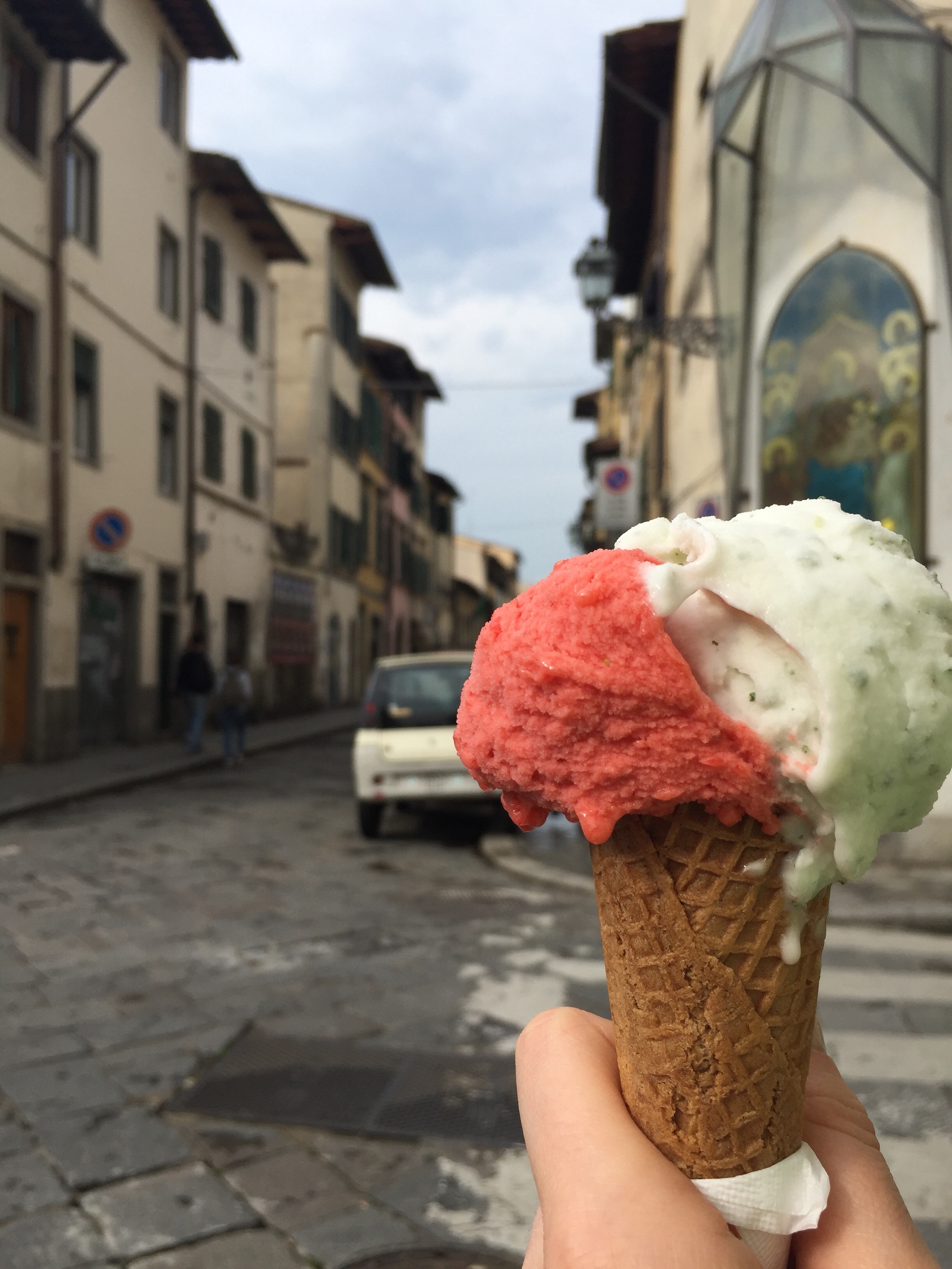 Unfortunately, since we only had two days to explore, it was a bit of a rush to see the highlights. We arrived in Florence mid-afternoon on Monday and parked our rental car about two kilometers from Ponte Vecchio, giving us plenty of time to walk and admire the city. No closer than 200 meters from our car was a Sorbeteria, selling the best frozen treat I’d ever tasted, and I’ve tasted a lot of gelato and sorbet. I got two scoops, one of lemon sage and the other wild strawberries. It was so good I almost couldn’t share with Jared.