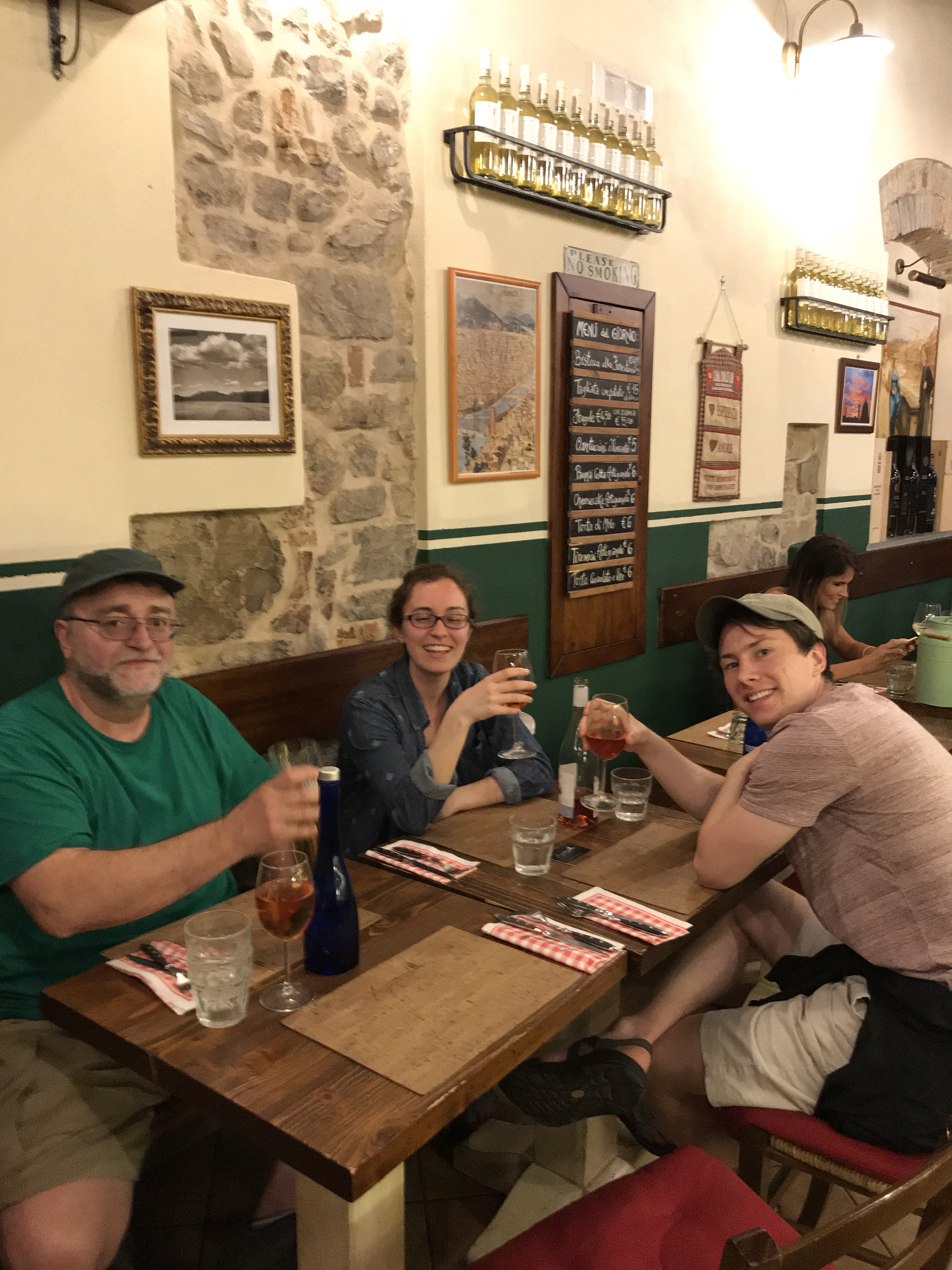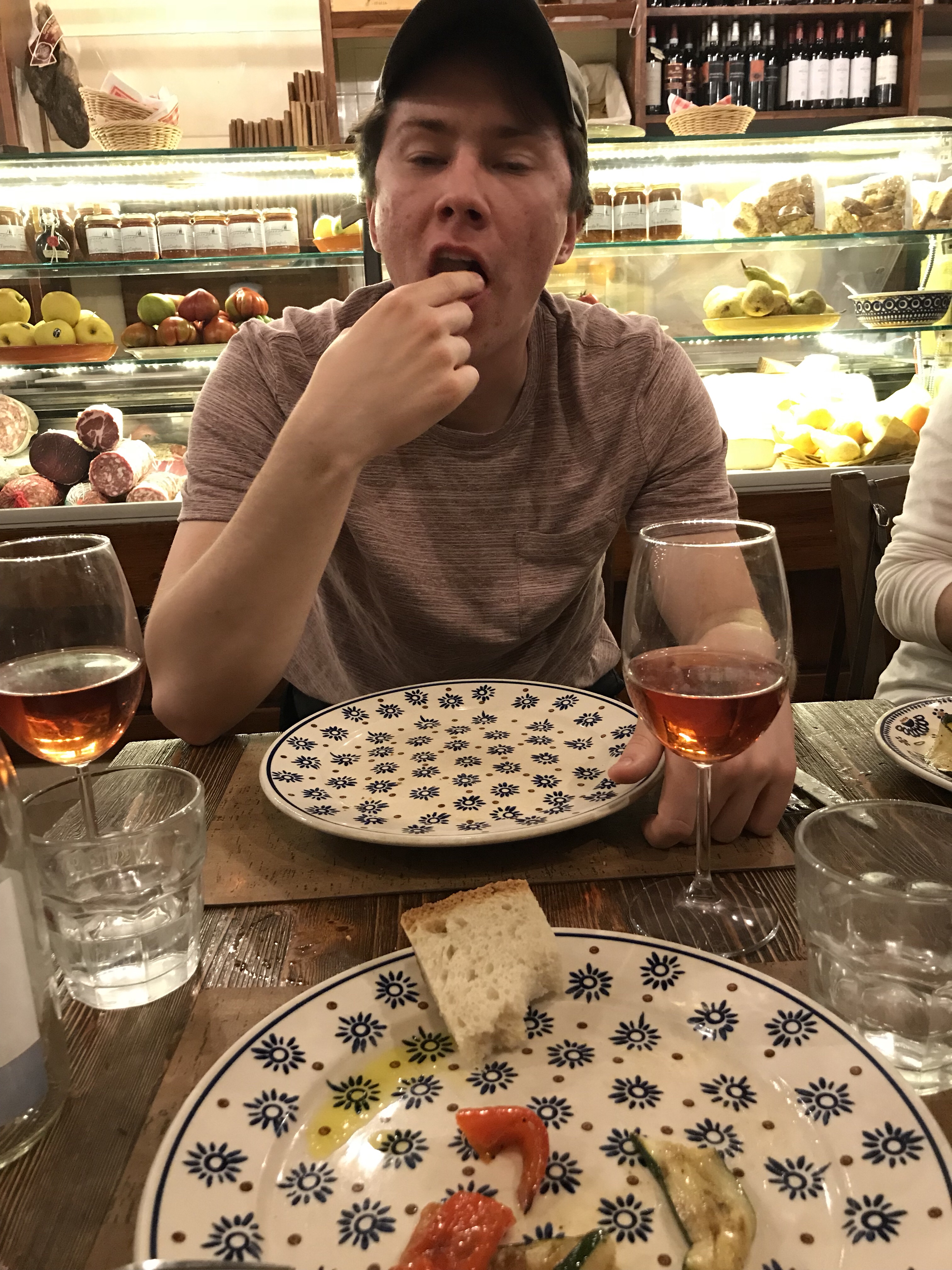 Now at this point, we’re pretty hungry. It’s getting dark, and we have accepted the fact we’ll be getting back to the Airbnb late anyways, so why not stay out one last night in Florence for a meal? After scouring the streets for menus and smells, we settled on a homey trattoria for our Last Supper – ha ha get it? Eh. For those not accustomed to the Italian eating schedule, I’ll preface it with this – it’s long and slow. There’s no rush to have the food come out as soon as you order; the point of meals is to enjoy the company of the meal. We started out with a bottle of wine, some bread, grilled mixed vegetables and oil-soaked vegetables (my absolute favorite is the artichokes, or carccofi). Jared and I then split some bolognese pasta and flank steak with potatoes – yum! The people next to us even asked what we ordered. It’s such a small world – they were an American couple, their daughter lives in U Street in DC and her roommate works at KPMG! After the massive amount of food, we finished with cookies on the house and tiramisu. I will not lie when I say I walked around with unbuttoned pants pretty frequently. After dinner, we left the city to go back to our Airbnb, but not before I got another two scoops of gelato (mango and strawberry). The drive home actually wasn’t terrible and we were asleep before we knew.