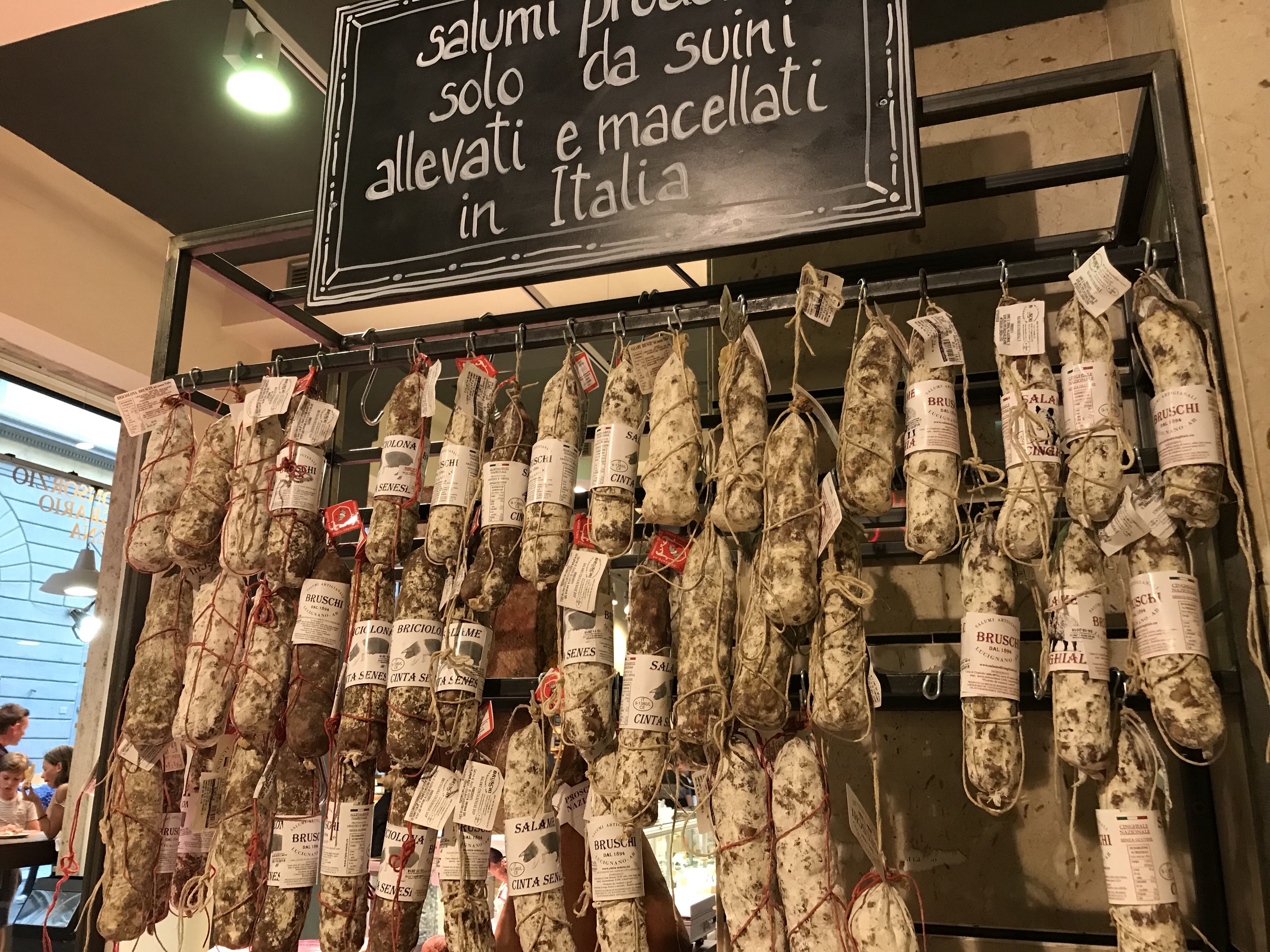 Once we did enough window shopping and picture taking, we started walking into the city. Not two minutes after we entered the streets, we started walking into a Salumeria – basically a fancy deli shop but 100x better than anything in the States. I’m not even joking when I say one of my favorite parts about Italy is the food, especially salami. The region is well known for cheese, hams and salamis and man did they have some good stuff to sample.