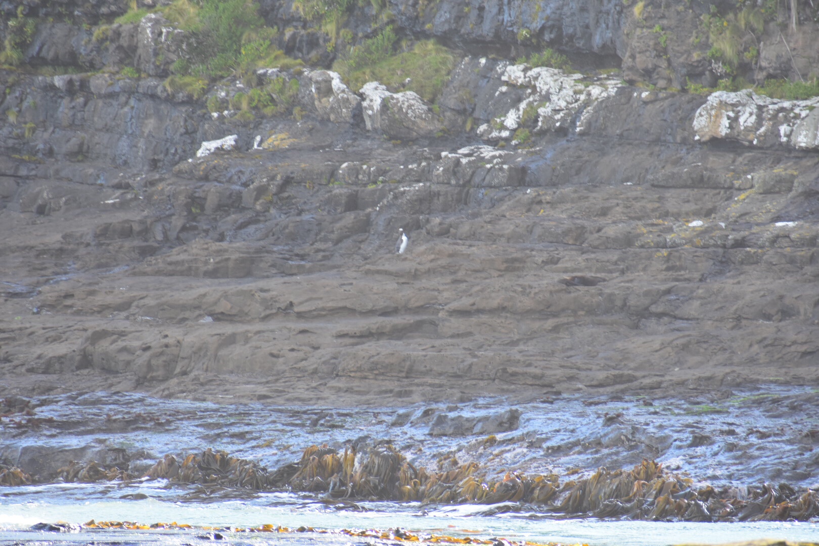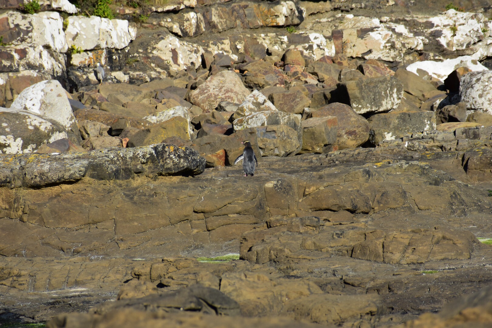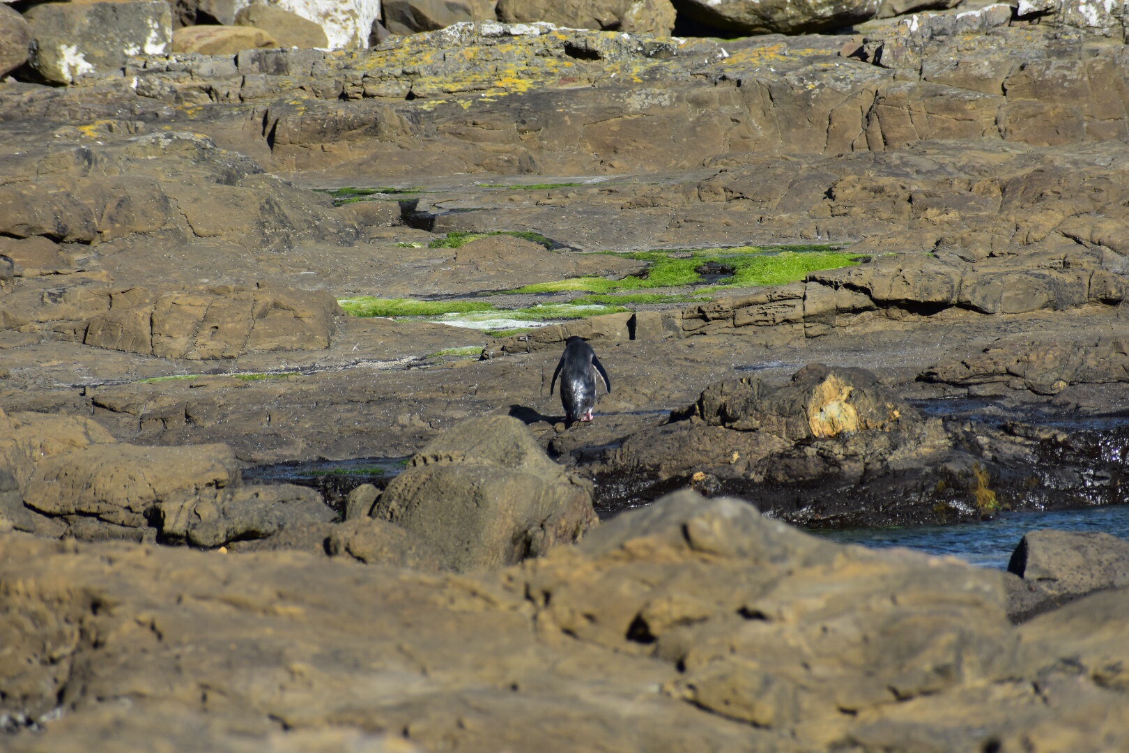 After resting a bit, we drove to Curio Bay, the real secret of the Catlins. We stayed at the CurioScape campground and were right in the thick of things. Curio Bay is special in the fact that it’s one of the few and best places to see Yellow-Eyed Penguins in their natural habitat, as well as Hector’s Dolphins, the world’s most miniature dolphin. While we didn’t get the chance to see any dolphins, we walked down to the beach around dusk along with the other camp goers and set up our camera ready to catch the penguin coming in from the ocean for its nightly march to its nest. We were told there were two resident penguins we would see – their respective mates were guarding the newly born babies. After waiting about an hour, we saw the first penguin in the distance on a cliff. It was too far to photograph but through our binoculars, or binos as we’ve started to refer to them (we’re practically Kiwis already), we saw the daddy hopping over rocks to get to its hungry chicks. About thirty minutes after seeing this, we saw the second penguin emerge a lot closer to us. He put on a show he did, taking about ten minutes to preen himself before wobbling on over to his family’s nest. Unfortunately we didn’t get to see the front of the penguin, or his mesmerizing yellow eyes, but it’s pretty cool knowing we saw two of approximately 4,000 Y-EPs left in the world.