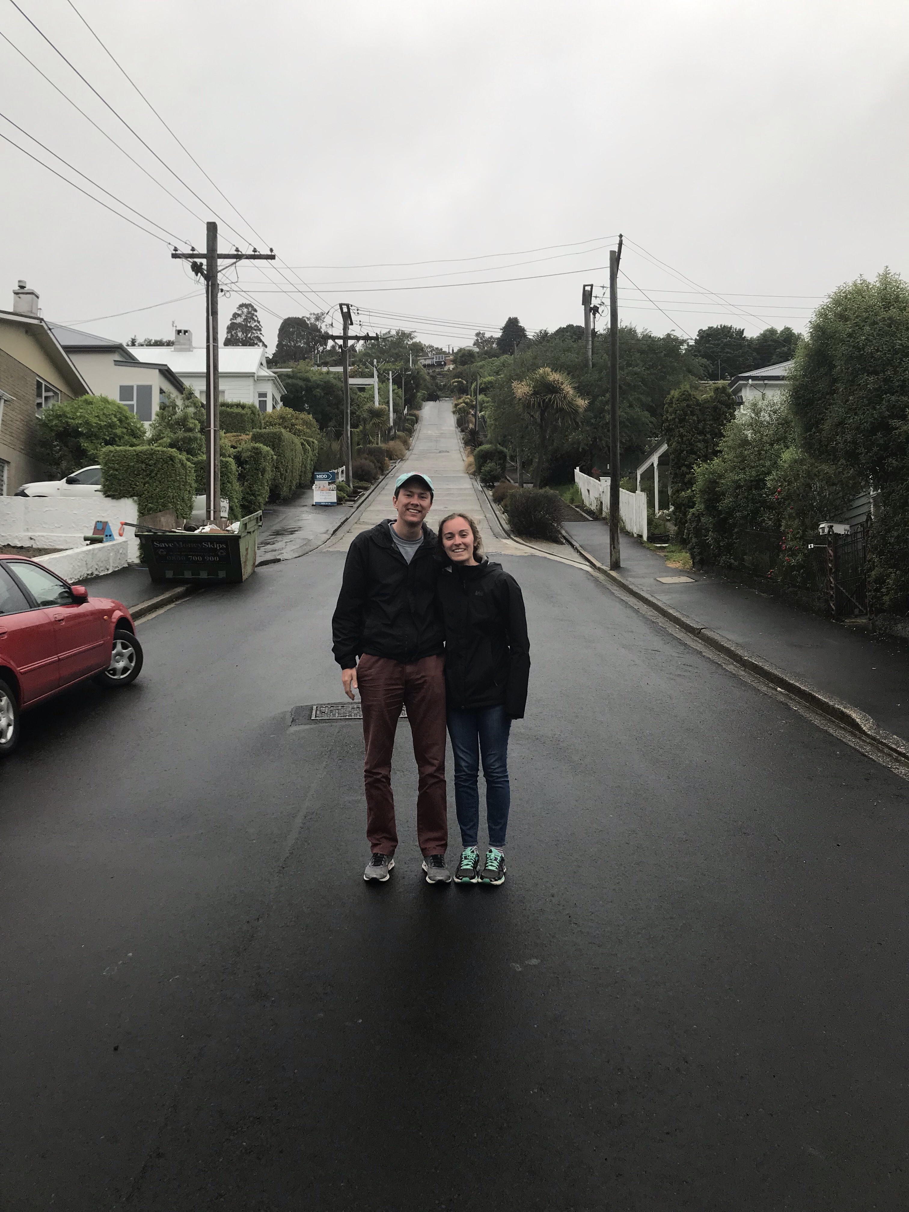 Moving on, we got to Dunedin around 3PM. Our AirBnB host was very nice and recommended some breweries to us to complement the gloomy day. We started at Speight’s, a Dunedin establishment that had been around since the 1800s. We got a good porter and ale, and split a real meal!! No freeze-dried Jetboil meal tonight, no sir. We split a rather English meal of sausage, mashed potatoes and peas mmm. After getting some rounds of cards in, we headed to Baldwin Street, the steepest street in the world. It didn’t take more than fifteen minutes to walk up but MAN that was steep! It was fun to watch the cars drive up – they had to start accelerating at the very base of the hill in order to make it up the hill. At some points, it was 45 degrees steep. Earlier in 2018, someone pogo-sticked up the entire street in order to raise money for the Ronald McDonald House.