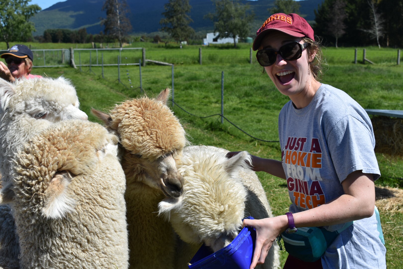 The alpaca farm happened to be about a five minute drive from our campsite. The farm was family-run and for a shear 🐑 (haha) $20/pp, we got an hour-plus tour of the farm, the alpacas, the blistering hot New Zealand sun and the beautiful clothing and accessories that Jessie the owner handcrafted from the alpaca wool. The tour was given by one of the owner’s friends that work with the alpacas, and she was able to explain some about the alpacas within each of the different pens. To be honest, the tour wasn’t super informative but when you’re feeding alpacas out of your hand and taking pictures of week-old babies, who cares? Btw, a baby alpaca 🦙 is called a cria. The tour took a little longer than we thought, leaving less time for the hike we wanted to do. The hike followed part of the Kepler Track for a few kilometers. Unfortunately, we started a little late and weren’t going to be able to make it to the end point so we turned around about 45 minutes in. On our way back, we met a couple of backpackers and one of them happened to be a graduate from VMI! He noticed our VT hat and we started talking about the Hokies. They had done the entire Kepler track, 60 kilometers, in three days! We walked down together, listening to their awesome stories about New Zealand experiences they’d had so far. After saying our goodbyes, we drove back to the Holiday Park and made some stir fry for dinner in the kitchen. Day 2: Into Fiordland National Park.