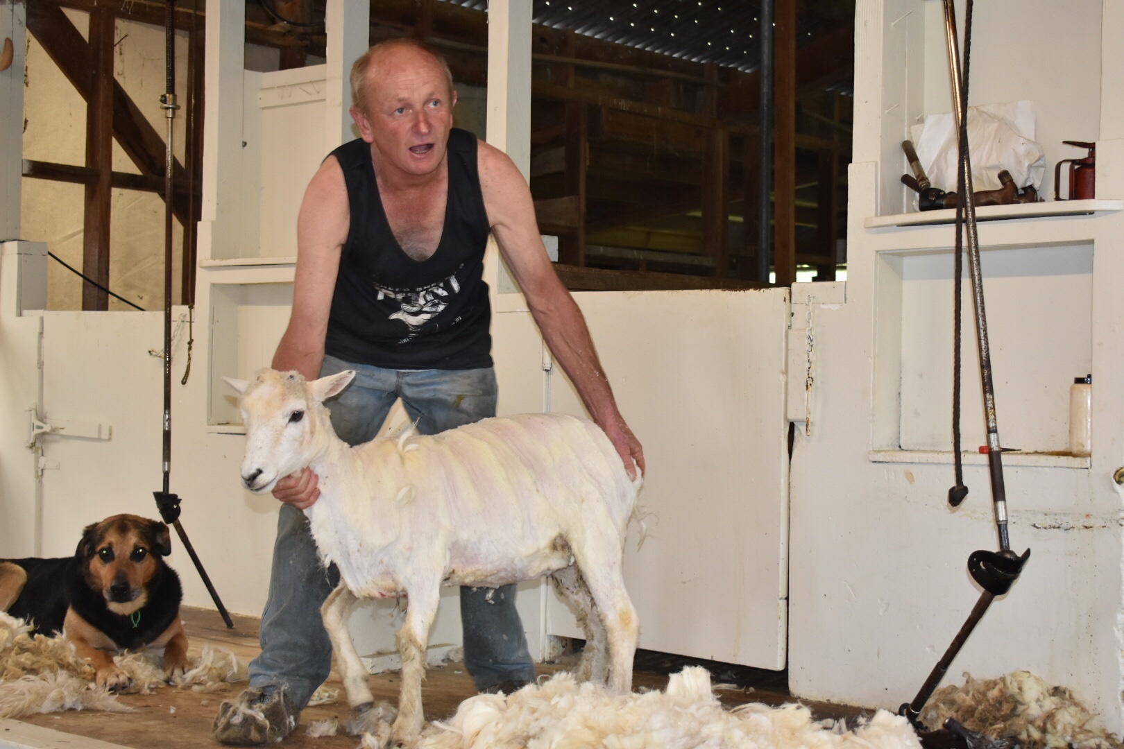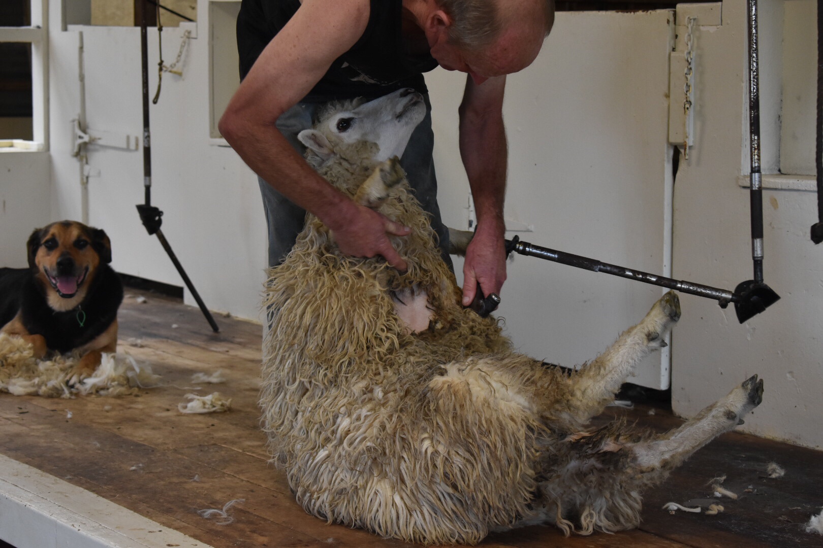 The shearing process does not hurt the sheep and is necessary to trim their wool twice per year for his breed, the Drysdale.