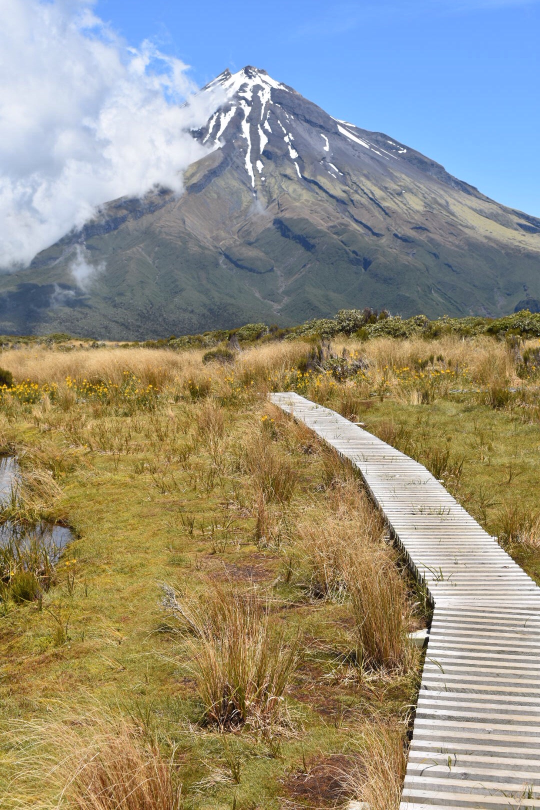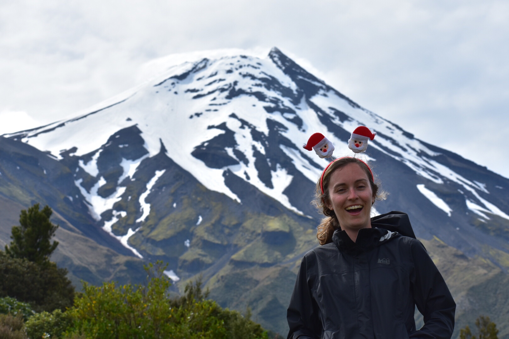 The next morning, Christmas(!!), we woke up in the car. We didn’t have too many plans because of the bad weather. When all the stores and community centers are closed on holiday and you had planned to be outside all day, it’s hard to have plans. The sky did a good job of clearing up now and then so after a slow morning, we drove 30 minutes to Dawson Falls and did a 1.5 hour loop hike to Wilkies Pools. We hiked through the Goblin Forest, a dense and moss-covered hodgepodge of trees and ferns. The falls weren’t that impressive but at least we were out exercising. Once we got to the car park, we hung out in the car for a while waiting to get a good view of Taranaki. I have previously mentioned in posts that Taranaki is the mountain used to represent Mount Doom in the popular LOTR movie series. I apologize but I was wrong! I’ll get to the correct one in another blog. Taranaki is still impressive because it’s a mountain all by itself, not part of a range.