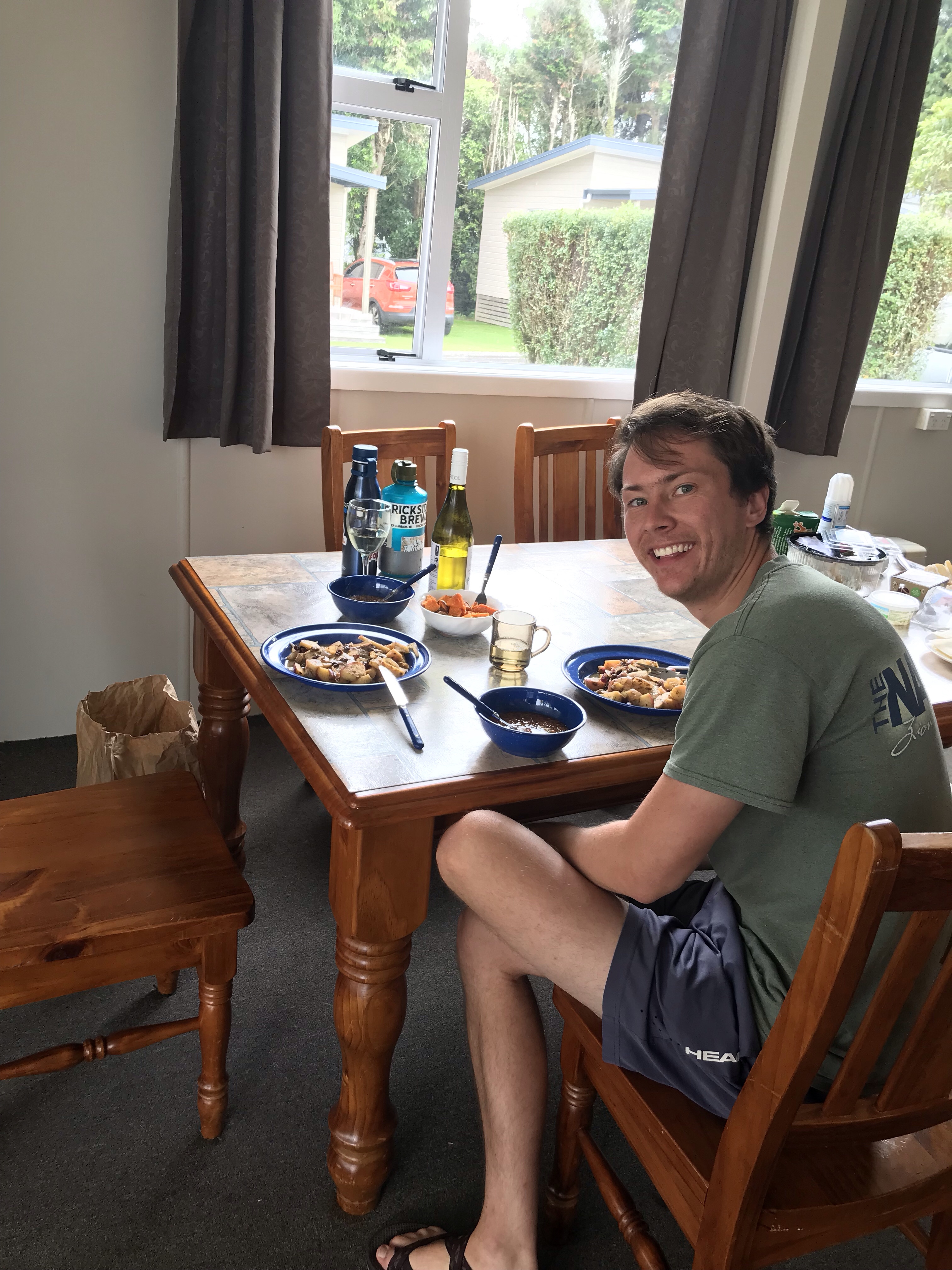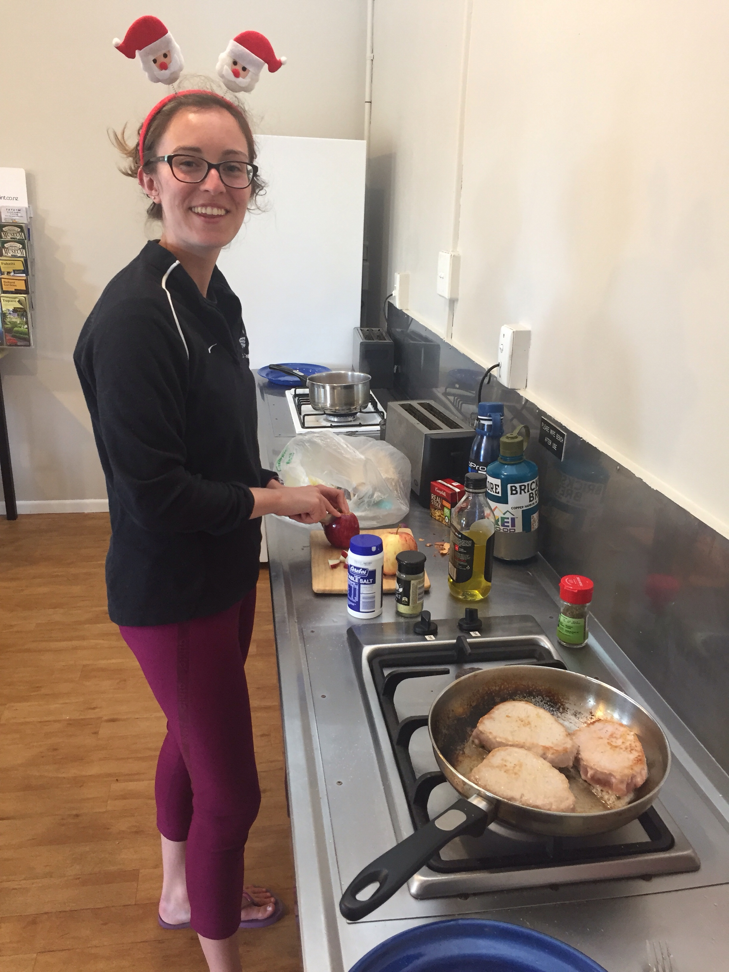 Legend goes that Mount Taranaki was very in love with Mount Tongariro but had to fight Mount Ngauruhoe for her love (the real Mount Doom). Defeated, Taranaki was banished to the West to live in solitude. You might want to Google check that but the story goes something like that. After a few Netflix episodes (hey the weather was misty and cloudy), the clouds parted and we saw the majestic Taranaki. Satisfied with our pictures, we headed back to camp for dinner. On the menu was pork chops with apples, raisins and onions, along with roasted sweet potatoes and a bottle of wine we’d been saving from Marlborough. The kitchen was full and alive with other campers cooking their holiday dinners. We met a really nice woman from Russia and had good conversation with her over dinner. After cleaning our dishes, we headed back to our site and slept in the car again. Definitely a Christmas for the books.