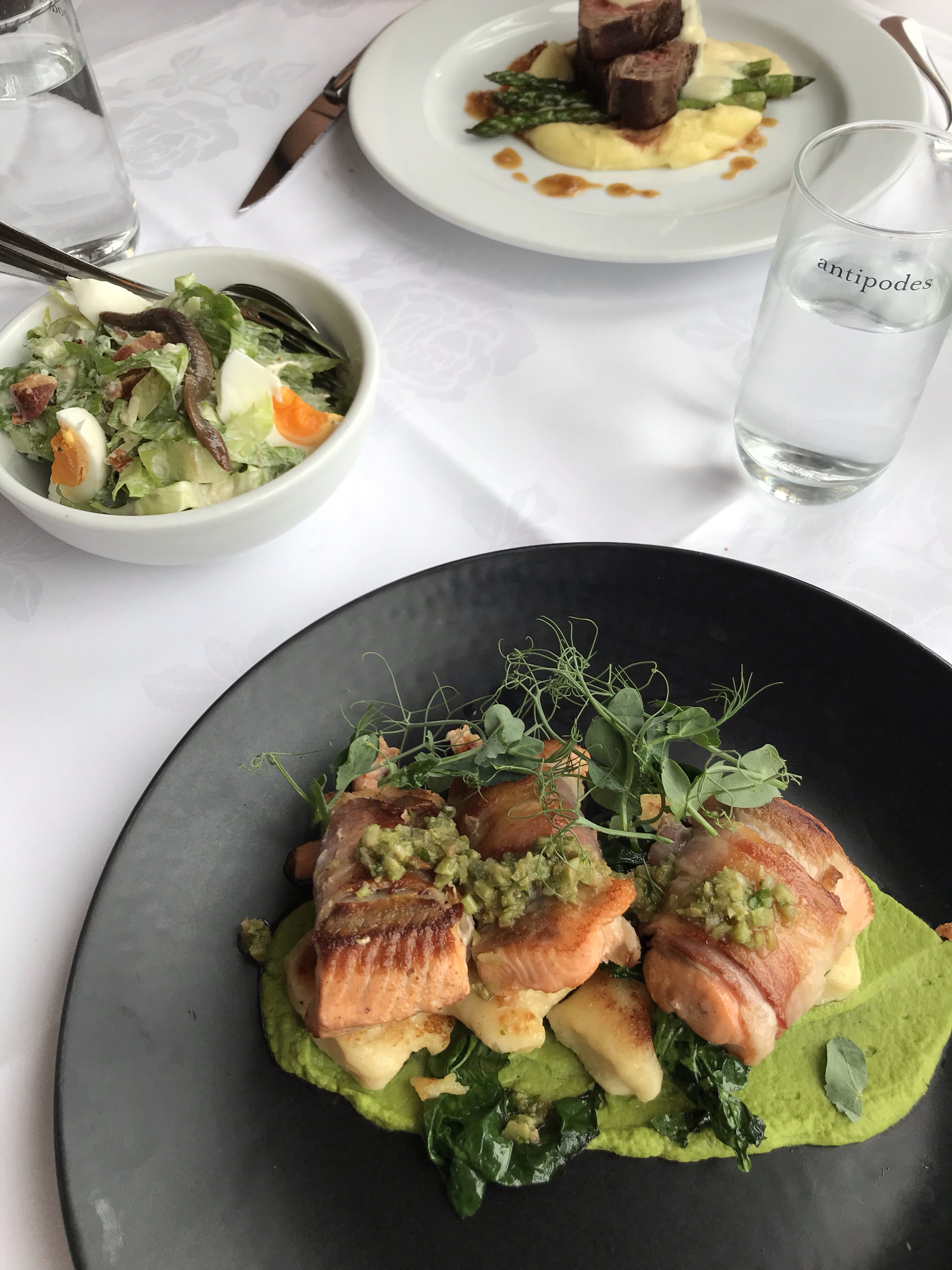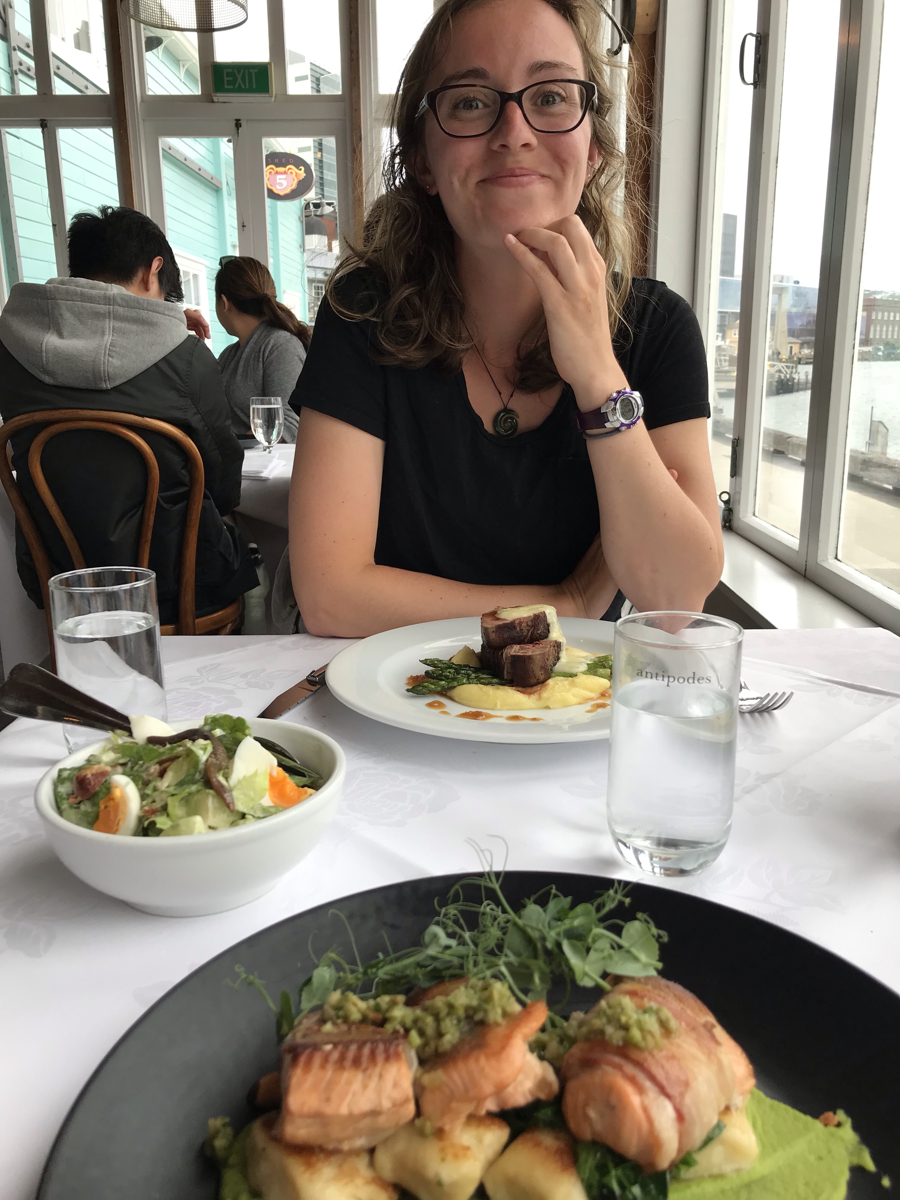 A couple we met earlier in the trip told us about this website called First Table, available in certain countries. You pay $10NZD to book a table then during dinner, all food items are 50% off! We went to a restaurant called Shed 5, which was right on the water and highly reviewed on Yelp (can’t go into a restaurant without first checking it out on Yelp!). We got seated near the window and set to work on the menu. We started with a set of three homemade breads and truffle mascarpone spread, then moved on to a caprese salad. Slurping up every bite, we patiently waited for our mains of salmon wrapped salmon (Jared) and a Savannah eye fillet steak (me). They came out delicious. It was hands down one of the best meals we’ve had here (up there with Fergburger), and we ended up paying around $55USD for what would have been a $130NZD meal.