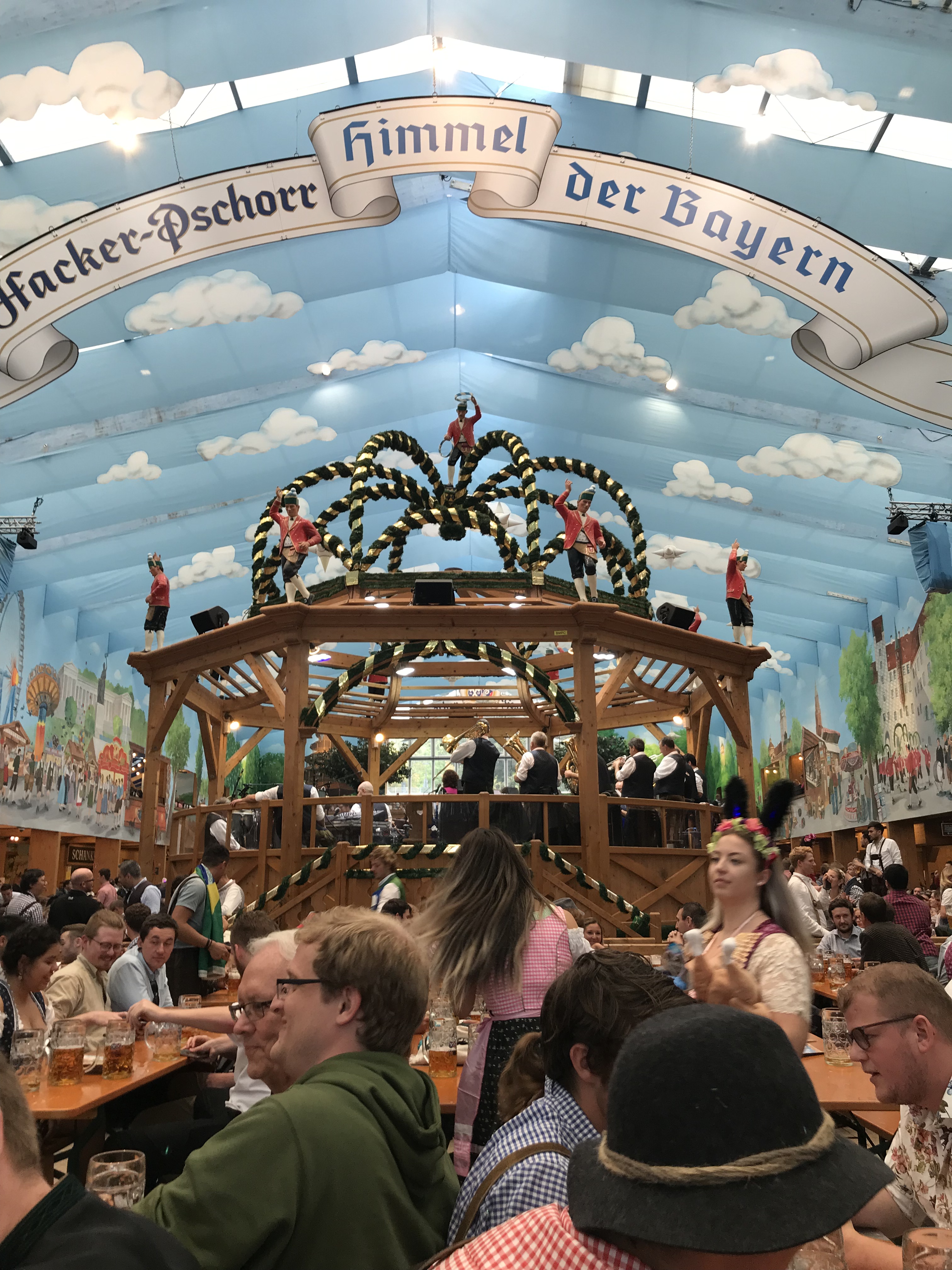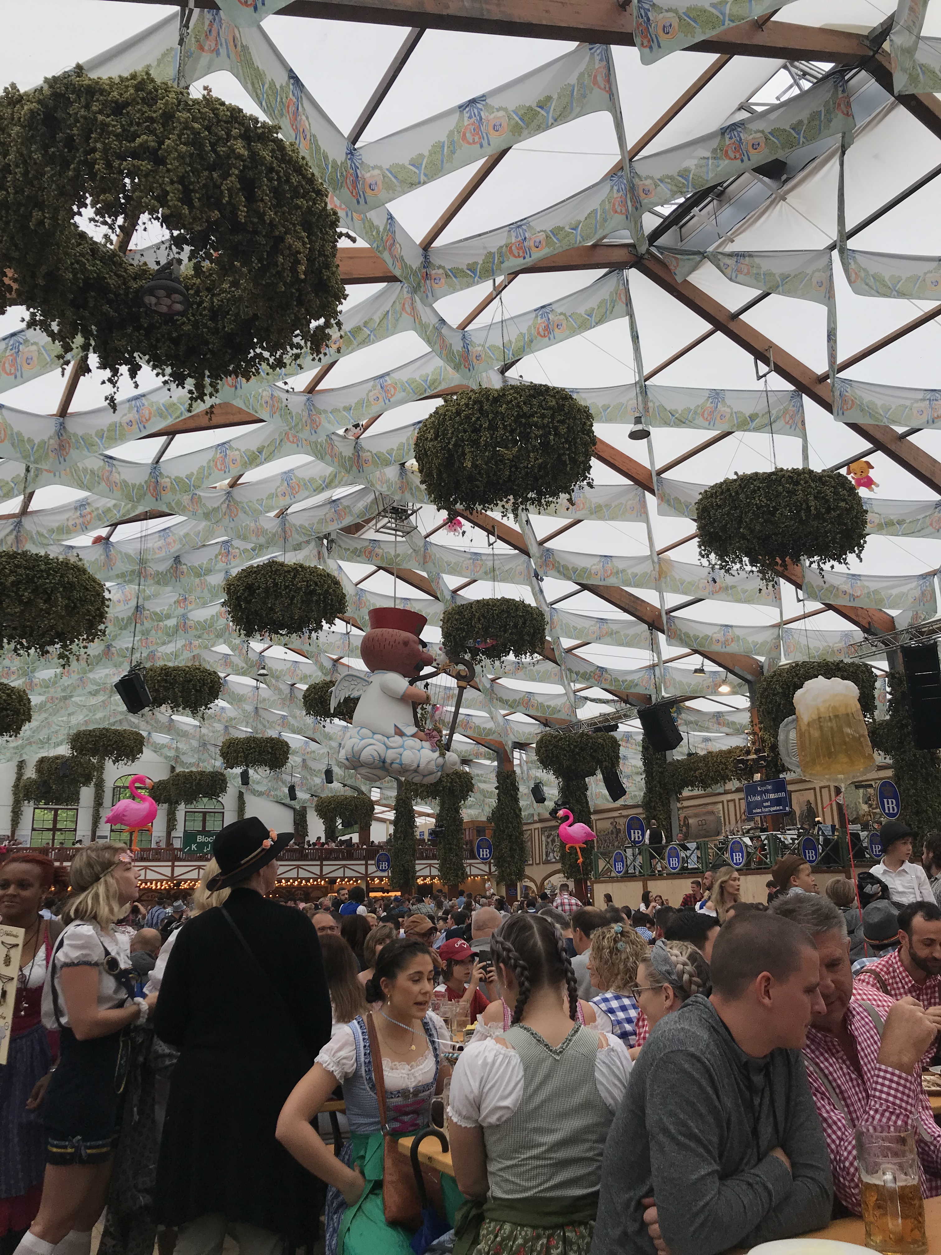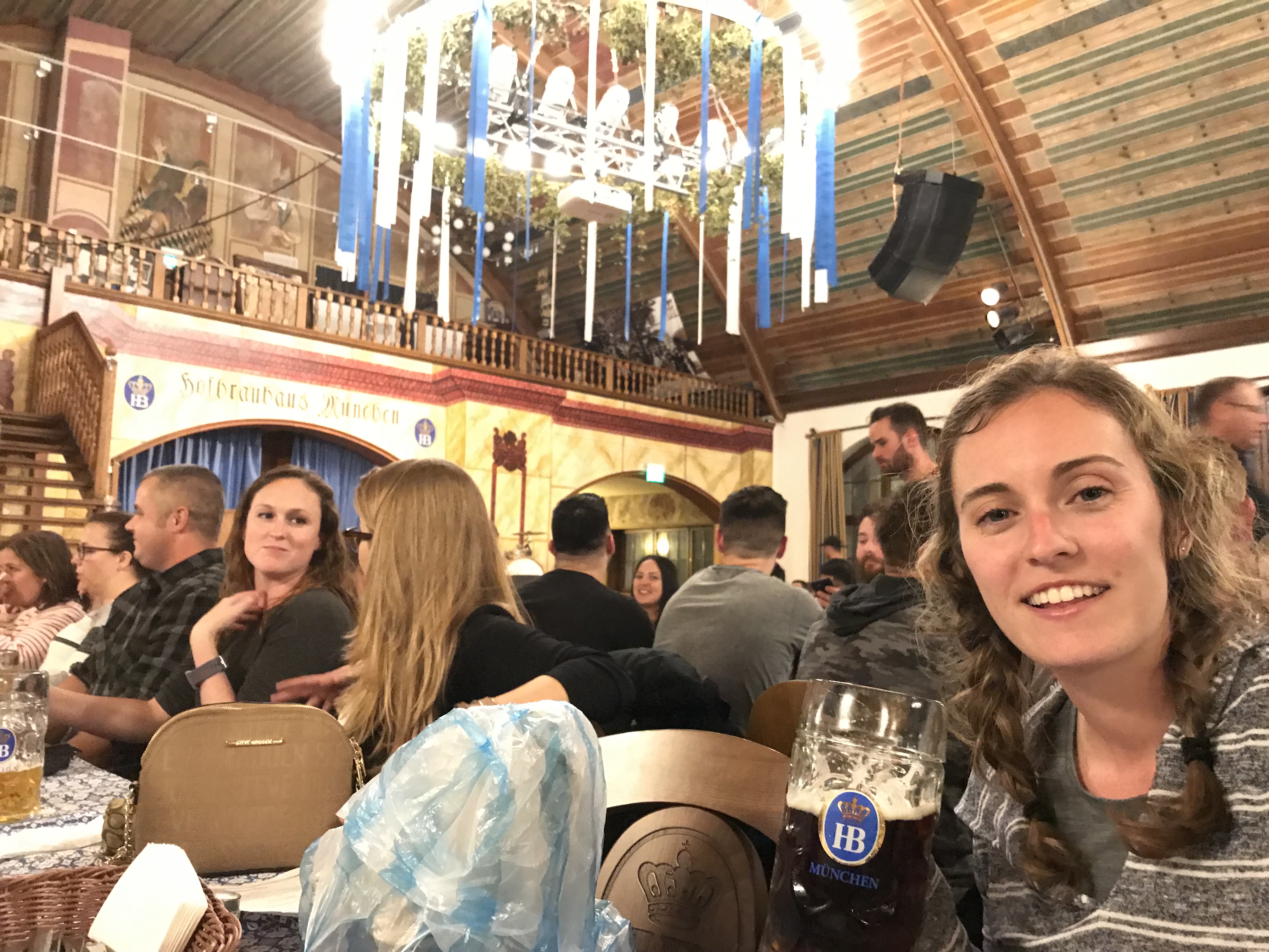 By this point, everywhere was very full and all of the people in the tent were fairly rude and didn’t let us Americans sit with them. We decided it was probably a good time for dinner anyways and went to Hofbrau restaurant downtown. The restaurant was absolutely massive and there was live entertainment in the hall we ended up sitting in. I didn’t know this prior but apparently Hitler gave a lot of speeches, some fairly well-known, from HB. We split sausage and sauerkraut, a salad, and yet another liter before walking through downtown a little. At this point, it was pretty dark and we didn’t see much. We decided to hop on a train and try our luck at another tent one more time. We ended up going back to the Hofbrau tent at Oktoberfest and sealing our hangover fate for the next morning. We stayed until closing and it was so fun to see everyone so drunkenly cheerful and dancing and laughing. We took the train back to our AirBnB (we’ve become pretty good at European public transportation)