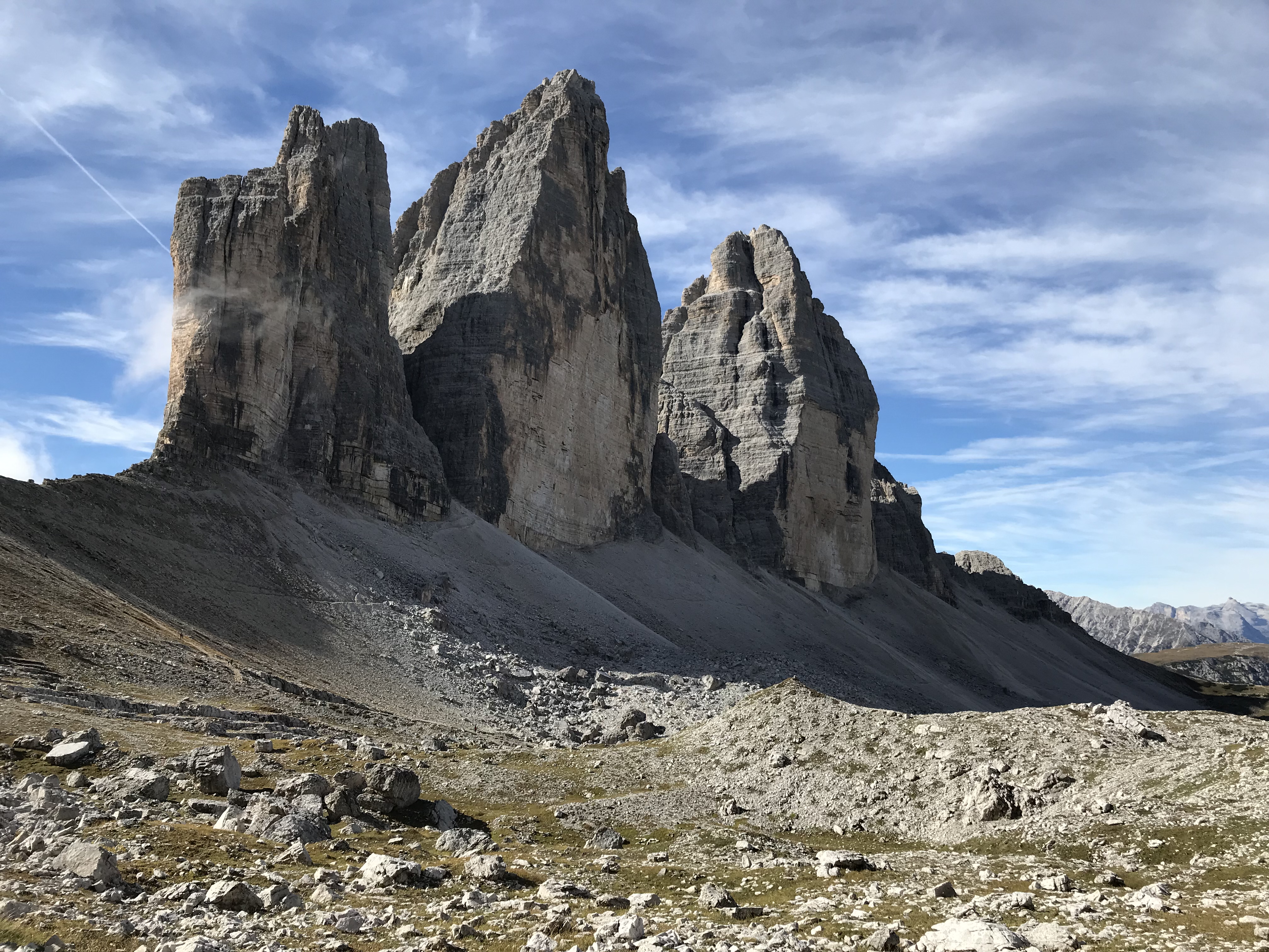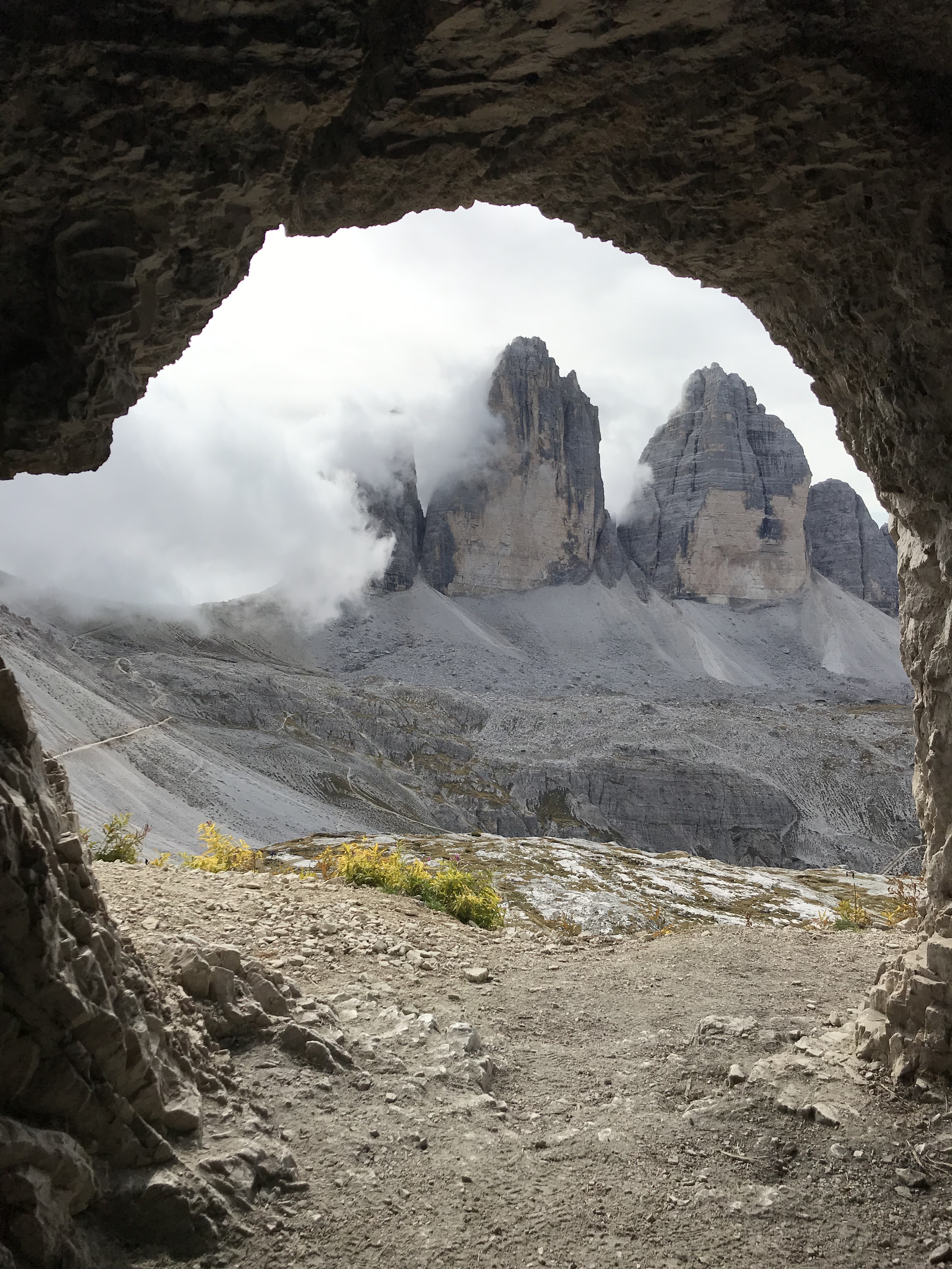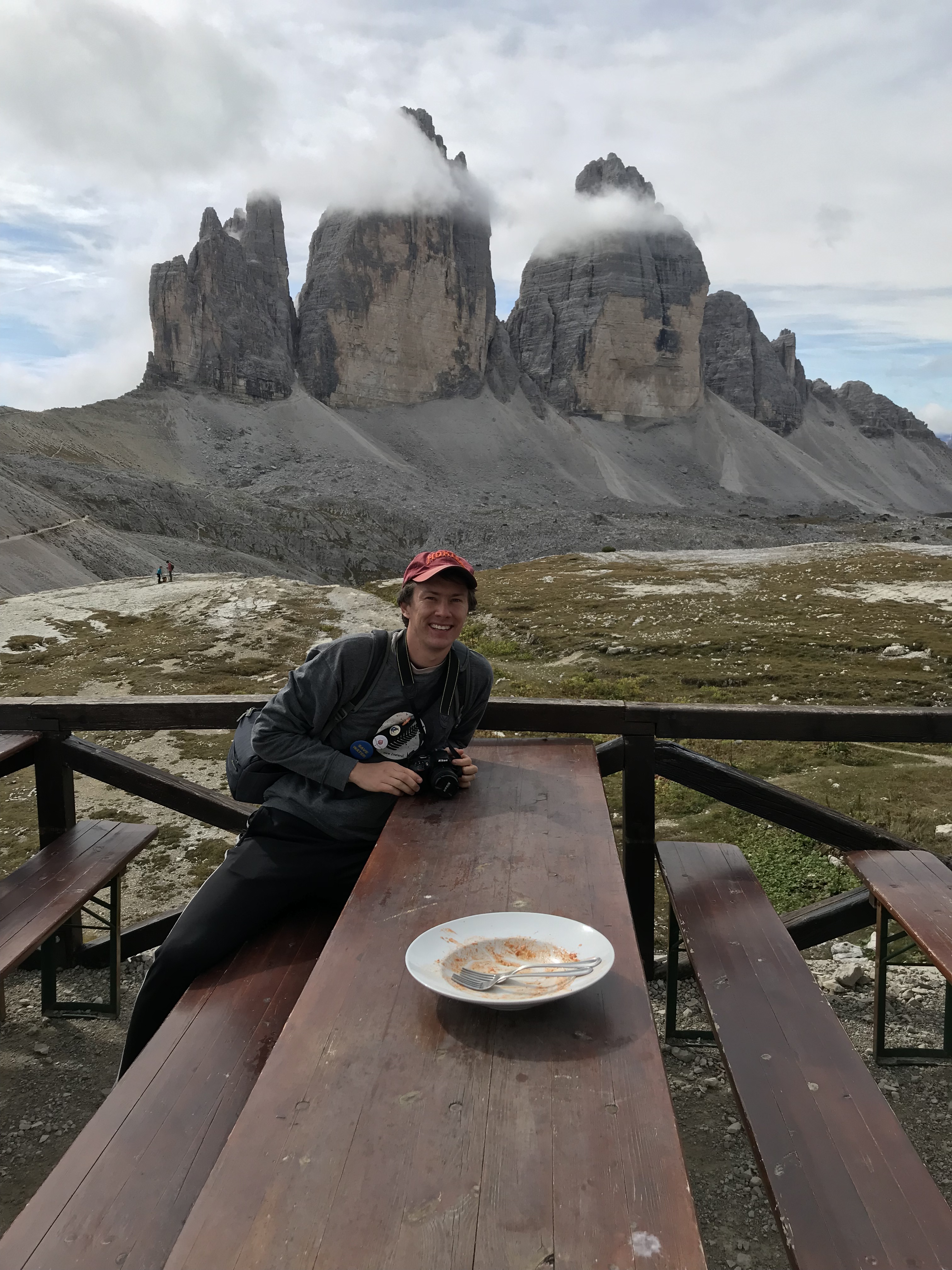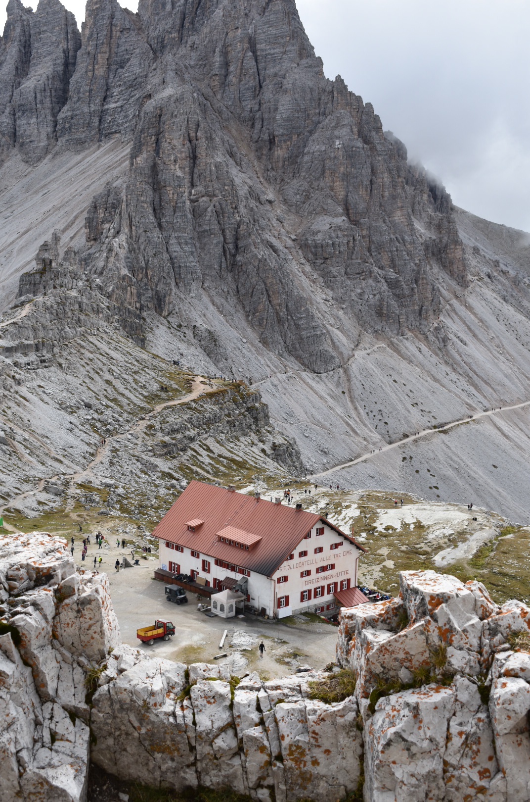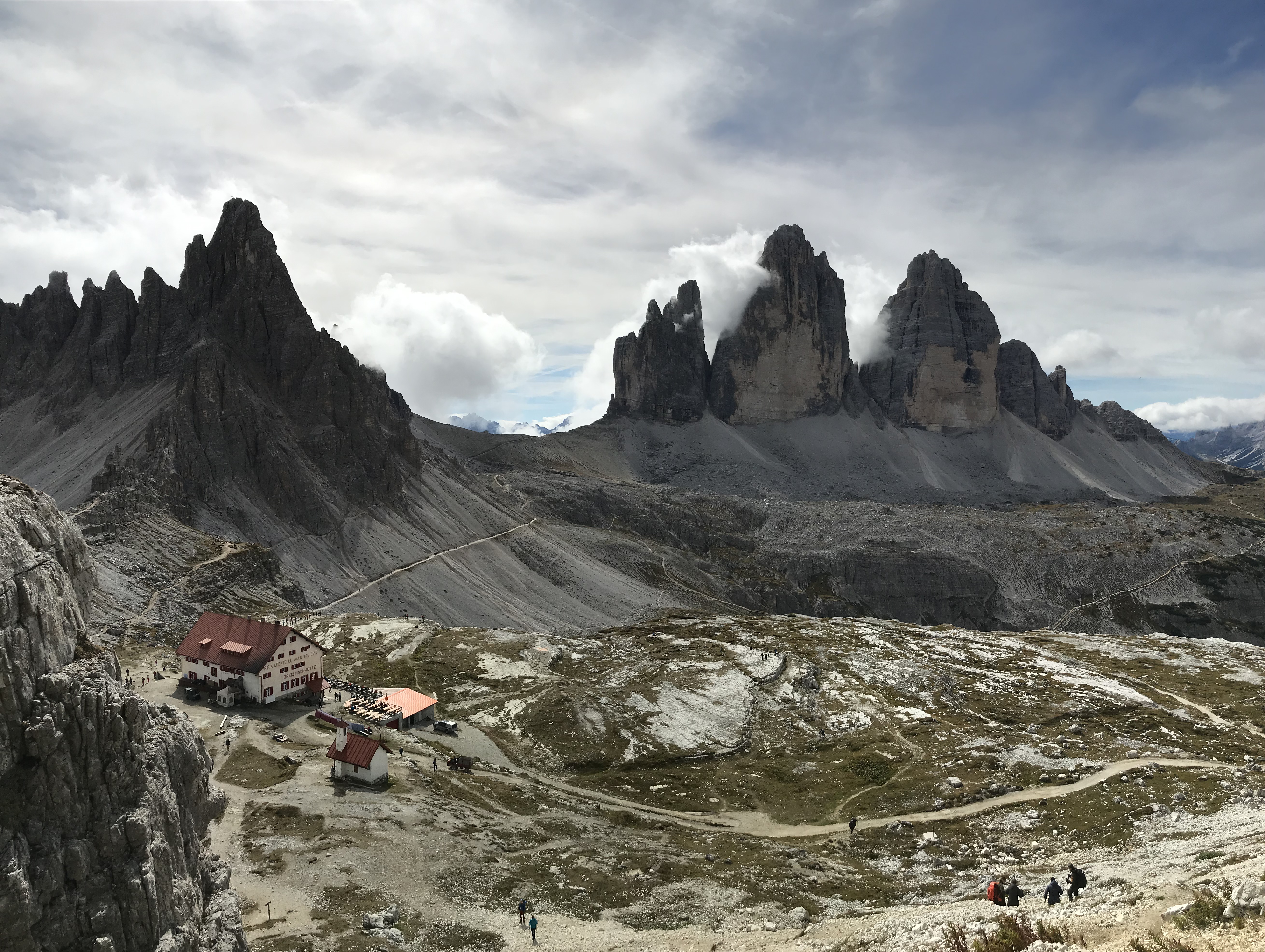 The next morning, we woke up early to get to the trailhead for the Tre Cime di Lavaredo hike. We had to pay a 30 euro toll just to get up to the trailhead parking (but soon we’d realize it was totally worth it). Tre Cime di Lavaredo literally translates to the three peaks of Lavaredo, and they are probably one of the most famous mountain groups in the Alps. Until 1919 the peaks formed part of the border between Italy and Austria. Now they lie on the border between the Italian provinces of South Tyrol and Belluno and still are a part of the linguistic boundary between German-speaking and Italian-speaking majorities (we did hear a lot of different languages). History fact: Since the front line between Italy and Austria during World War I ran through the Tre Cime peaks, there are a number of fortifications, trenches, tunnels, iron ladders, and commemorative plaques in the area. The hike basically traversed around the base of the three magnificent peaks, with Refugios, or mountain huts, sprinkled throughout the trails. The terrain was really rocky, almost like another planet.