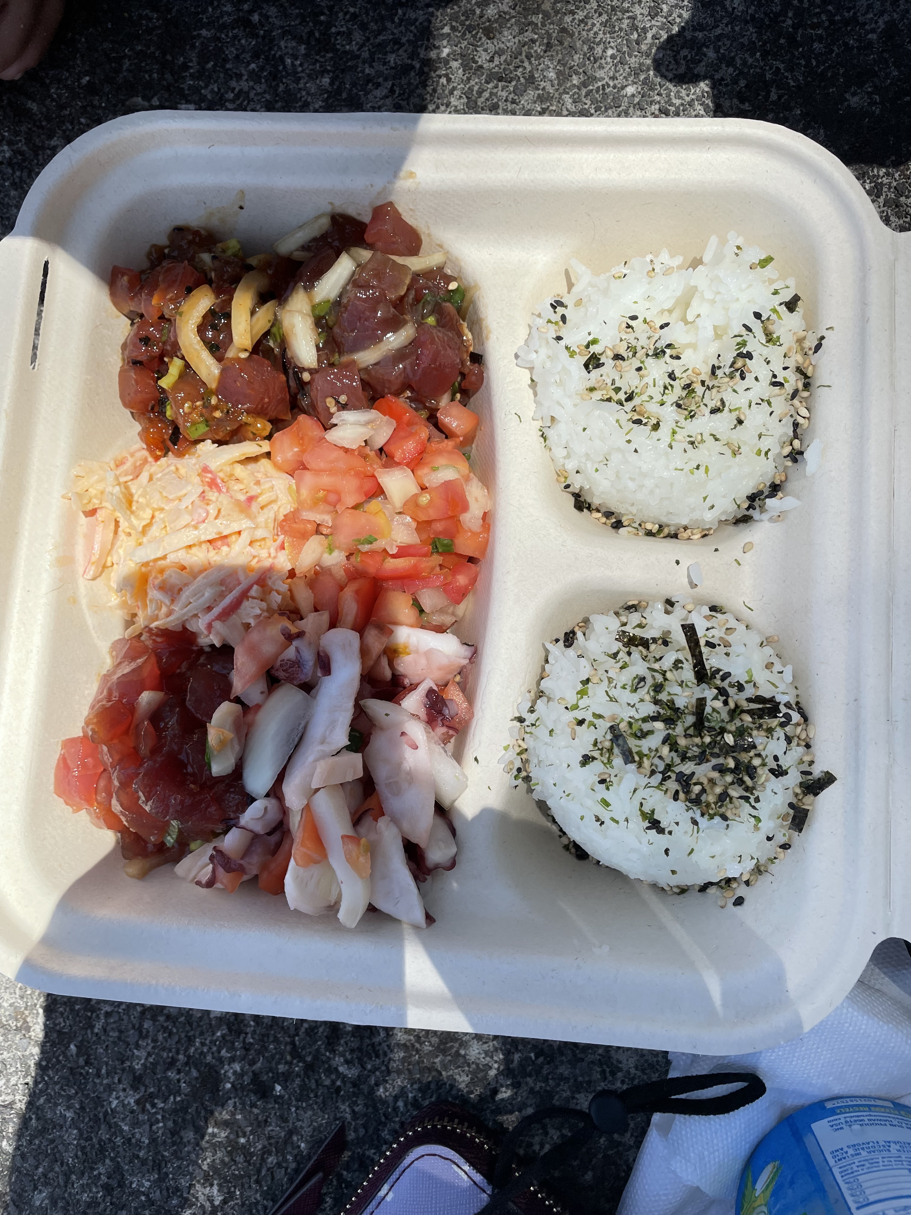 For lunch, we drove five minutes down the coast to apparently the best poke on the island. We waited overall start to finish an hour in line but it did not disappoint – we got to try four types of poke, two sides and rice. It was my first poke and I enjoyed it (texture is still a little hard to get used to).