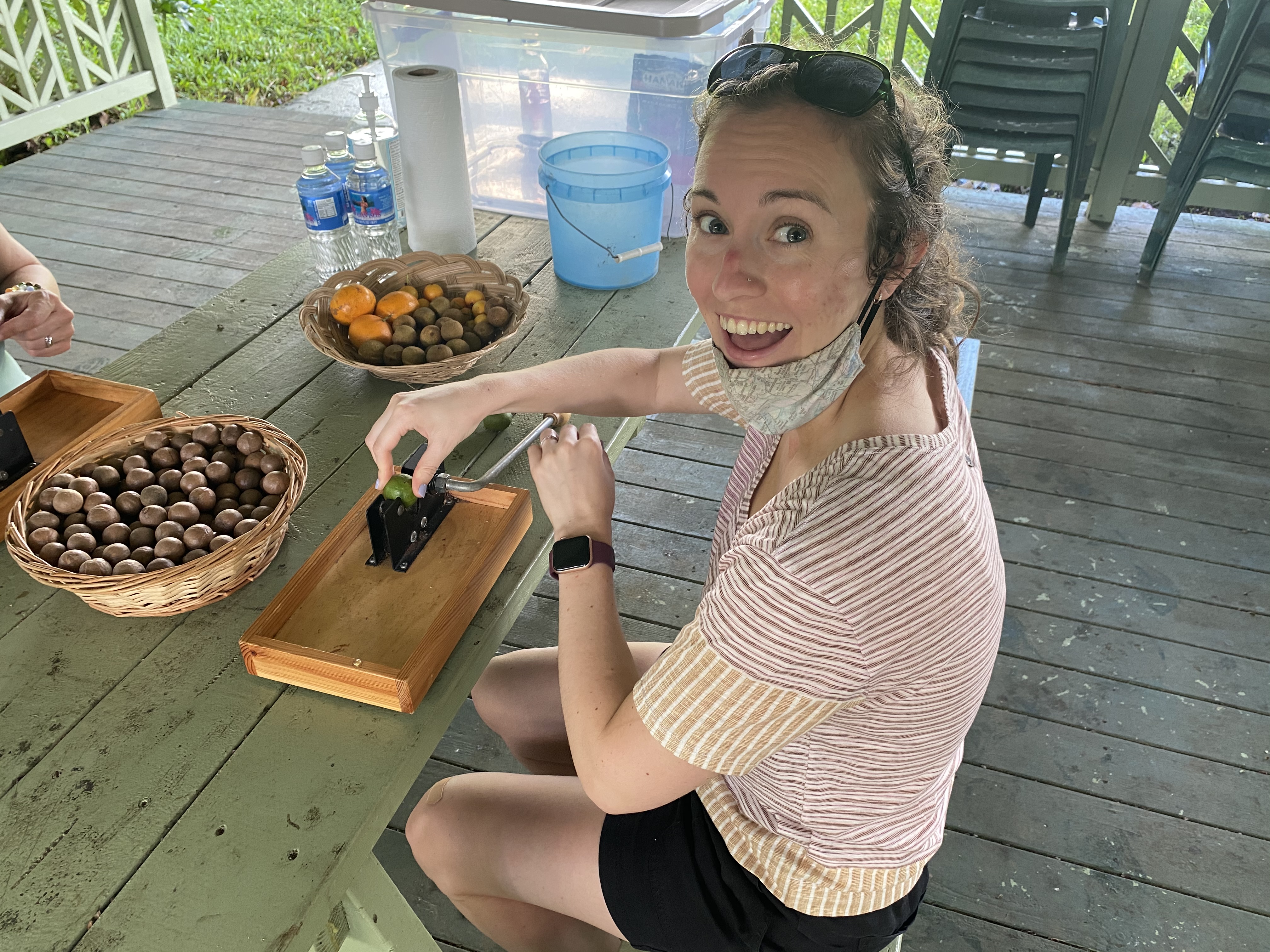 Today’s the day we head to Maui but not before doing a few more things on the PowerPoint! We woke up early, said goodbye to the awesome Airbnb after brewing some more of the homegrown coffee, and headed back towards Hilo to OK Farms. And it was definitely more than just OK! We did a nice little hour and a half tour of the 1,000 acre farm with only one other person. The tour guide’s Ohana (family) has owned the farm for decades. They grow just about everything under the sun, even though it mostly rains on the Hilo side of the island. Coffee, pineapple, lychee, and lemons, to name a phew. We got to pick our own macadamia nuts, cracked a couple and ate them fresh – yum! And they tasted much more like coconuts before they are dried. We also tried mangosteen and dragon eye for the first time – too bad they aren’t in most grocery stores on the mainland. She then took us to a couple of waterfalls on their property which together power 20% of Hilo! Lastly, she drove us through ‘Spice Row’ where we sniffed cinnamon leaves, munched on some whole cloves (which left our mouths quite tingly) and picked some whole nutmegs. The cloves are also good for bug bites so I chewed it up and rubbed them on some bites I got, and the itching went away! All in all, SUPER informative farm tour.