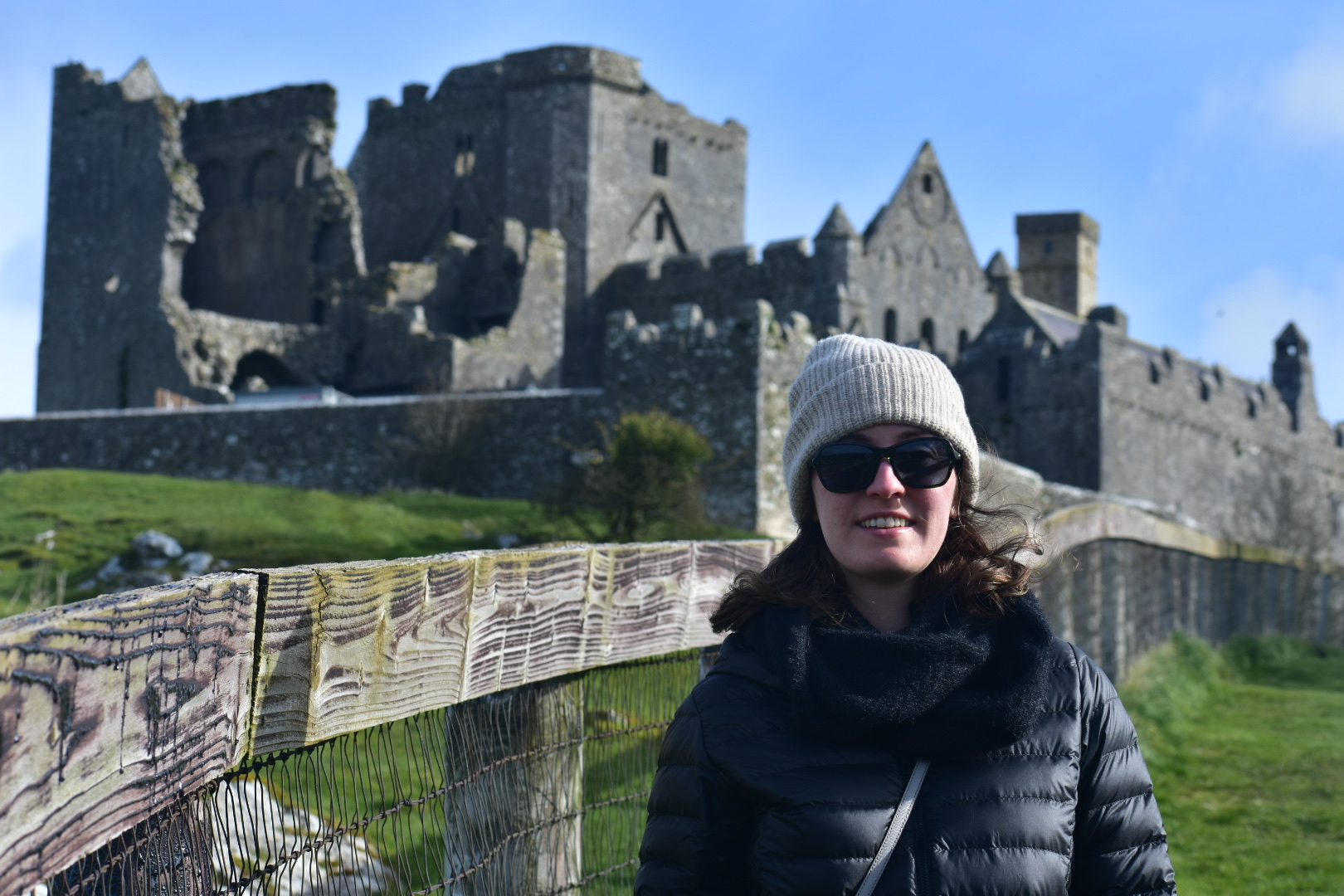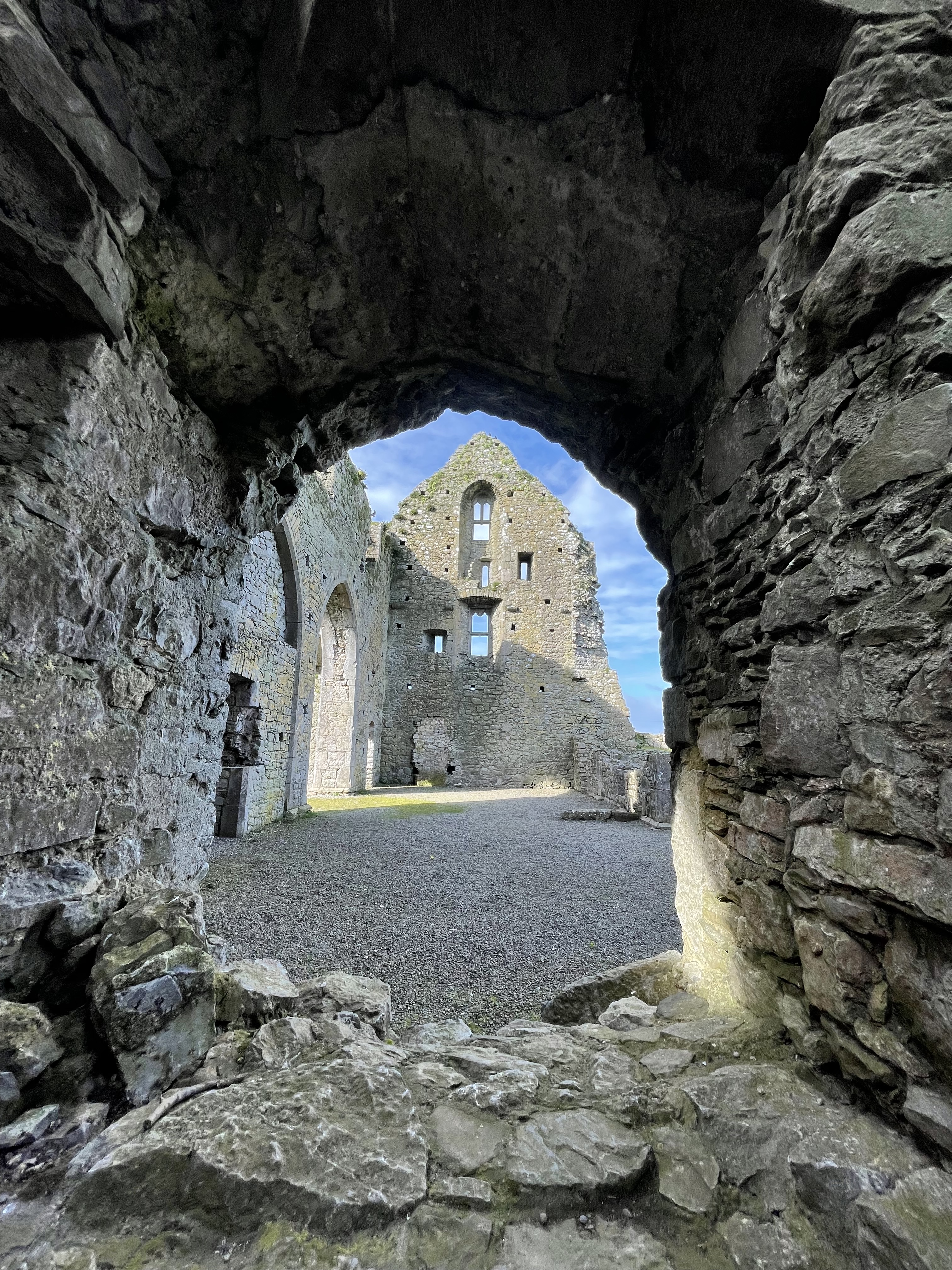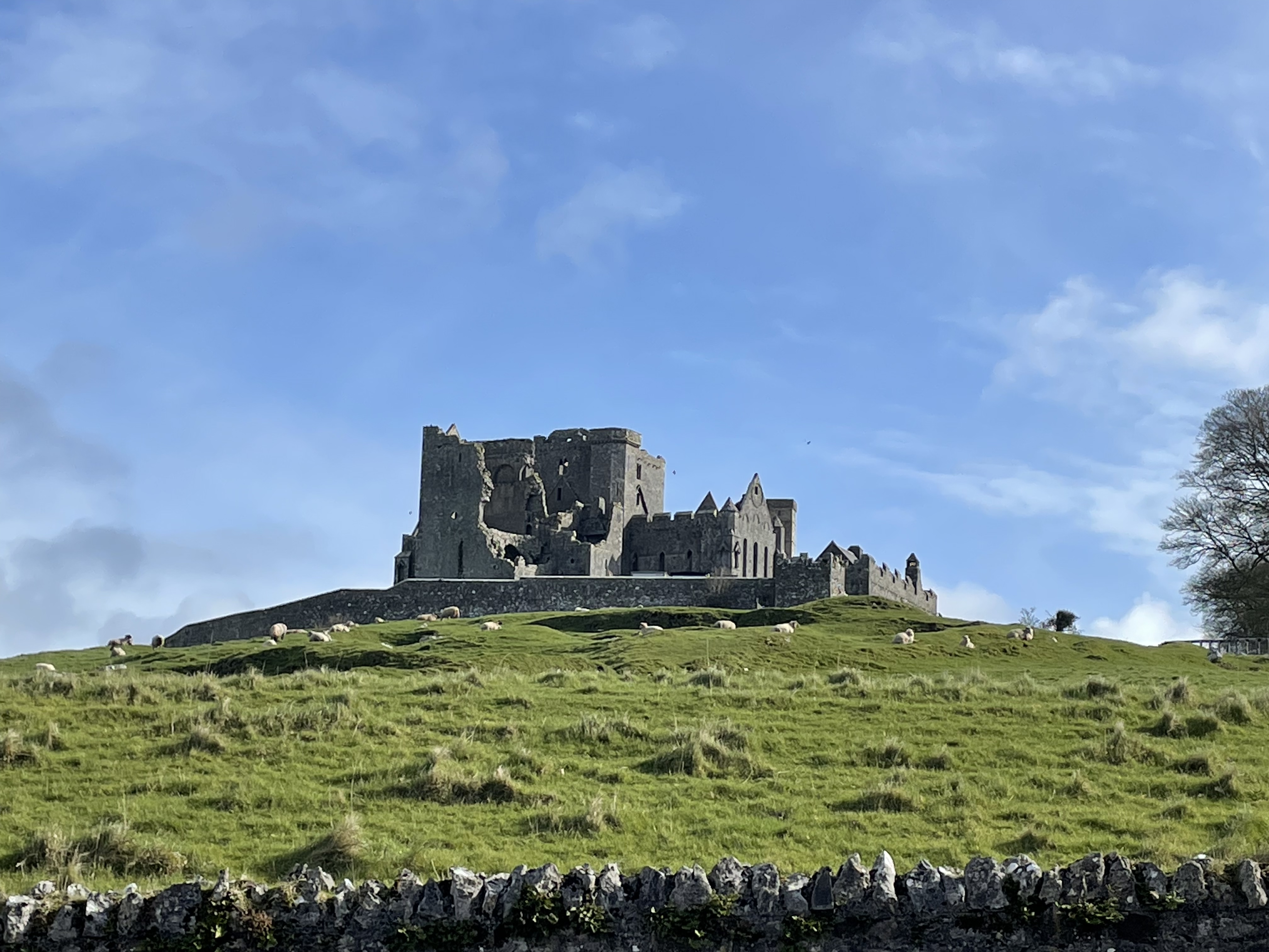 We made it back right in time for the tour. Now, Rock of Cashel – what is it? Set on a dramatic outcrop of limestone, the Rock of Cashel, iconic in its historic significance, possesses the most impressive cluster of medieval buildings in Ireland. Among the monuments to be found here is a round tower, a high cross, a Romanesque chapel, a Gothic cathedral, an abbey, the Hall of the Vicars Choral and a fifteenth-century Tower House. According to legend cited by our guide, the Rock originated in the mountains roughly 20 miles north of Cashel, when St. Patrick banished Satan from a cave, resulting in the rock landing in Cashel. Never mind that the mountains are made of sandstone, while Cashel is made from limestone. As the guide said, “the devil is in the details” – haha! It was very interesting to hear all the fun facts about the buildings, including how it used to be the seat of the kings of Munster before it was turned over for the Church’s use in 1101. Rock of Cashel was home to several battles, and at one point the entire building was set on fire. I asked the guide how these buildings were constructed I.e. how the stones were “glued” together since there wasn’t concrete back then, and he said they would’ve used a mix of pig’s blood/horse hair as the adhesive, and this would have crystallized over time. How wild!