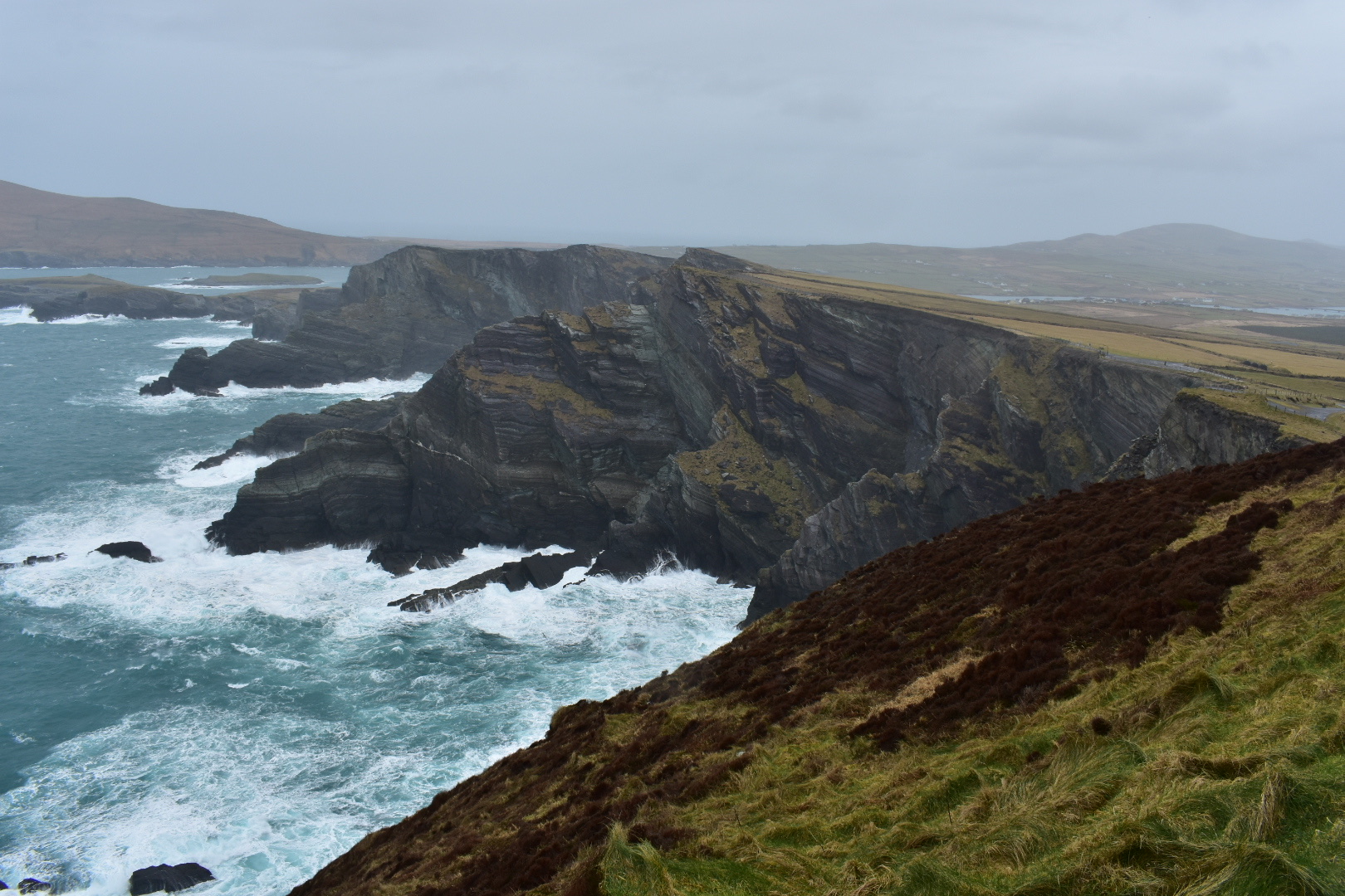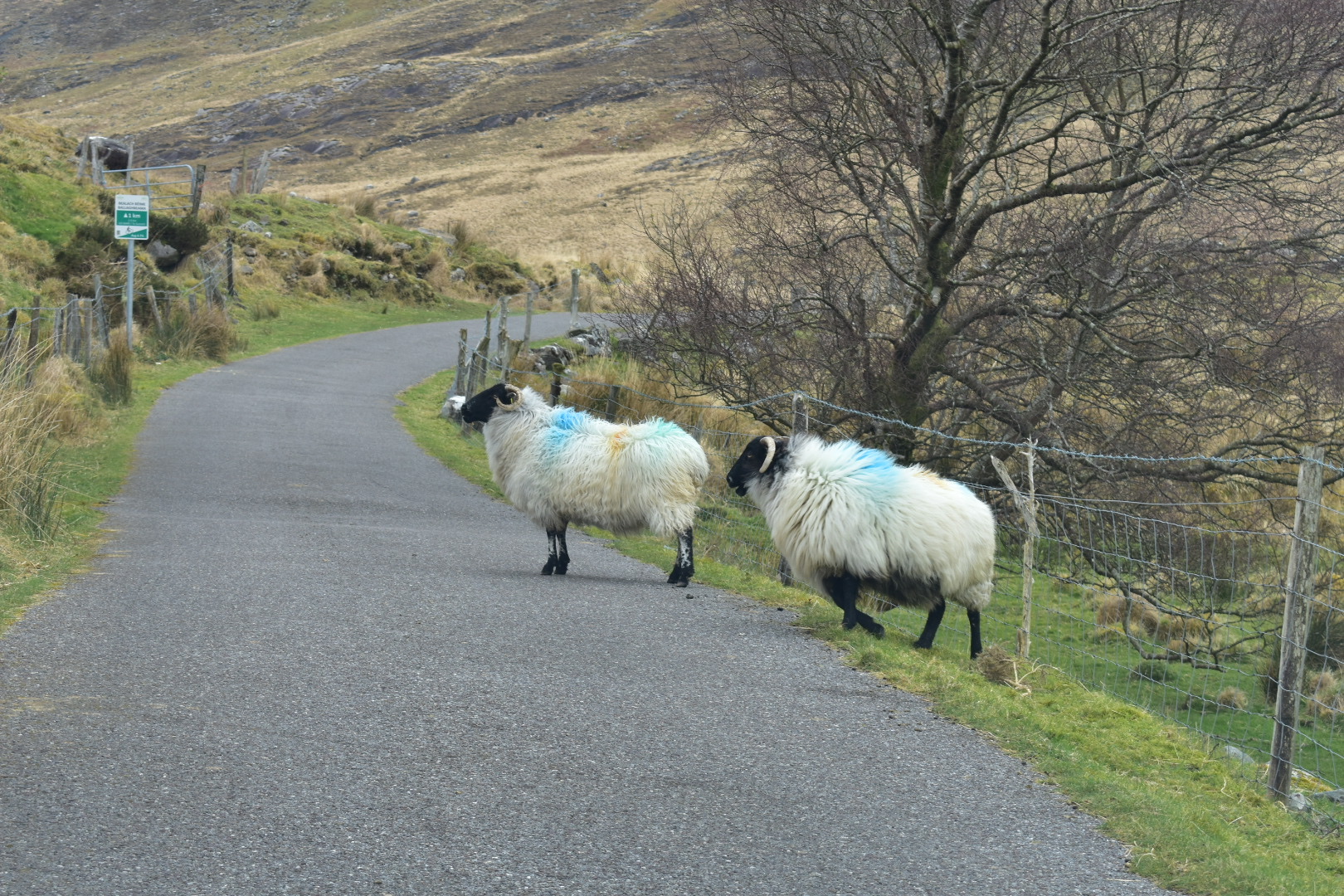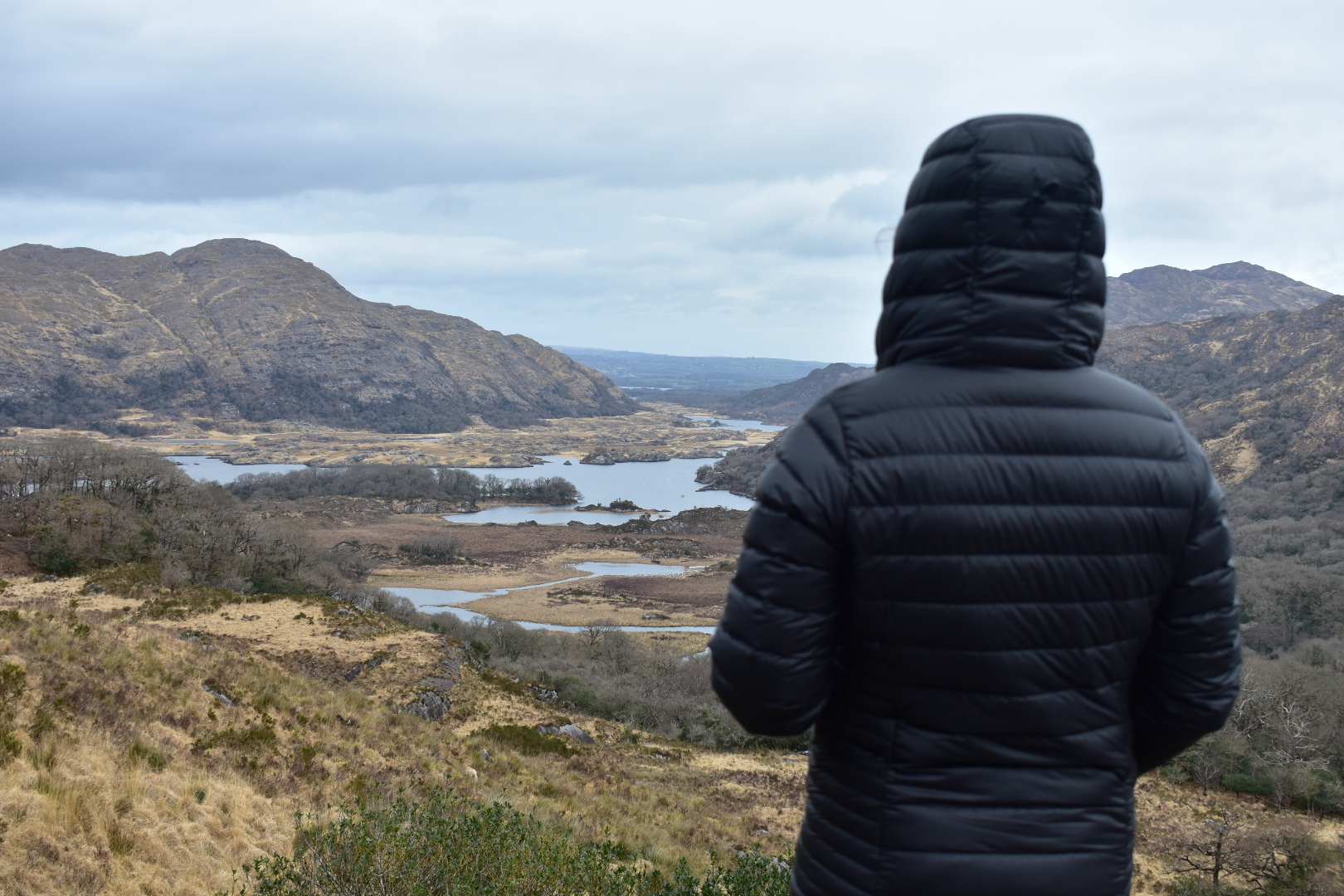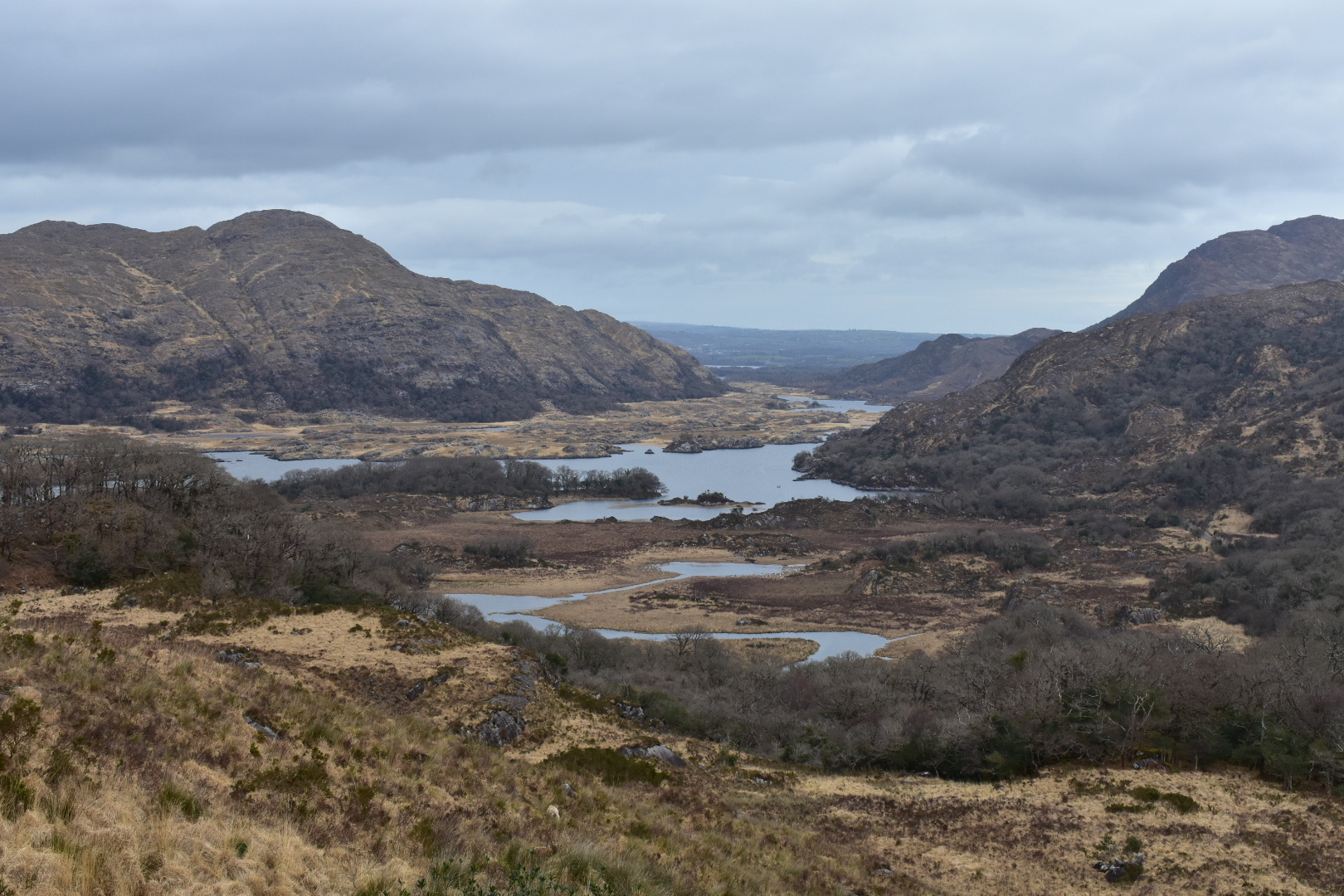 Today would be spent driving around the Ring of Kerry peninsula. During peak season, cars traverse the 111 mile route and have to battle tour buses for a spot on the super narrow backroads. Lucky for us, it’s not quite “on”-season, so we didn’t anticipate too much traffic. Unlucky for me, I didn’t get a good night’s sleep and my stomach didn’t feel so great when I woke up. (Irish cuisine hasn’t been the healthiest experience…) The first stop on the drive was Ladies View. Queen Victoria’s ladies-in-waiting visited here during the royal visit in 1861. They were so taken with the view that it was named after them. Very scenic spot! From here, we wanted to drive the Gap of Dunloe but were stopped by construction workers repairing the road. The work was estimated to take a few hours so we decided to go a different route. This worked out for me because I was feeling awful so I slept in the car a bit. Jared ended up taking us up through Ballaghbeama Gap, and the scenery was spectacular. The grass and moss offset the grayness of the underlying mountains, and there were sheep everywhere we looked!