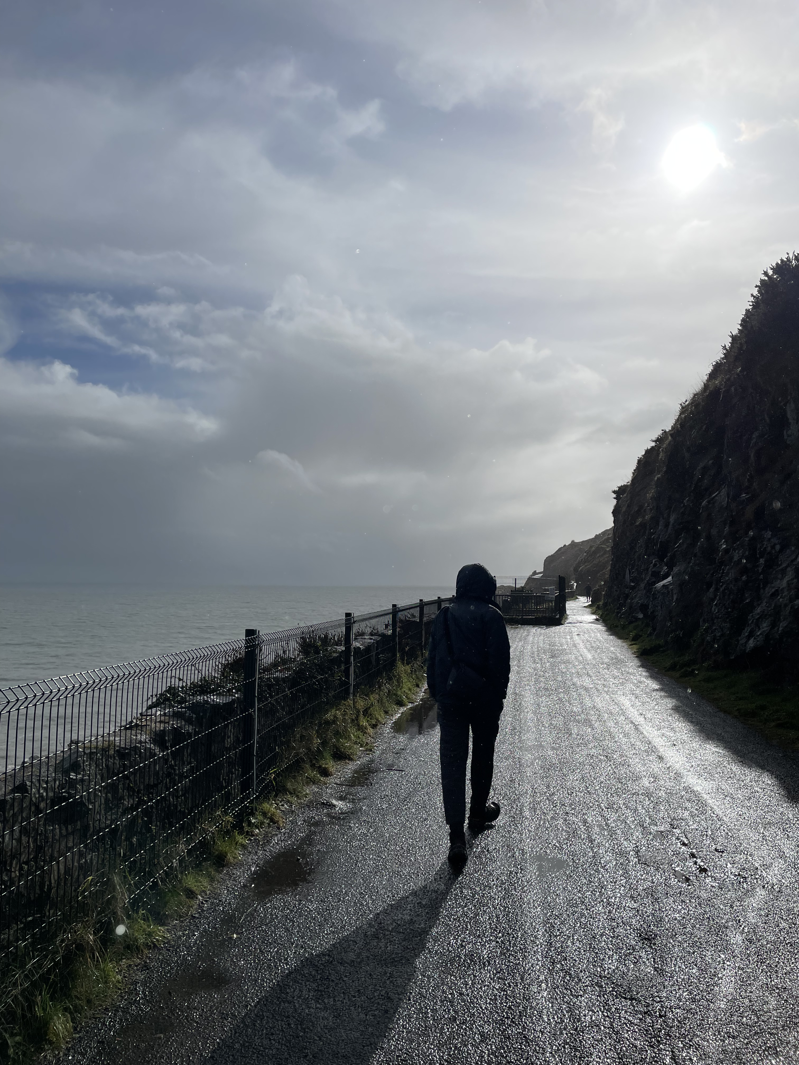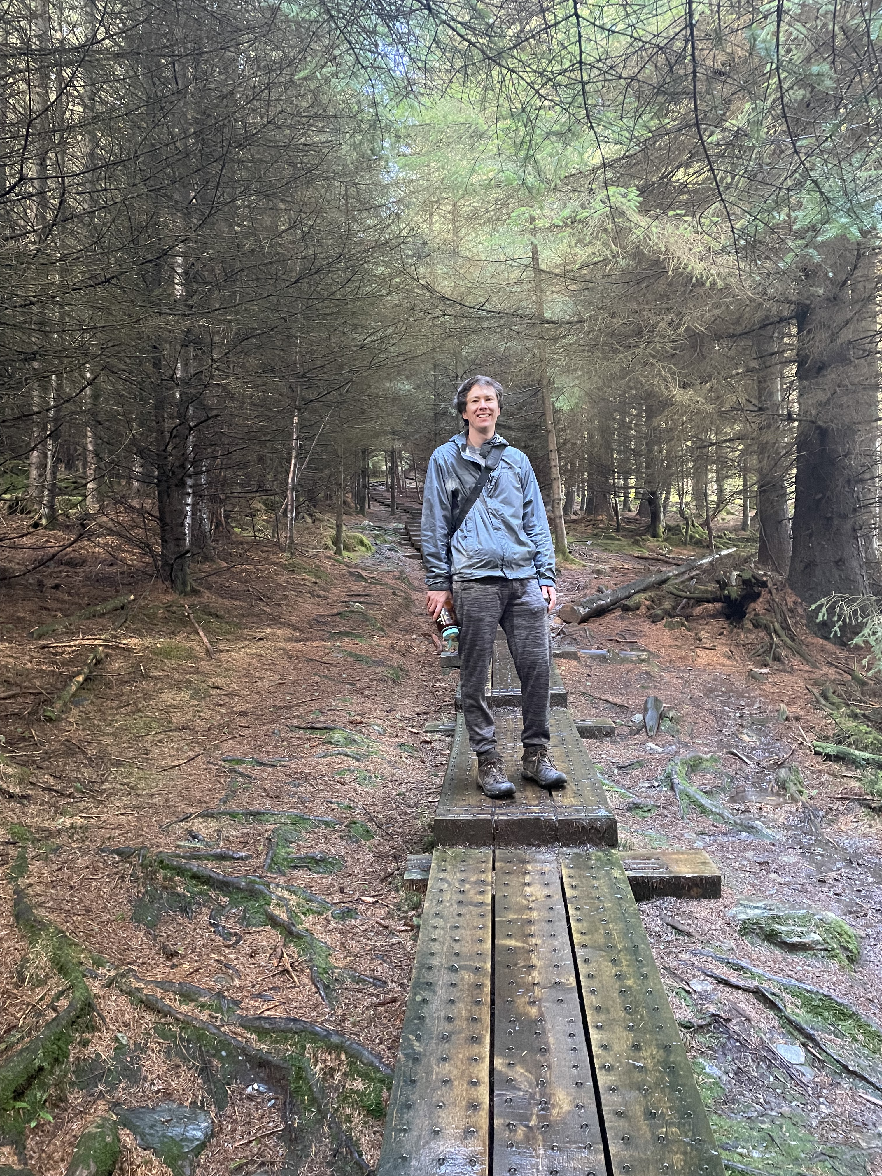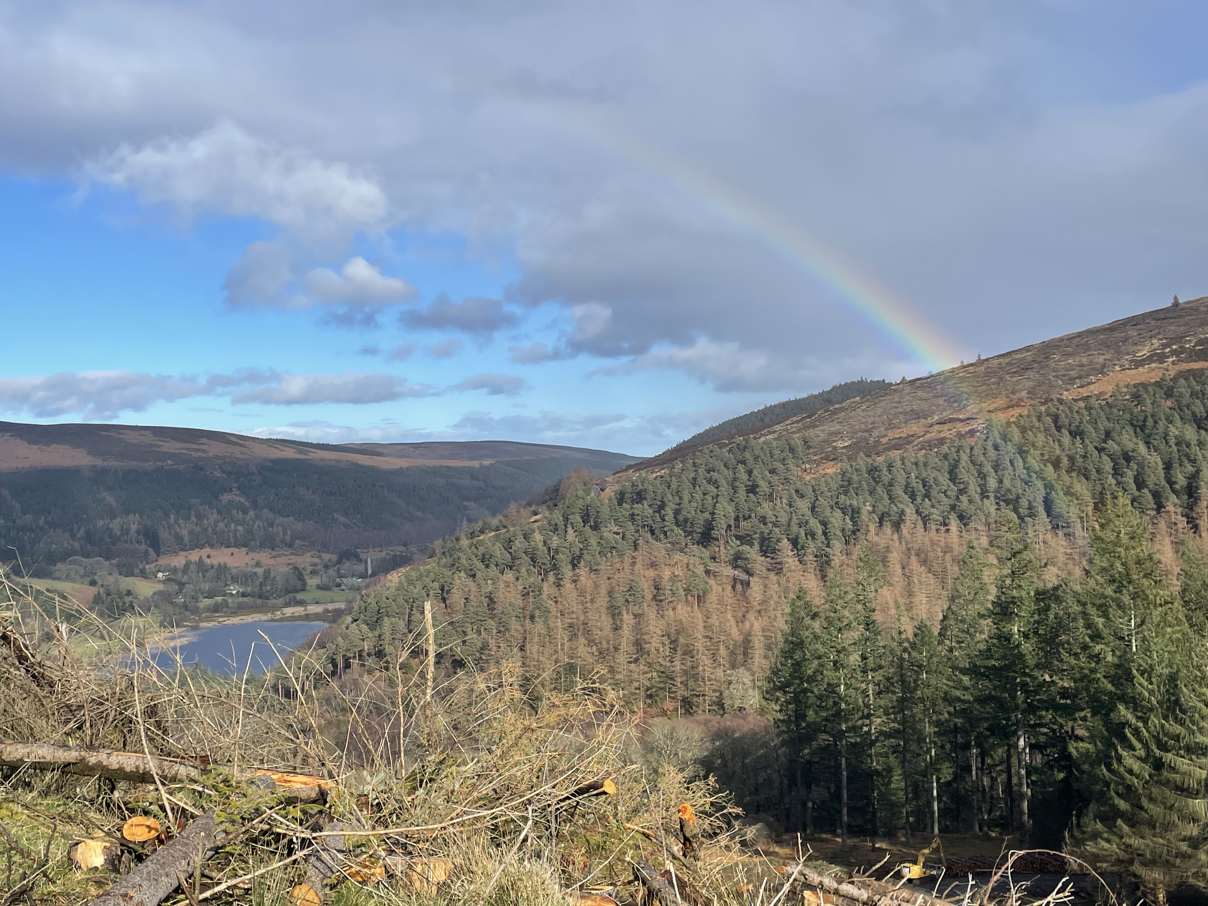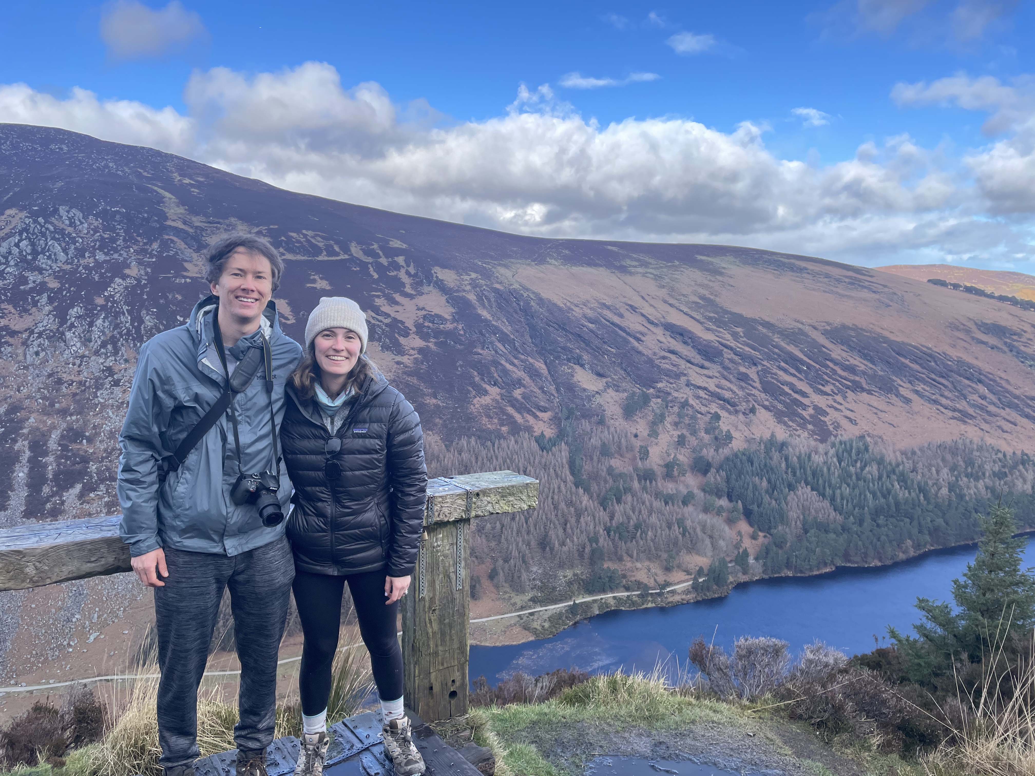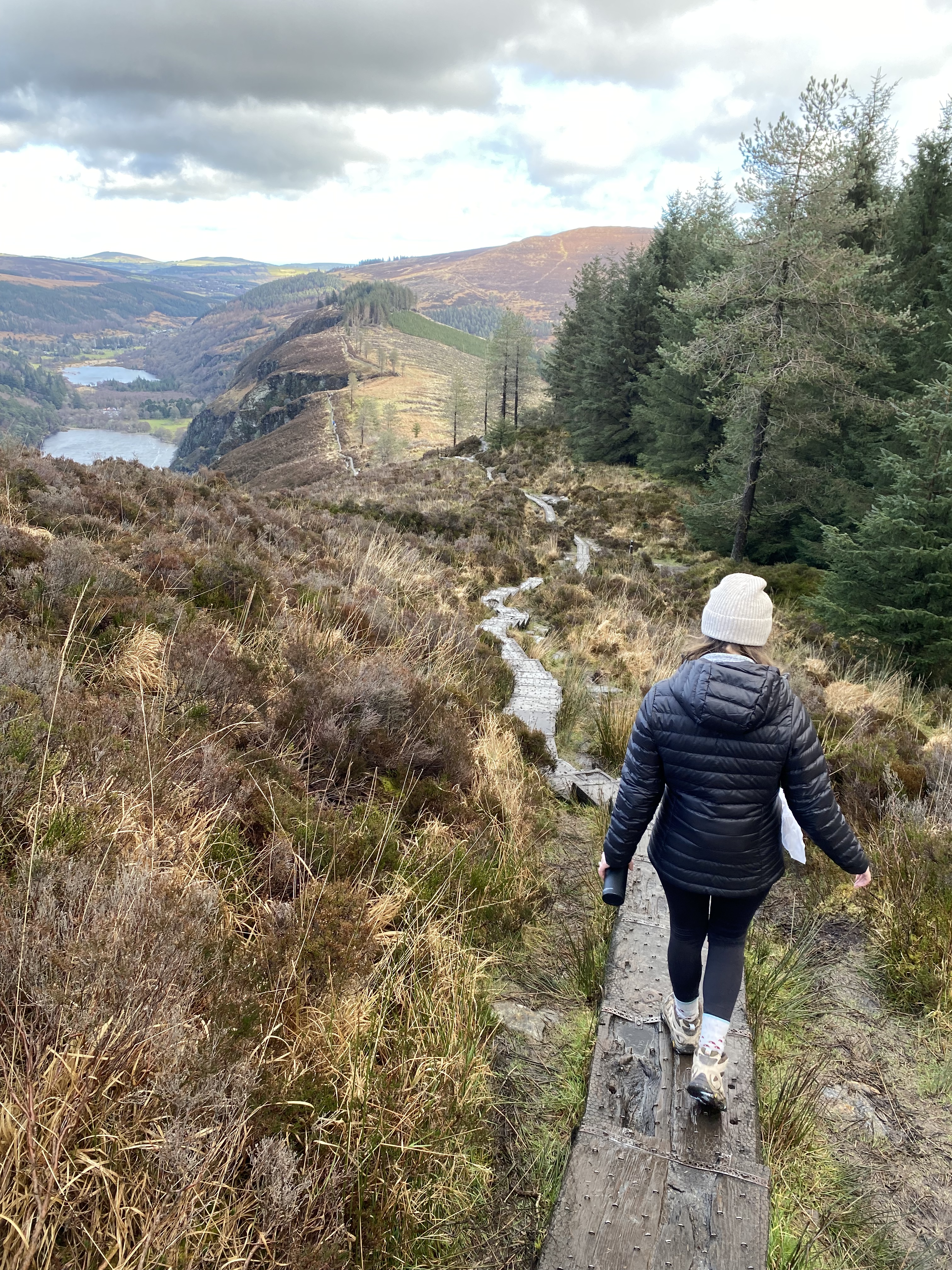 Now, Glendalough is a glacial valley in County Wicklow, renowned for an Early Medieval monastic settlement founded in the 6th century. Not only that, but there’s a beautiful glacially- carved lake (Upper Lake) around which there were many hiking options. We parked in the Visitor center and walked the ~1km to Upper Lake, just as a quick rain shower was rolling in. after waiting under a tree, we walked to the lake and ate our sandwiches, as my head started to droop from fatigue. Somehow, Jared managed to convince me to do the harder of two hikes (one was a flat five k around the lake, while the other was 5 k with a 1,000 feet ascent). Boy am I glad we went for the one with a view (Spinc Walk). Through a mix of rain and sun and rain and rainbows, we climbed through dense forest and slippery pathways to make it to the viewpoint above with an aerial view of the lakes. It was stunning to see the Wicklow Uplands and valley below. At some points it was a pretty sheer cliff drop, so it was a little nerve- wracking with the slick conditions! It was also nice that the hike was a loop, so we hugged the lake all the way back down to the bottom.