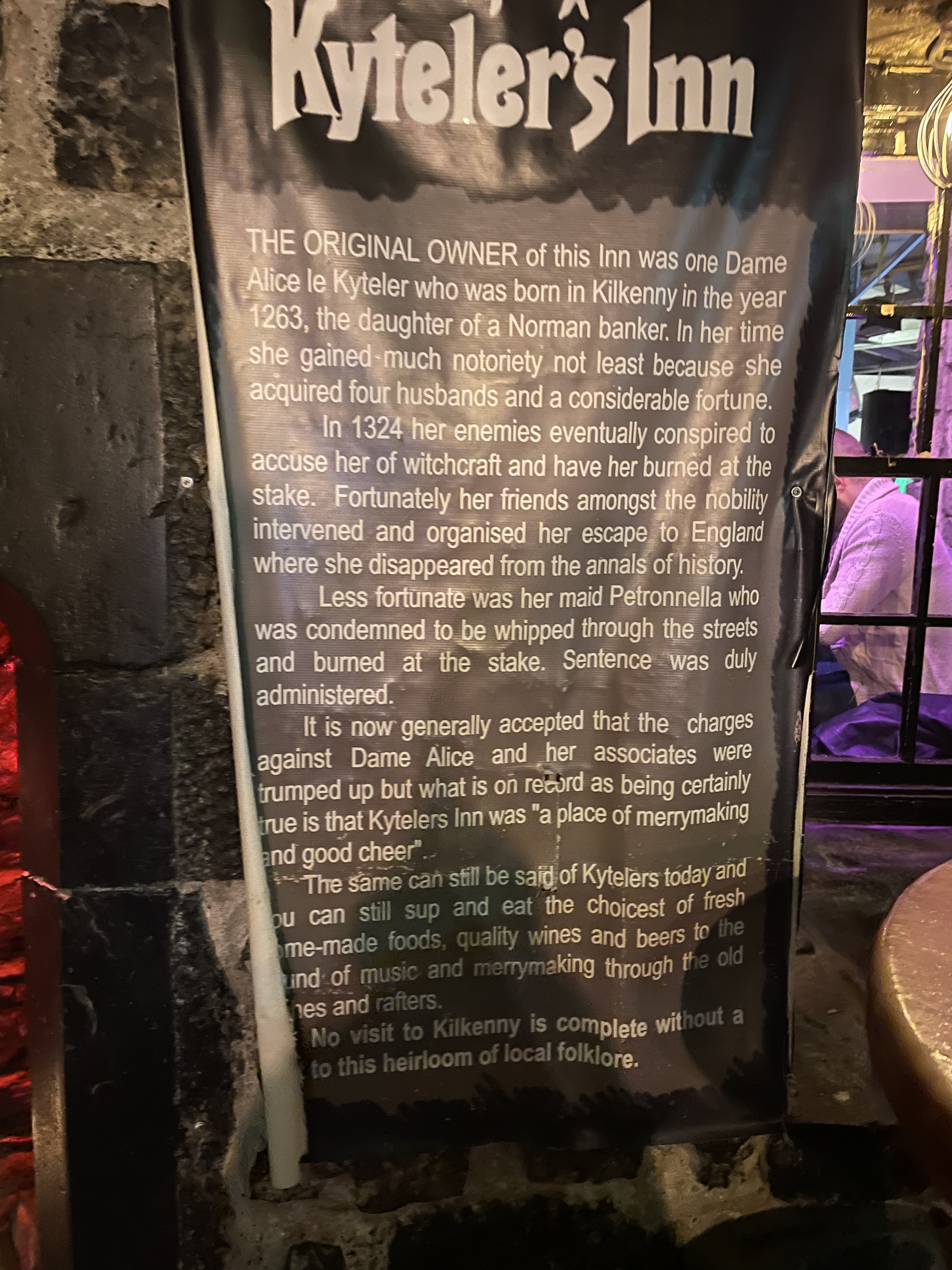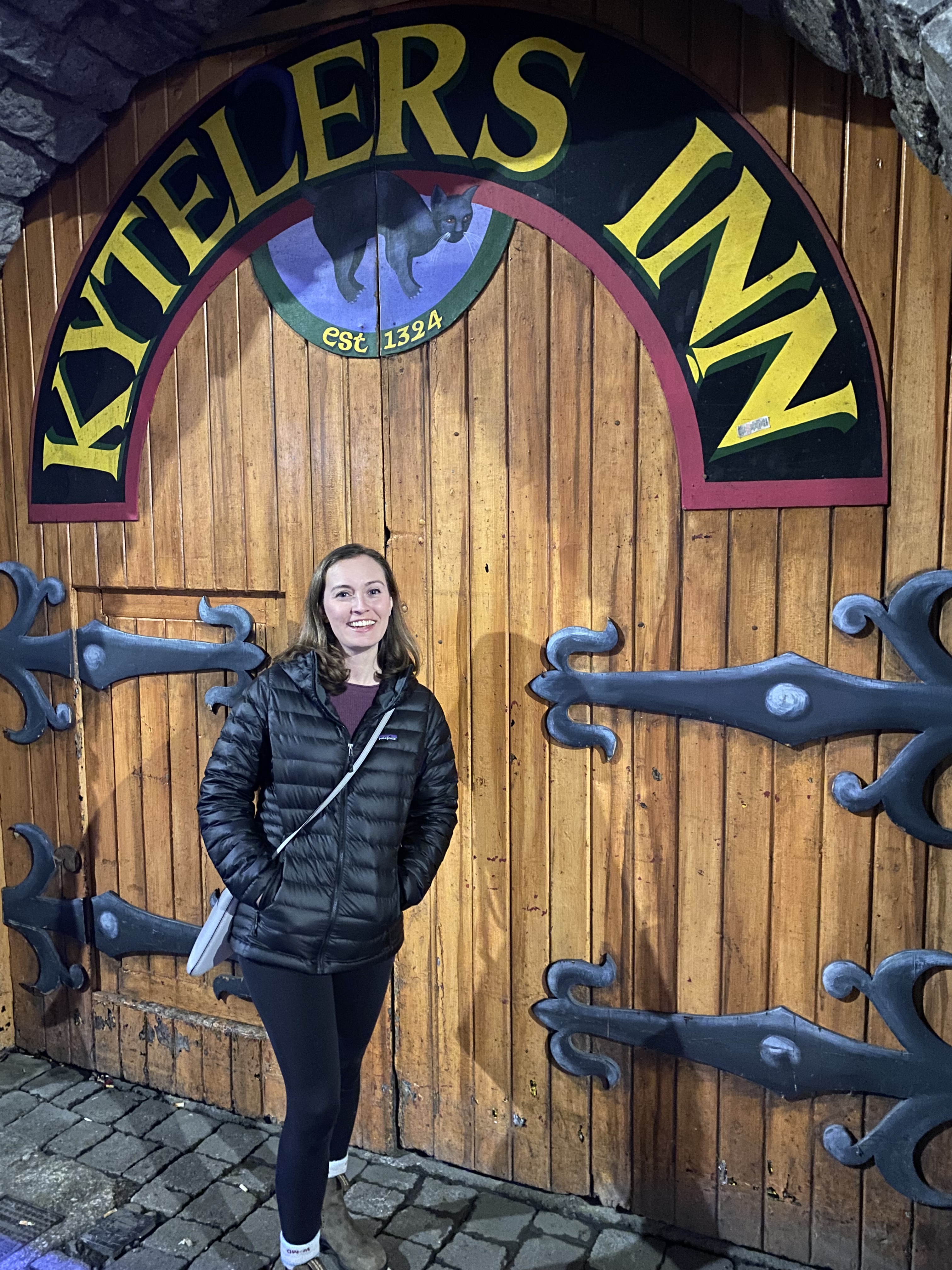 After Glendalough, we were back in the car on the way to Kilkenny. We only had a night here so we were go go go after we checked in to the Airbnb. Our Airbnb was a perfect location – right along the river and a cute room in an 1850s Irish home. The hosts were probably the friendliest I’ve ever interacted with, and Joe had a bunch of recommendations for dinner and drinks. He gave us coins for parking since we only had euro bills – talk about Irish hospitality! After we got cleaned up for dinner, we walked over to Kyteler’s Inn. I had written this on the PowerPoint because there was an interesting backstory. The original owner of the inn, Alice le Kyteler, born in 1263, was accused of being a witch and sentenced to being burned at the stake. She worked with her friends to escape to England, and her maid ended up getting burned at the stake, which marked the first witch burning in Europe. Unfortunately we didn’t see any ghosts roaming around but was very cool to eat in an establishment over 800 years old. We ended up walking around town after dinner and stopped for one more pint of Guinness before heading home – so nice that every place was walking distance.