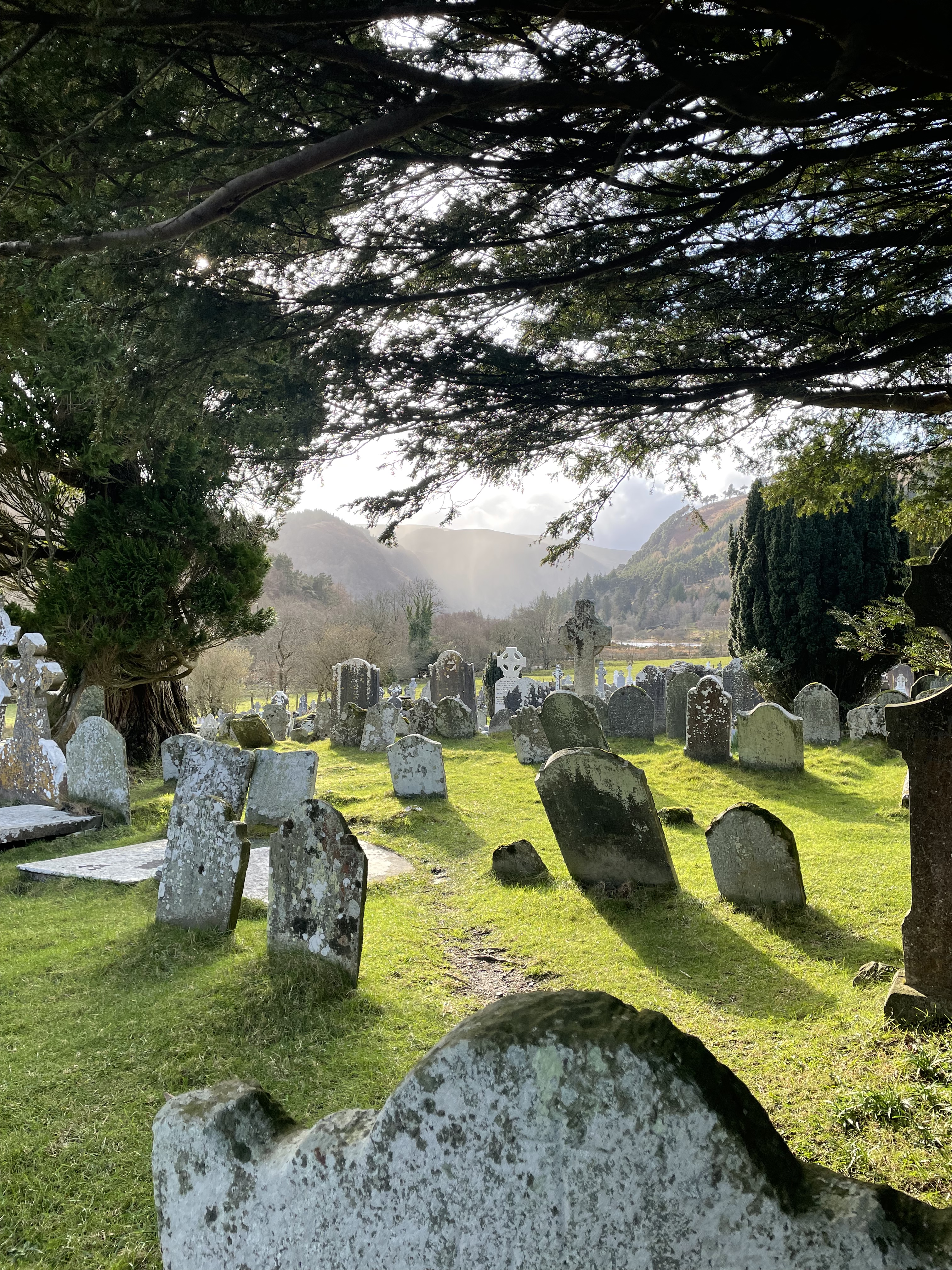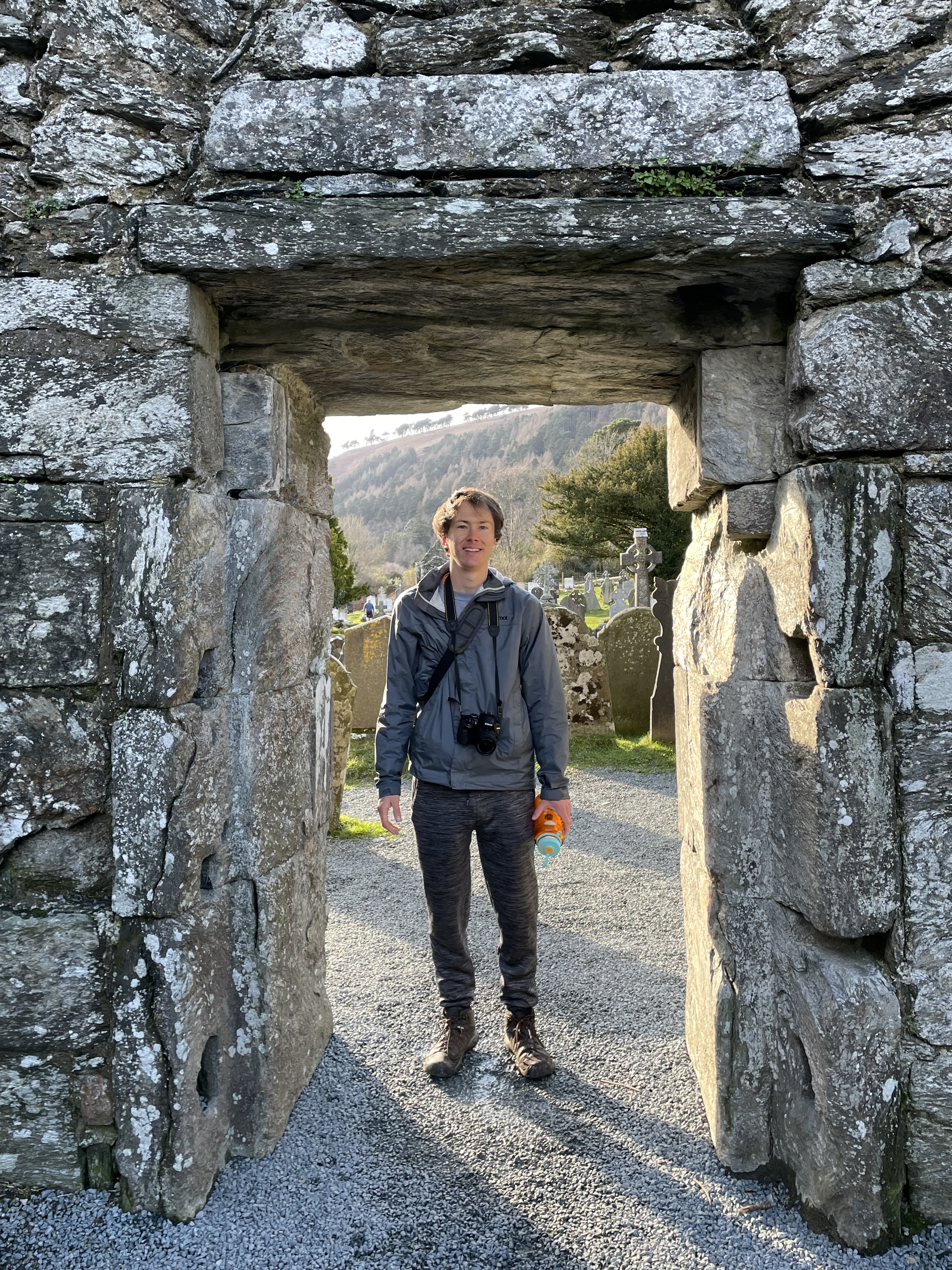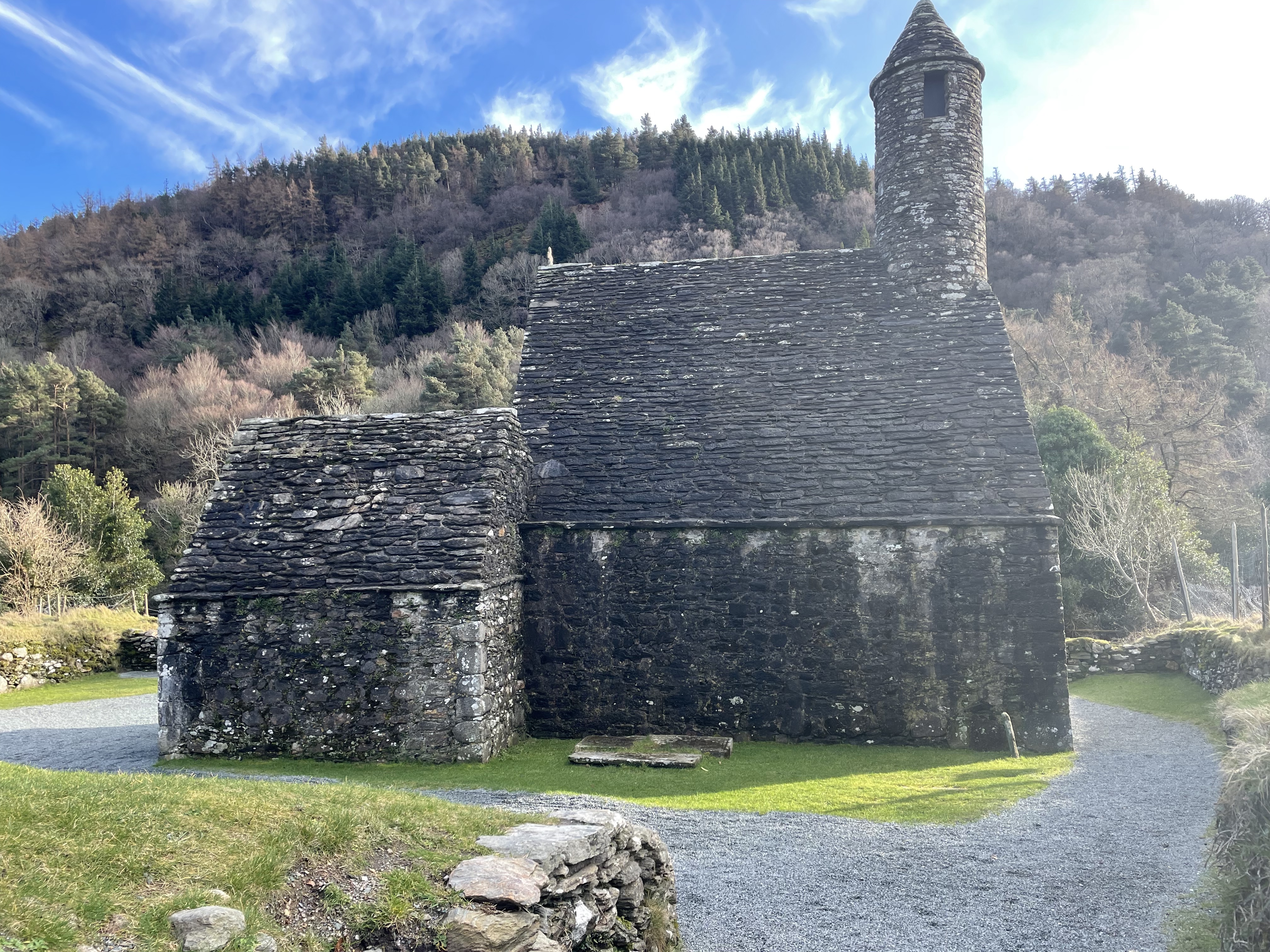 After getting back to the bottom of the loop, we still had the 1k back to the car. Along the way was the monastery site, which is what I was excited about seeing. This early Christian monastic settlement was founded by St. Kevin in the 6th century and from this developed the “Monastic City”. Most of the buildings that survive today date from the 10th through 12th centuries. There was a graveyard within the perimeter of the site, which made it a little eerie! One of the structure, the round tower, was built over 1,000 years ago and stands 33 meters above the ground. Talk about mind-boggling – how did people manage to build that so long ago without modern day machinery?! Very cool.
