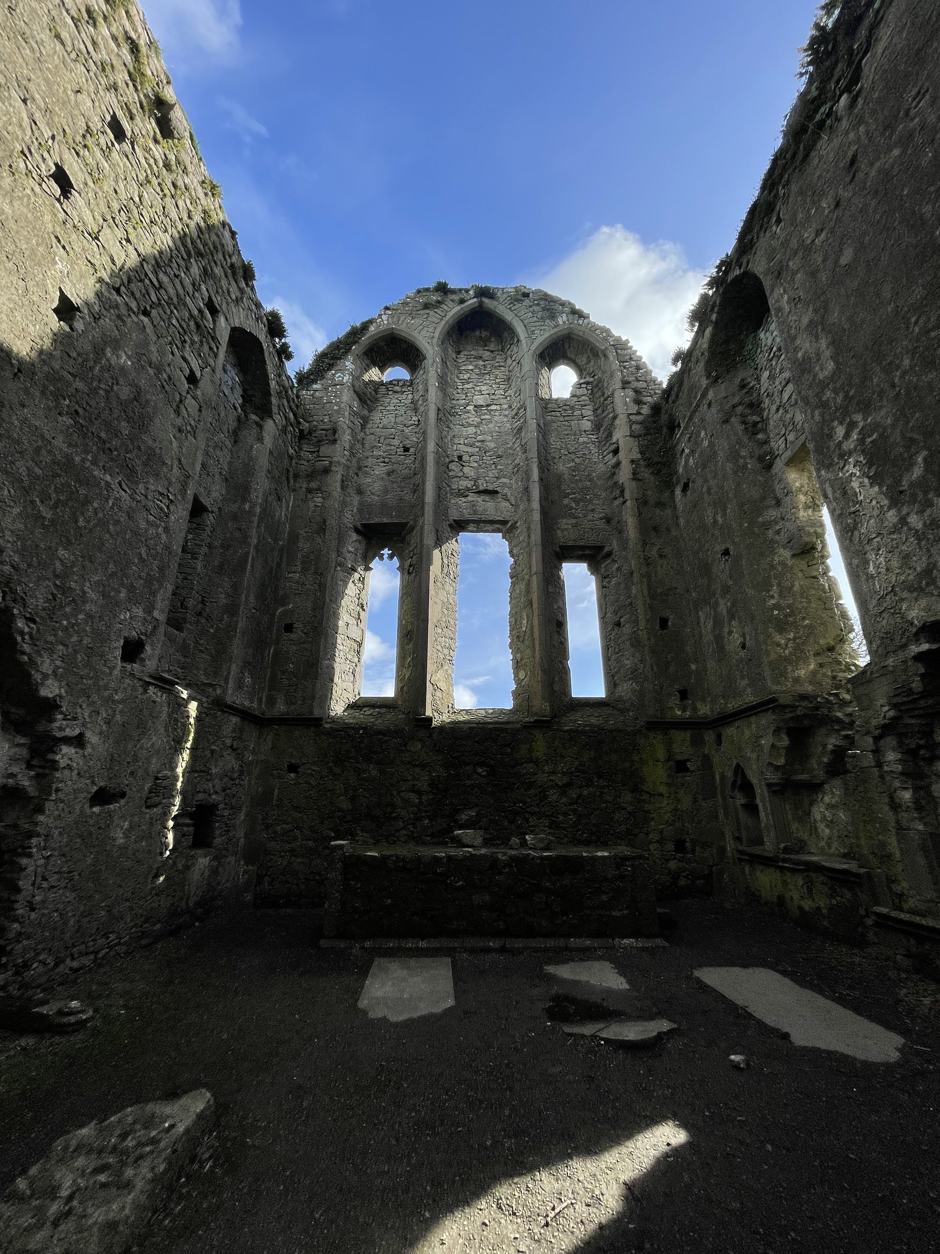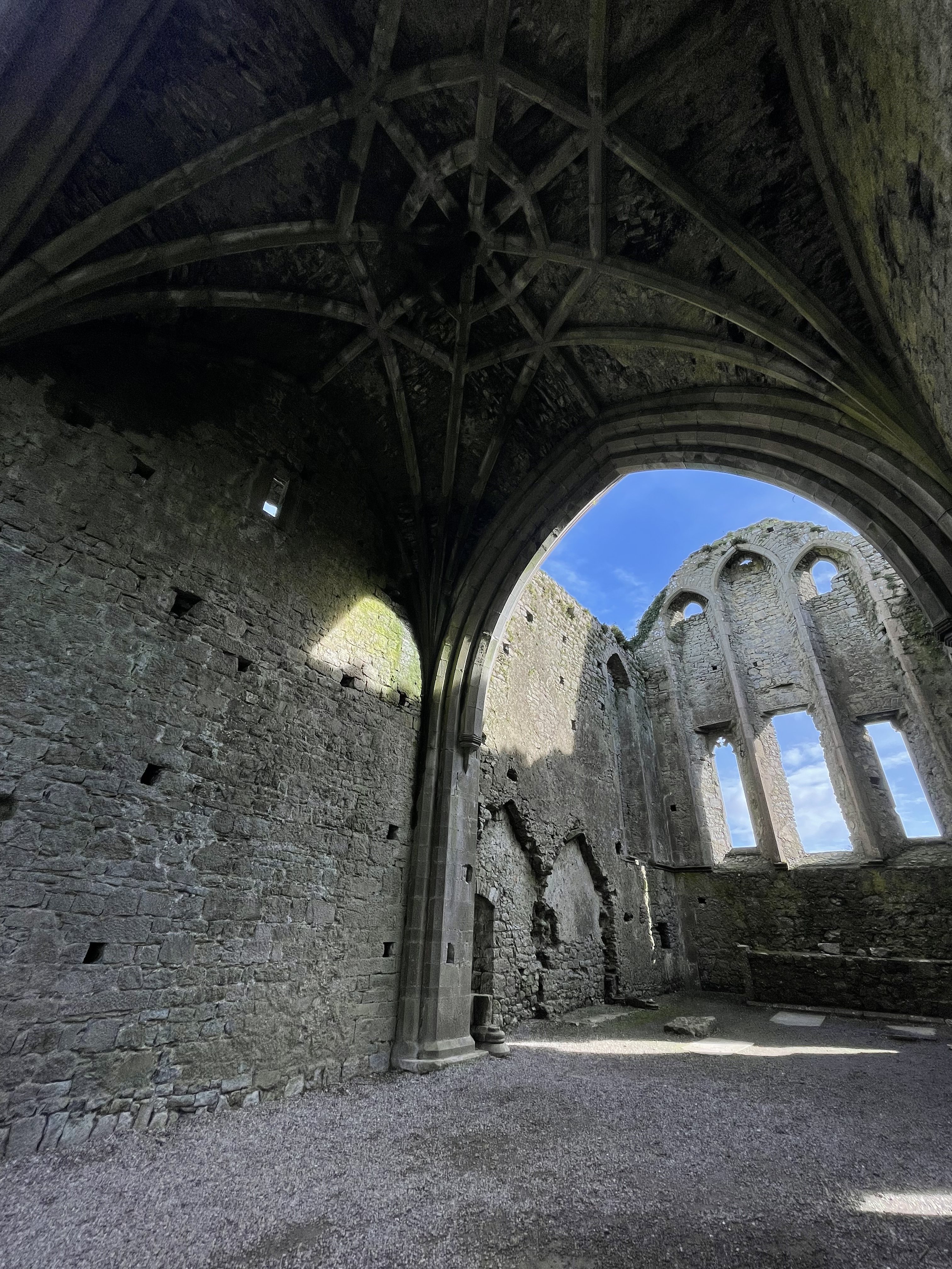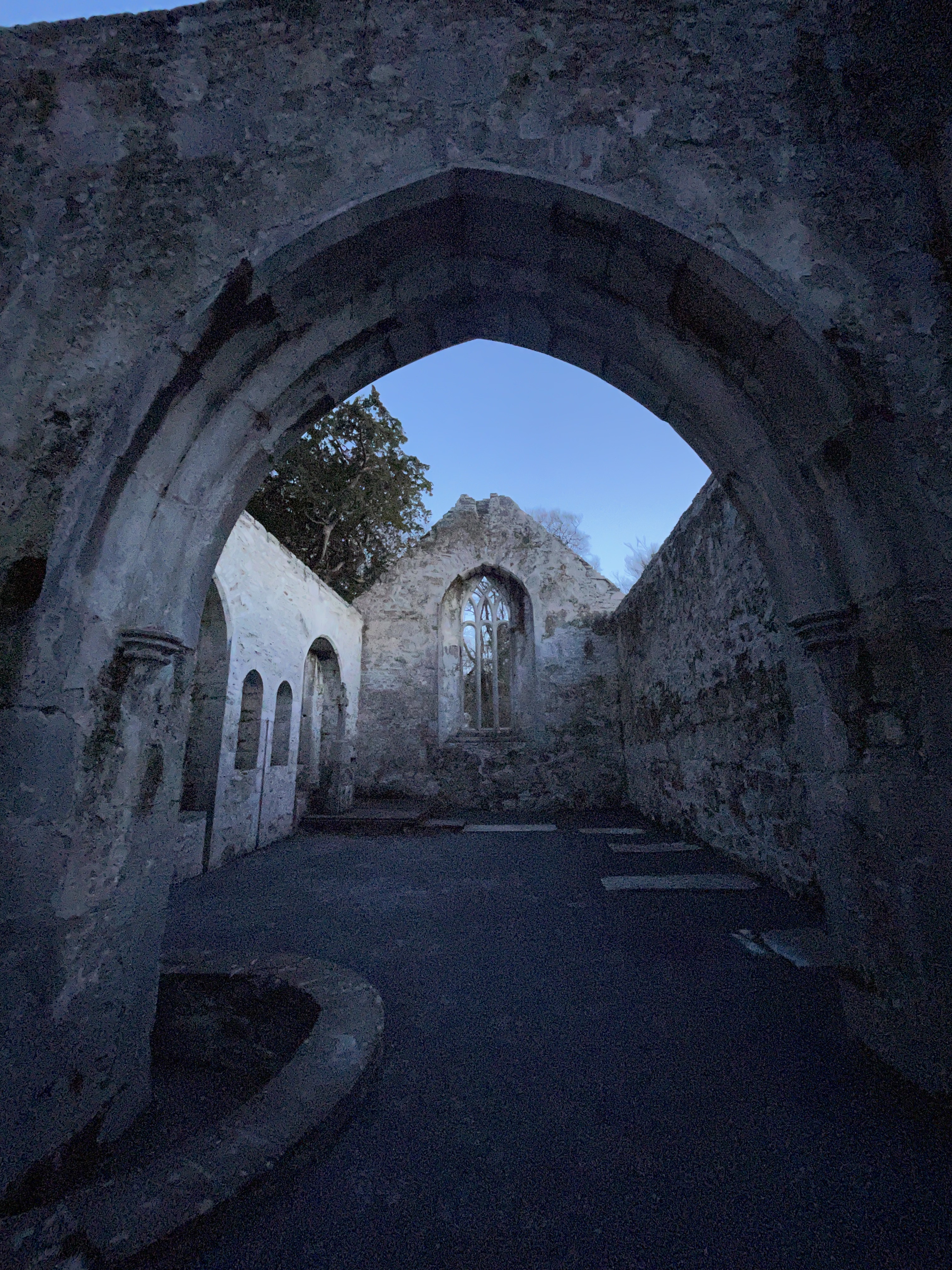 The tour lasted about 45 minutes, and we headed to a store next to the parking lot. Everything was pretty well-priced, and we both ended up getting an Irish wool sweater! (I am a huge fan of anything made of wool.) After this, we got in our car and made our way towards Kinsale, a small seaside town in county Cork recommended by our Airbnb host. He also recommended we go to a restaurant called Fishy Fishy so we put that in our GPS and were on our way! We pulled into Kinsale around 2 and walked to the restaurant. Now, this was on a Monday. We got to Fishy Fishy and they had a sign on this door “gone fishing, back Wednesday” ha! We were bummed we didn’t get to eat there but hey, at least it’s very fresh food. We ended up finding a cafe and walking around the beautiful, narrow, colorful streets for a bit before heading to our final destination of the day, Killarney. Before going to the hotel, we drove into Killarney National Park (all parks are free in Ireland) and walked to Muckross Abbey. The abbey is an abandoned ruin of a Franciscan friary of Irrelagh, founded for the Observatine Franciscans about 1448 by Daniel McCarthy Mor. The present well-preserved ruins include a church with a wide, square tower and fine windows, and a vaulted cloister with an arcade of arches around a square courtyard. It was kind of eerie walking around at dusk and being the only ones there – the entire abbey was open to explore, so we walked up dark, spiral staircases and into hidden chambers.
