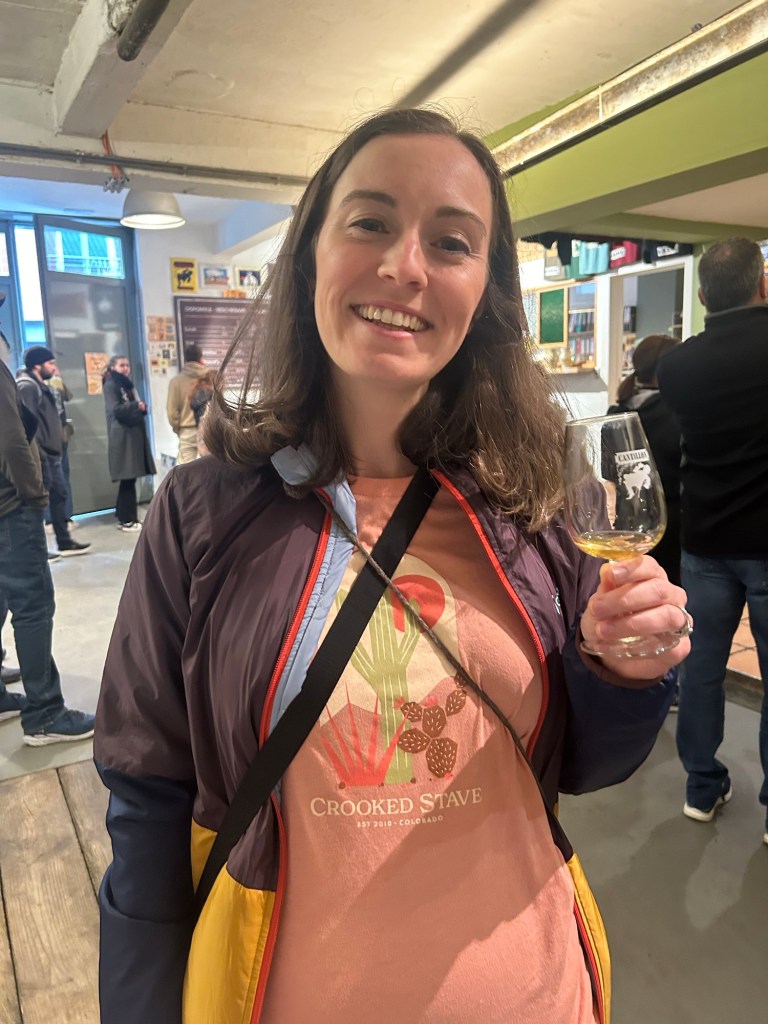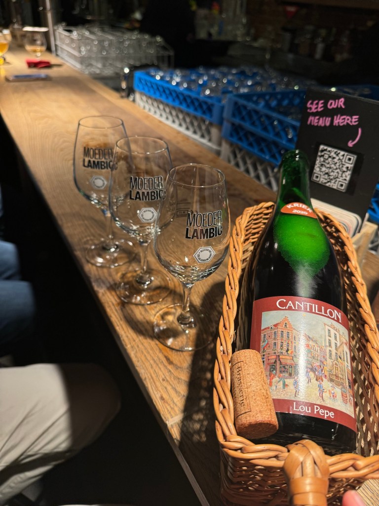 For a little history, once a year, “Cantillon orchestrates a worldwide event featuring a beer made specifically for a few select accounts around the globe for a simultaneous toast of this fleeting beer. This magical fun day is known as Zwanze, a word that refers to a sarcastic style of humor, often noted in the specialty beer’s playful nature and ingredients”. I made sure to wear my Crooked Stave shirt since that was the Colorado brewery participating in Zwanze! Our tickets got us in to Moeder Lambic Fontainas, where our ten tickets got us pours of beers, full bottles, and a tasting of the 2024 Zwanze.