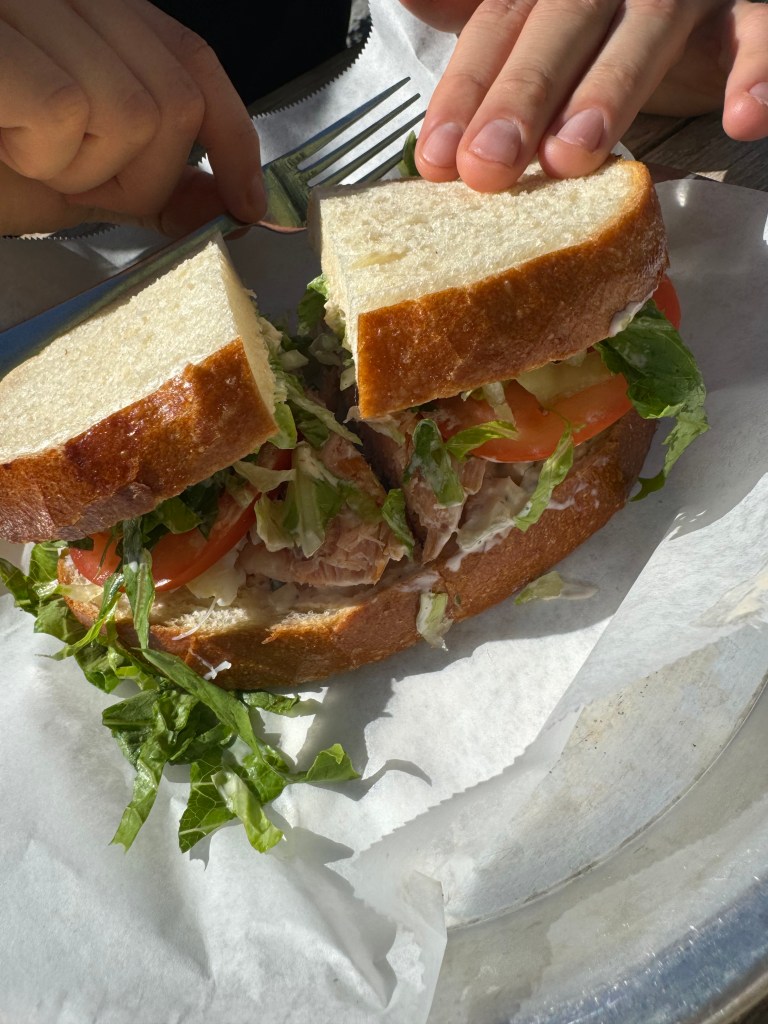 We started the morning by visiting Trilogy Sanctuary , a really cool rooftop cafe with yoga on the patio. We split a “Shroomed” latte and breakfast bowl – delicious (but almost too healthy tasting!). Our sea kayak tour was at 11AM, and we were a little dismayed to see all of the fog. We checked in with Bike and Kayak tours for our excursion, and by the time we got on the water, the weather had turned and the sun was shining through! Unfortunately, we didnt bring our phones / sunglasses on the water (on their recommendation with risk of losing them), so no picture evidence but it was beautiful to be kayaking on the reserve, and we learned a lot about the wildlife. The tour itself was a “sea caves” tour, so we floated to the cliffs and even got to kayak through one of the sea caves. Also, we got to get up close and personal with the local sea lions and that was a really cool experience – some were swimming in the waters near the kayaks! On the way back to shore after an hour and a half, we even got to see a bunch of leopard sharks a few yard from shore (they’re completely harmless to humans – over the summer, they come by the hundreds to mate in the shallow waters). Very cool experience!