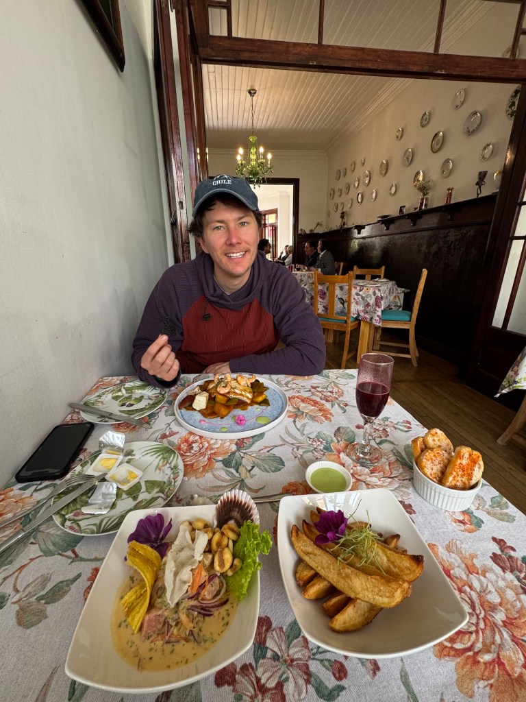 We then made our way back to Punta Arenas, eventually arriving around noon. Not yet tired of Chilean Patagonian cuisine, we sought out another seafood restaurant for lunch. After getting refueled with some coffee and grabbing our bags from the Airbnb, we went to Restaurante Ventisca for lunch, where I got a delicious leche de tigre ceviche and Jared got a succulent white fish plate (with a calafate sour OF COURSE). After walking around the city a bit (quite a big port town), we headed to the airport to drop off our car and then catch our LAST intra-country flight back to Santiago.