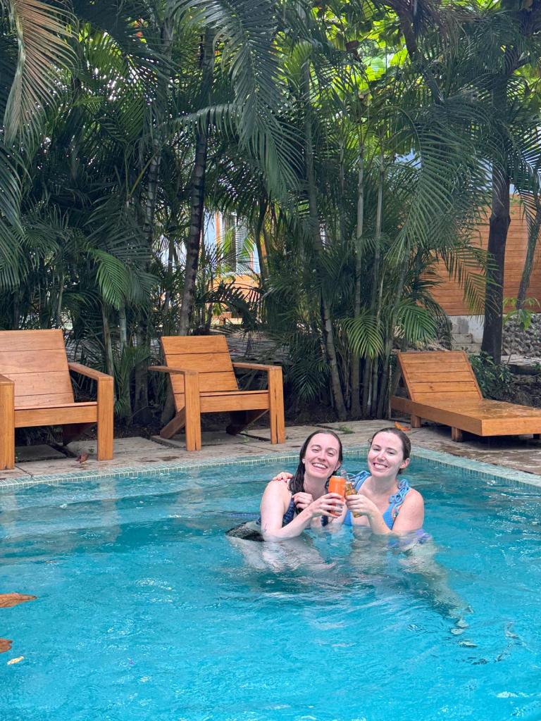 After the lesson, the girls walked over on the beach trail from Playa Pelada and we all grabbed some food and drinks together. After some tasty papaya margaritas, we meandered back to the beach to get some “sun time” – queue foreshadowing. One thing we noticed in CR, since we visited during rainy season, was that the mornings started with full sun, then transitioned into rain in the afternoon to round out with gloomy/muggy nights. So, we got < 30 minutes on the beach before we felt threat of rain before making our way back to the Airbnb. We made the most of it and swam in the pool before we got out to get ready for our 5:15 “sunset” dinner reservation. 😉