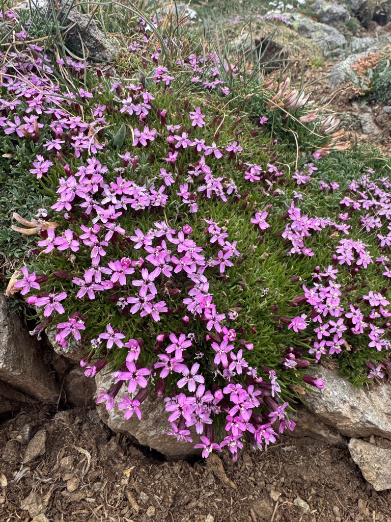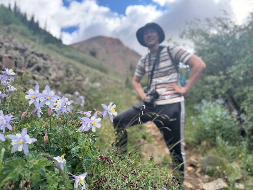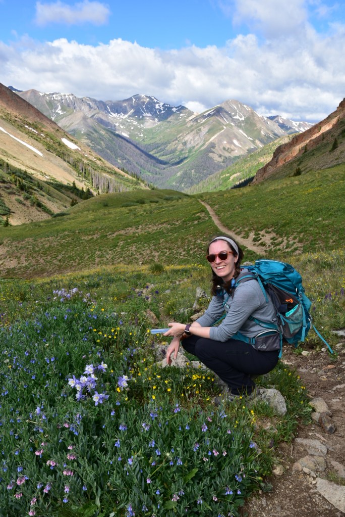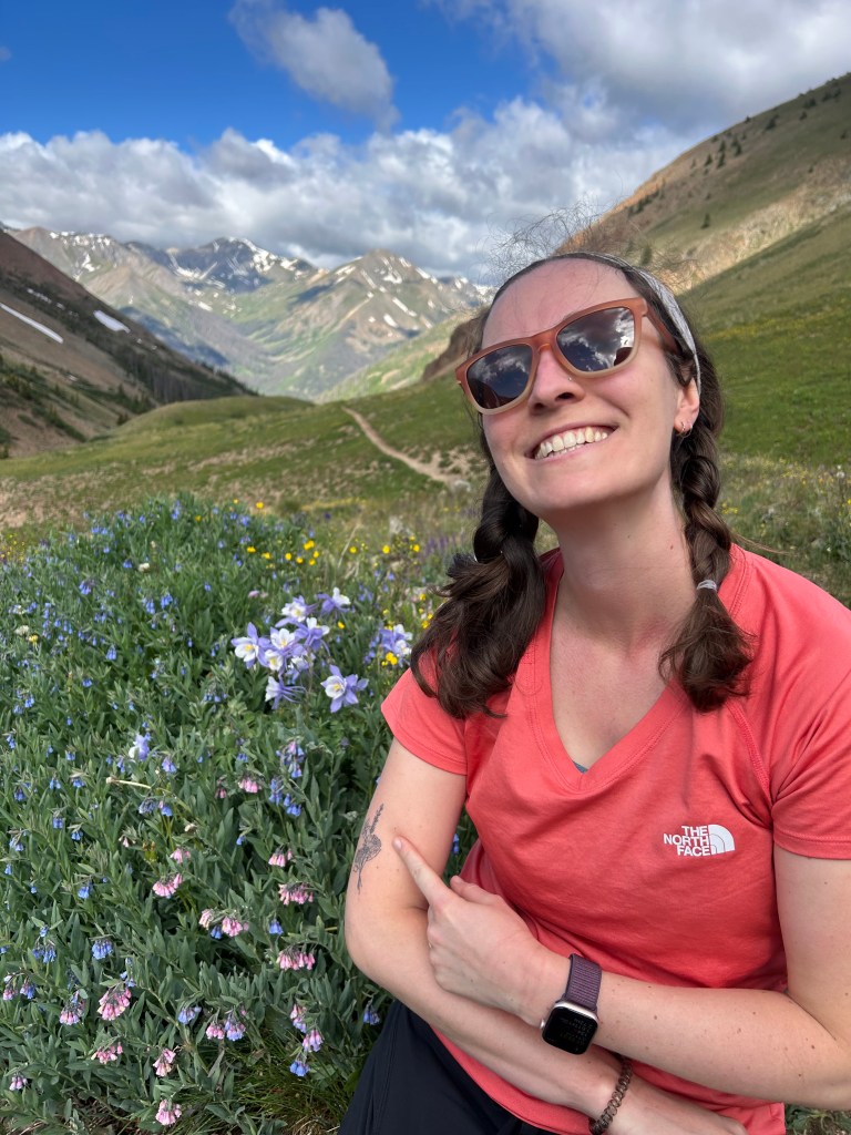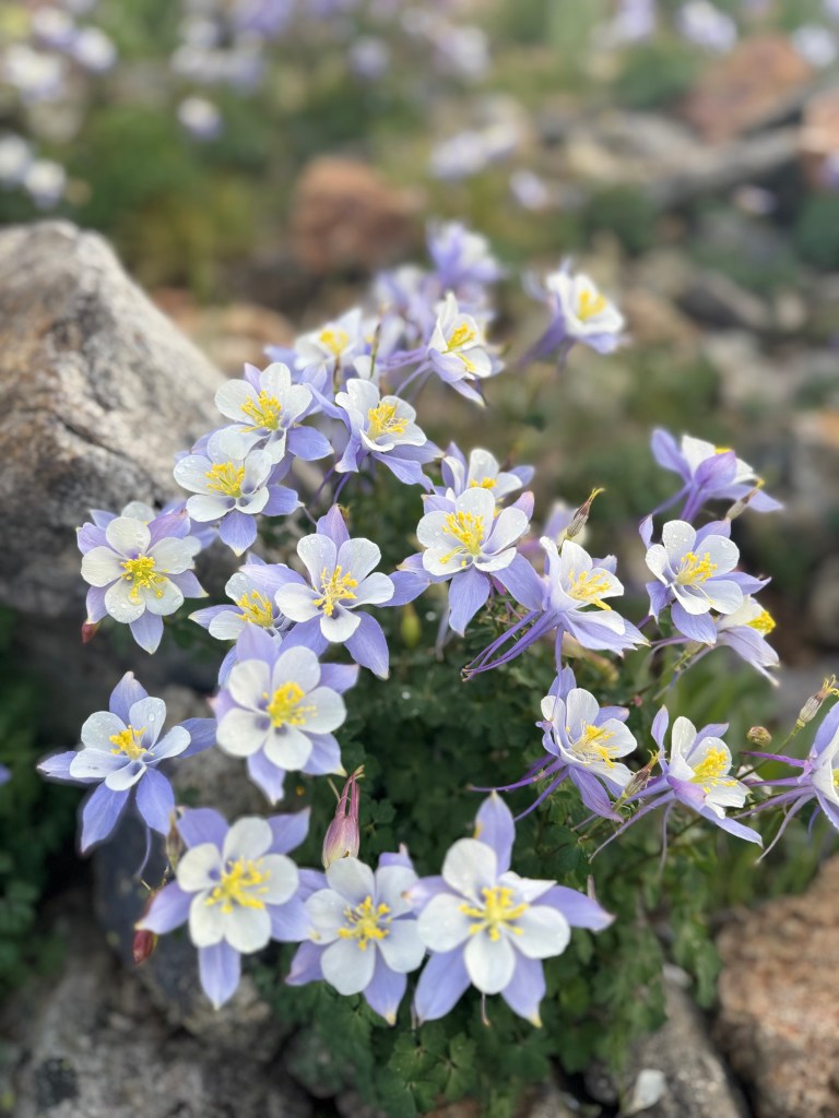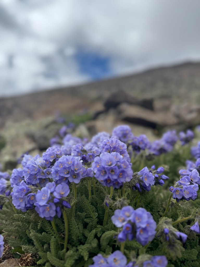 The first two miles of the trail weaved through alpine tree coverage and we were aware of how quiet it was without anyone else hiking near us. The hike’s elevation gain started quite abruptly, way before my body was ready to begin climbing, but a good way to get the heart rate up. Shortly, we were in a rhythm, breathing in through the nose, breathing out through the mouth, and inhaling the scent of citrusy pine and self-grit. We were gaining elevation in no time, and shortly found ourselves about three miles into the hike and in a basin filled with wildflowers as far as the eyes could see. There were Columbine, Indian Paintbrush, Bluebells, wild Geranium and more. We also saw a handful of hikers already descending from what we presumed to be their sunrise hike – very impressive. After taking way too many pictures of flowers, we began to mentally prepare for the steepest and most enduring last two miles of the ascent.