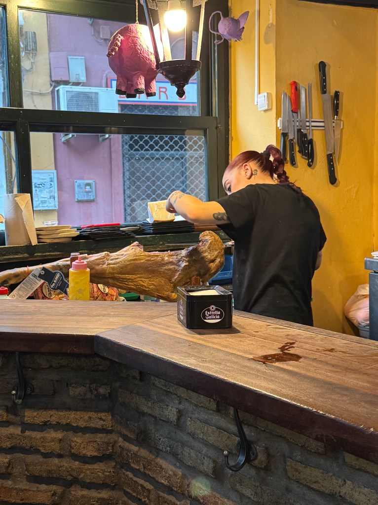 By this point, we were all bonding and sharing stories (we were talking about Christmas traditions and Manuel went through the menu for his family’s Christmas Day), and we still had two more stops to go! Our third stop was Maestro Marcelino, a swanky gourmet shop with cheese and ham tapas. Here, we got to try the best cuts of Iberian ham along with our choice or red or white wine. Yes, yes, I’m Italian but hands down Iberian ham >>> prosciutto. What makes Iberian ham unique you ask? Well, it comes from a specific type of pig that is typically acorn-fed, and the meat is safe enough even for pregnant women to consume. It was so good I got a pack to go for a future Scenic Sammie. When asking Manuel how much a leg of ham would be, he told us if we had 1800 euro we could walk out with our own beautiful leg. If I could take it through US customs, it would have been a strong consideration!