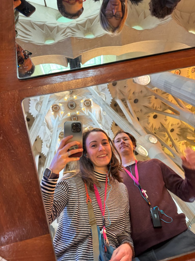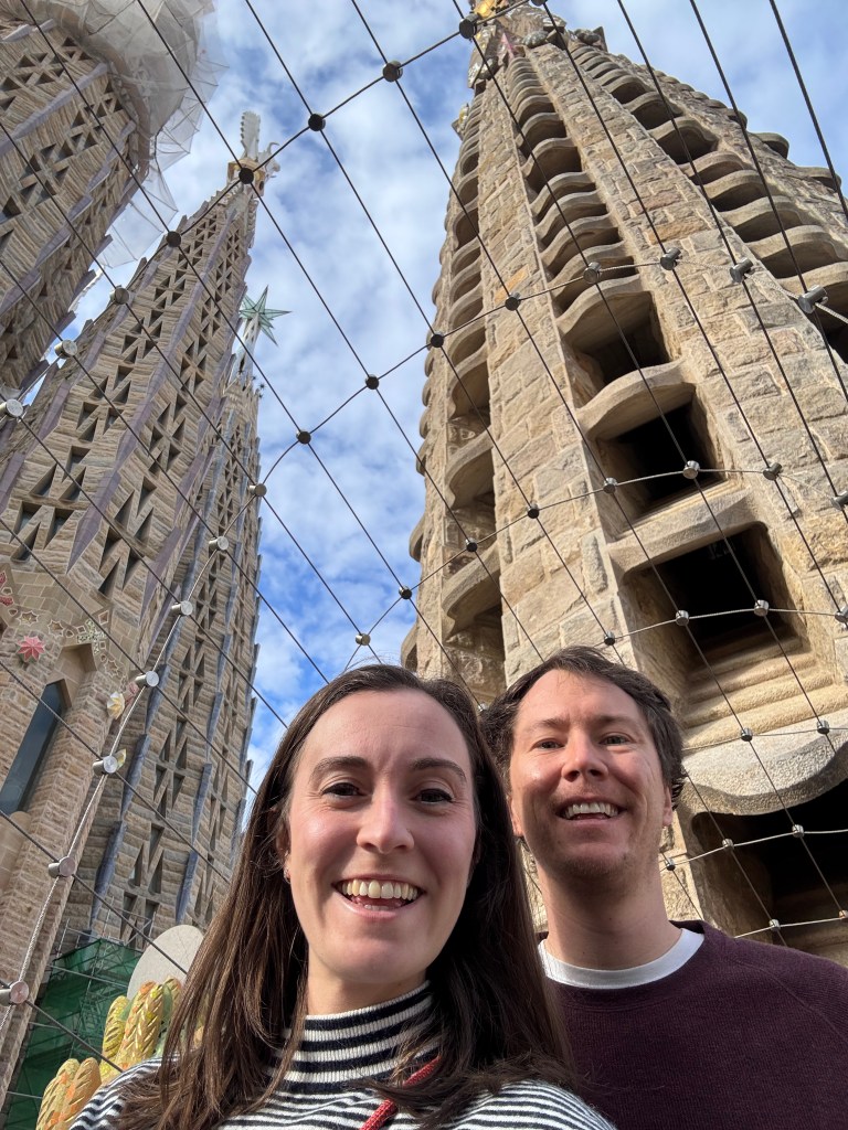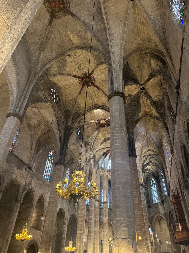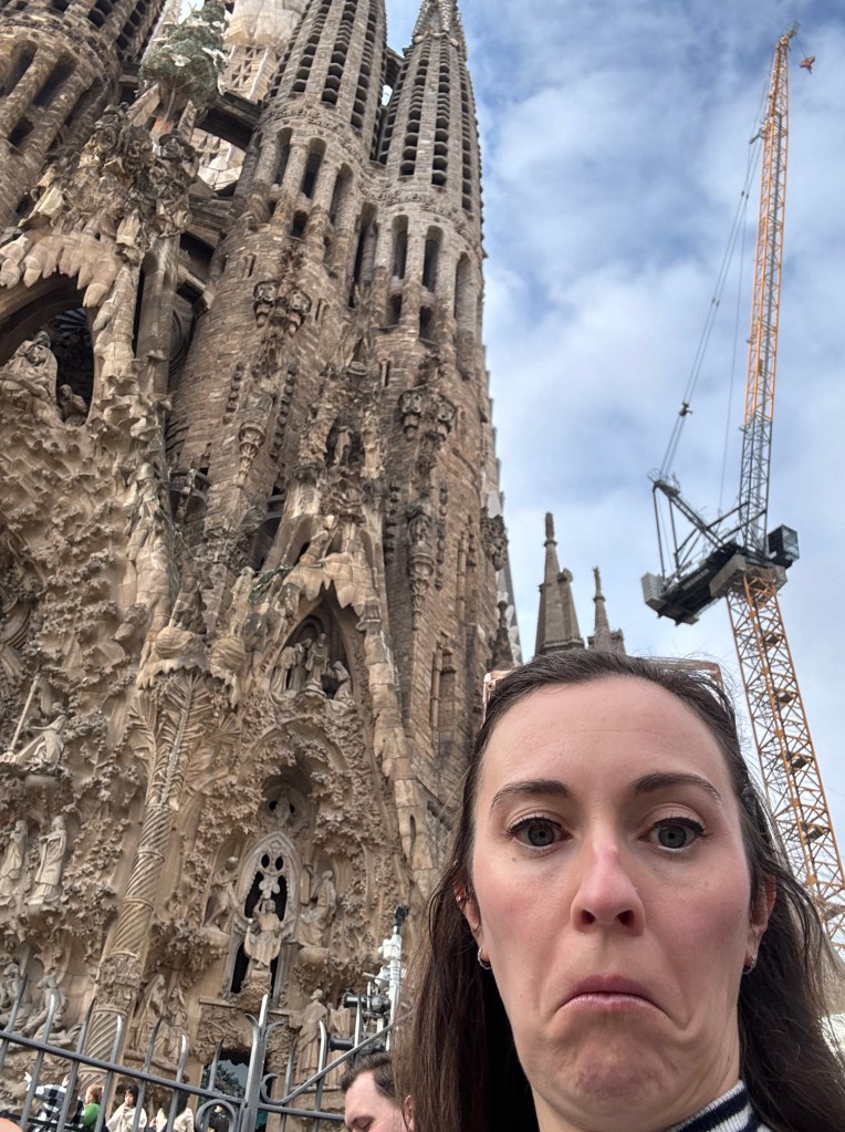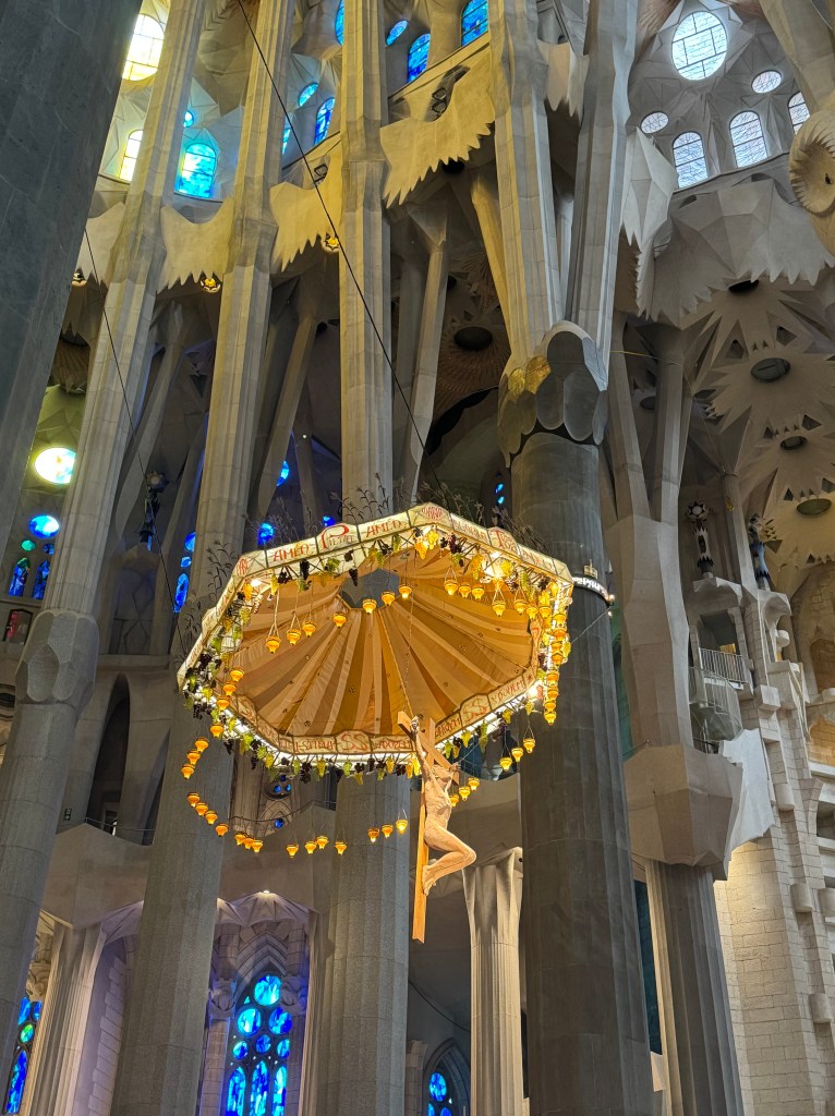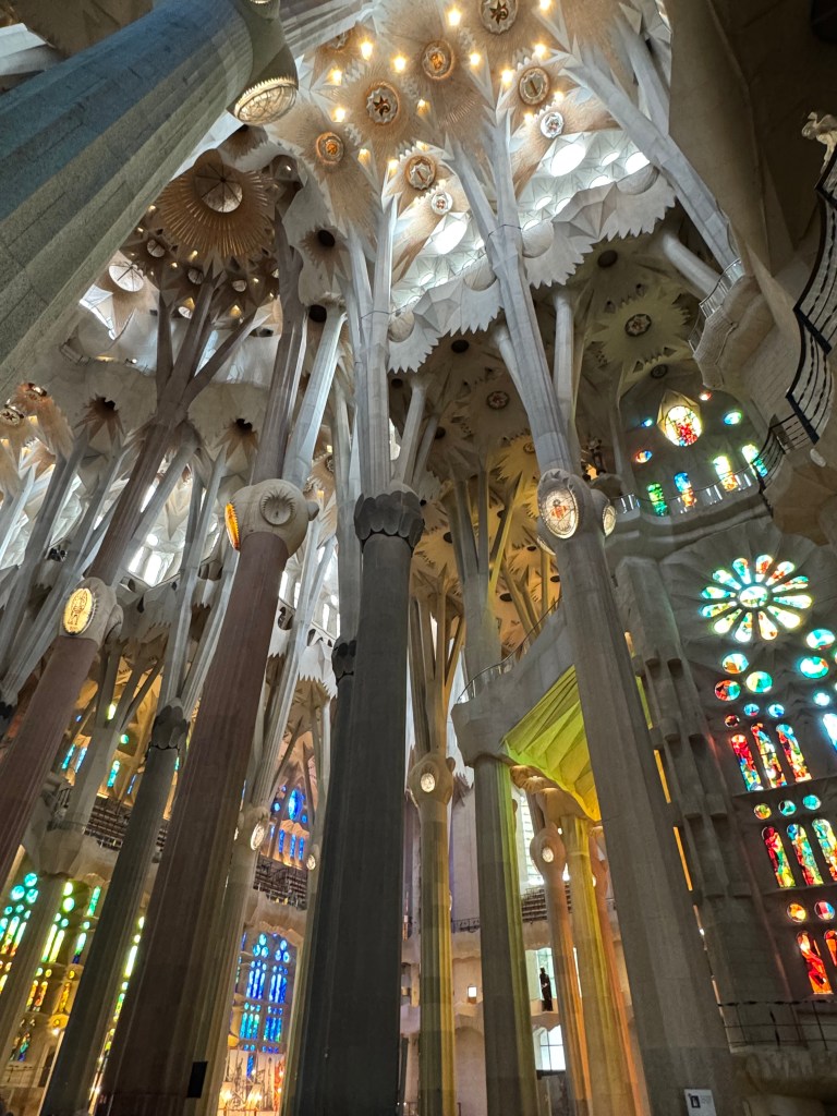 Our first excursion in the city was our tour of Sagrada Família at 10:30AM – we booked a tour that included a guided walk of the interior followed by a visit to one of the towers. After a quick breakfast at Little Croffee including a delicious pistachio latte, we got to the church (fun fact – it is NOT a cathedral because it doesn’t hold the seat of the local bishop) and I was astounded by how many people there were waiting to get in – thank goodness we got our tickets ahead of time! We received an audio headset so we could hear our guide as we walked through the church, which was the weirdest and most modern place of religion I’ve ever experienced. A summary of what we learned: