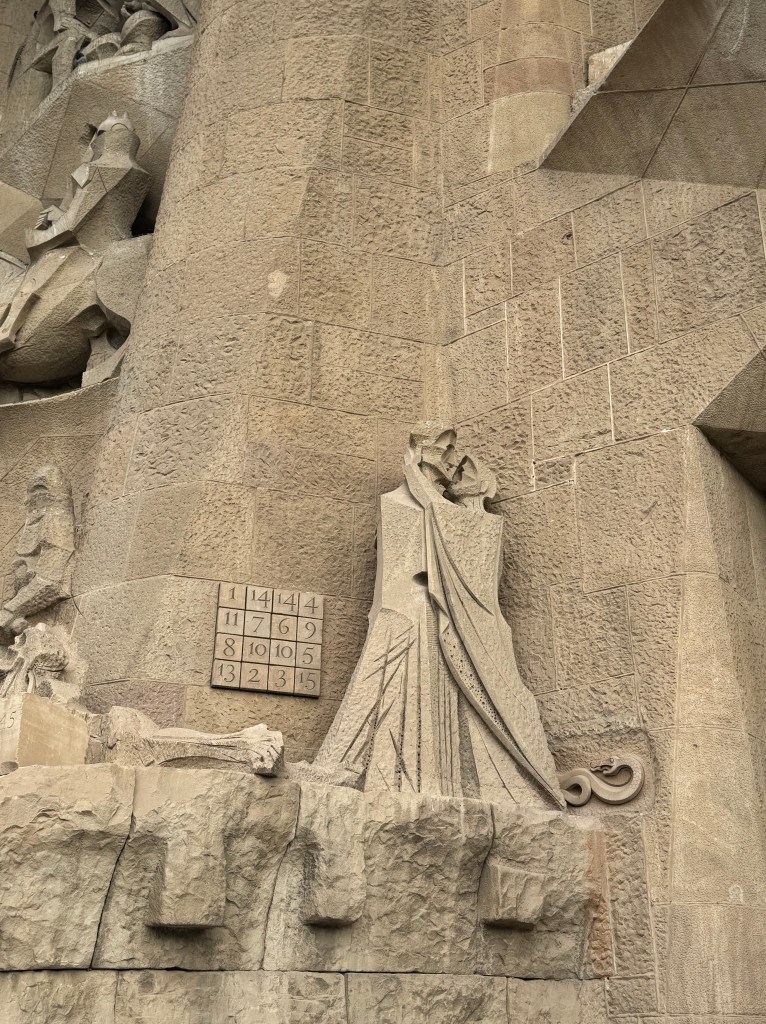 - There are three exterior facades that tell the story of Jesus Christ – Nativity, Passion and Glory. We saw the former two, and there were so many juxtapositions. The Nativity facade is full of flora and fauna, and focuses on the organic elements surrounding Christ’s birth; conversely, the Passion facade is meant to depict the death of Jesus Christ, and all of the statues are blocky and very modern. There’s just so much symbology everywhere you look. For example, on the Passion facade, there’s a magic square (think sudoku board) that sums up to 33 in all directions, or the age of Jesus at crucifixion.