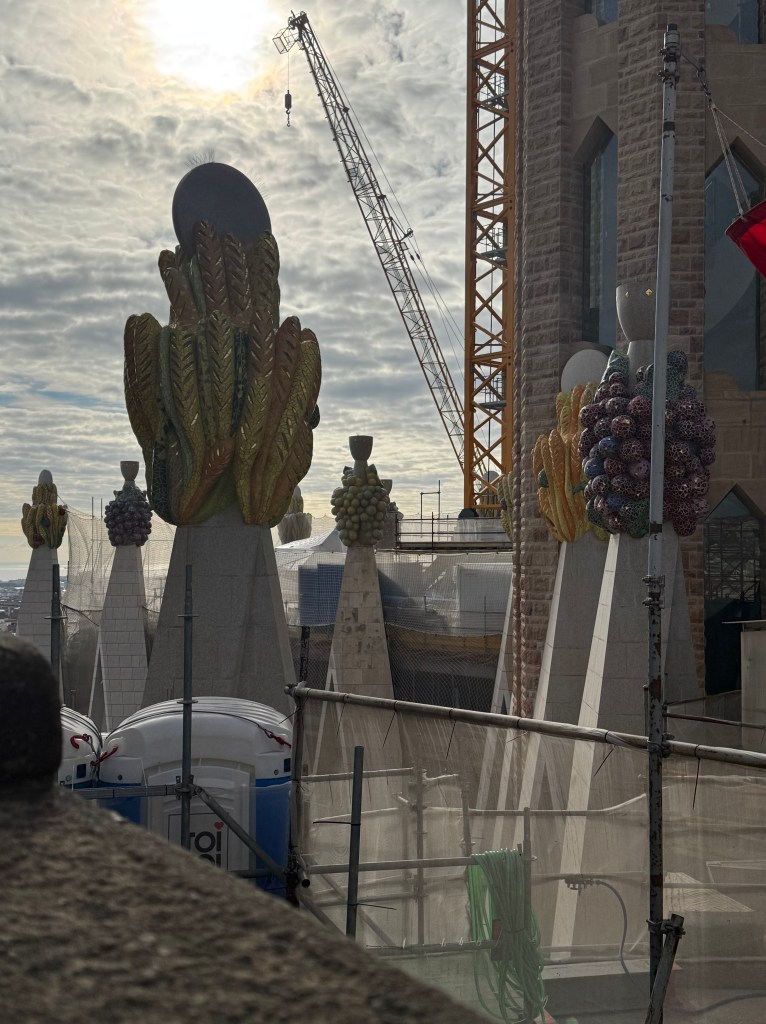 I especially loved all of the stained glass in the church – there is a rhyme and reason to the different cool vs. warm colors used on the different sides of the church, and the windows are meant to illuminate the church in different ways throughout the day based on the position of the sun. After walking through the interior of the church, Gaudi’s school outside, and the exterior of the facades, we went to the elevator to ride up to the Nativity Tower for our 12PM slot. We essentially took the elevator up, walked along the walkway to another tower, and then walked the winding staircase back down to the base of the church. It was cool to be up close to the “fruit towers” (yes, specific fruits like oranges, grapes and cherries representing various seasons) and see other various oddities on different parts on the tower.