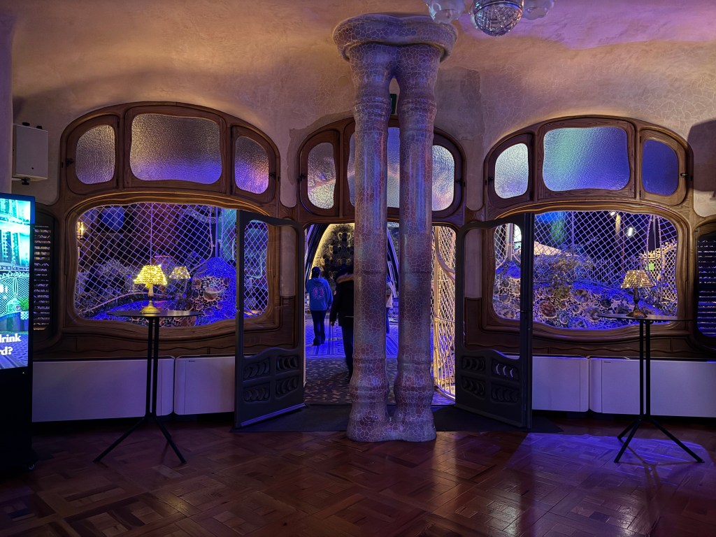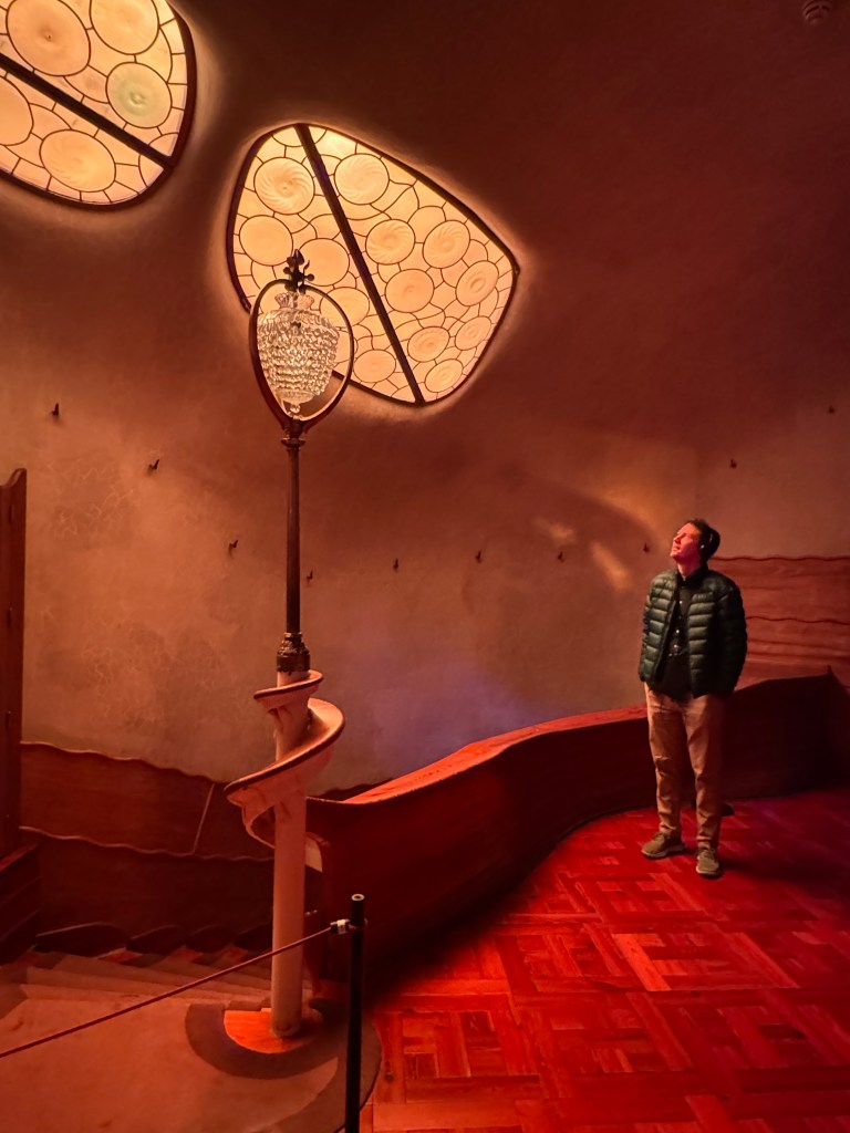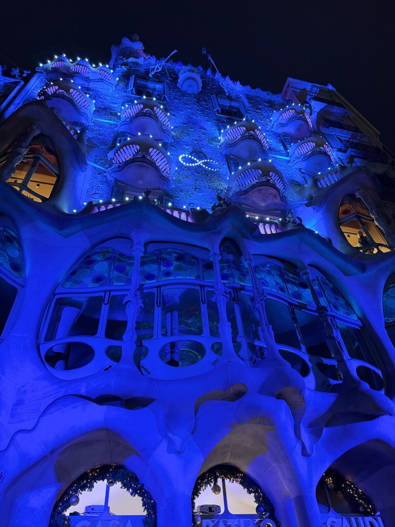 We walked the short distance to Casa Batlló for our 6:30PM “A Winter Night” night visit – an immersive tour of the UNESCO World Heritage site complete with special lighting, projections and an AI tablet. Each night during the holiday season, the house has a light show on the exterior facade where people can go and watch for ~ 5 minutes – I didn’t realize how publicly located this house was, nor that an actual family lived here at some point (and brought Gaudí in to design it!). More specifically, homeowner Josep Batlló gave Antoni Gaudí complete creative freedom to transform his family’s house. Instead of demolishing it, Gaudí completely transformed the façade and created a true work of art on the interior – see below!